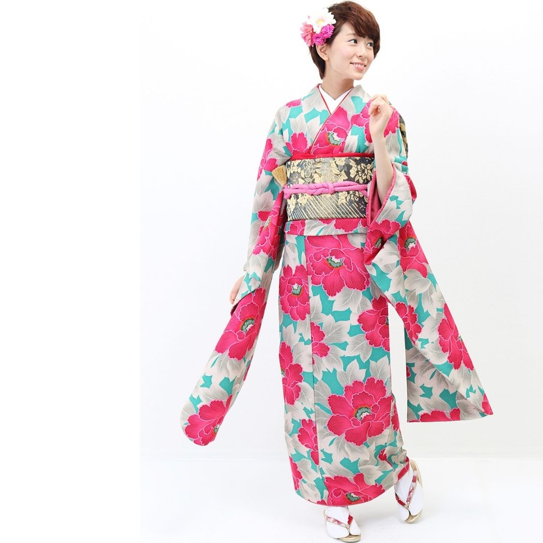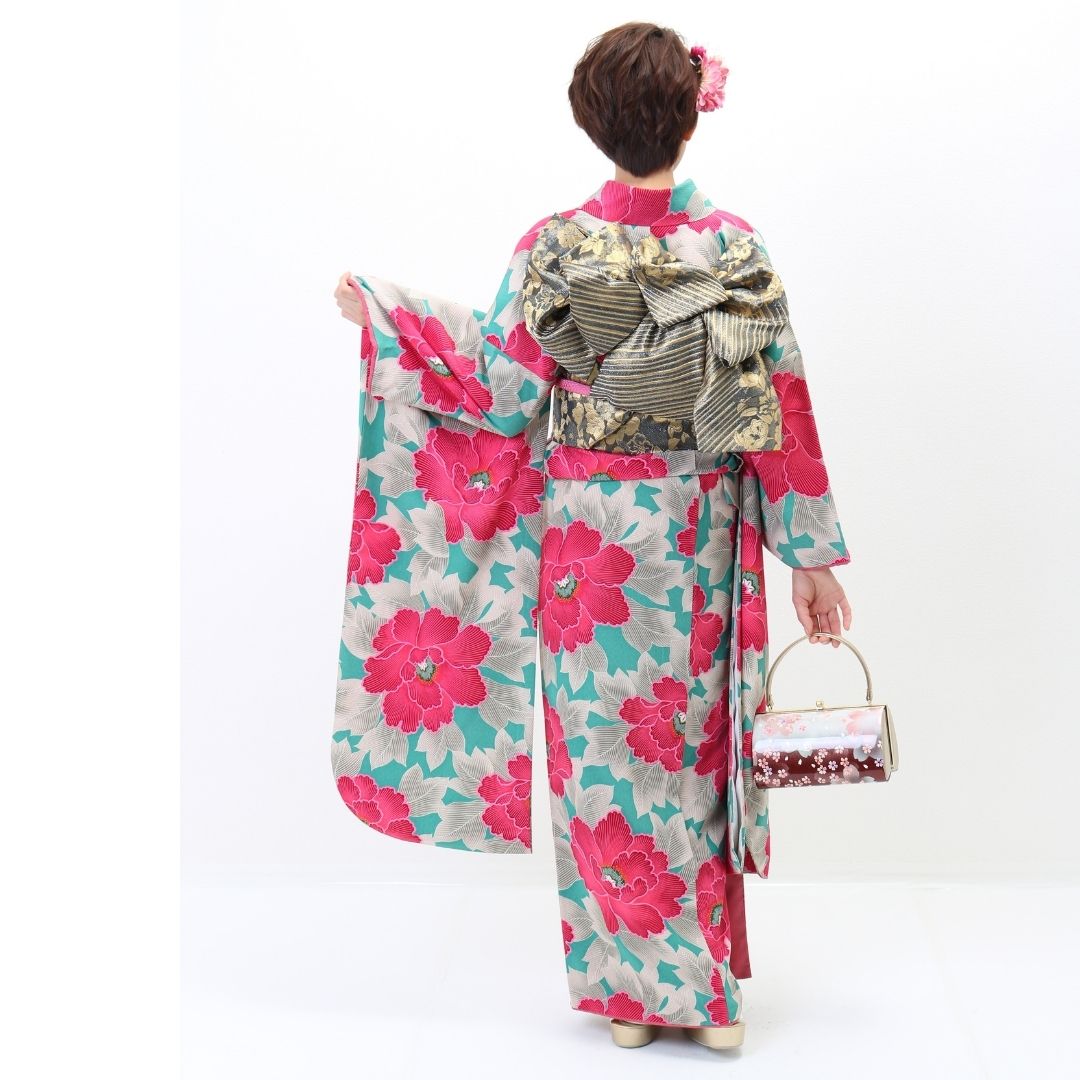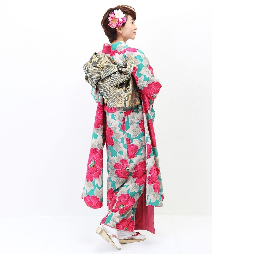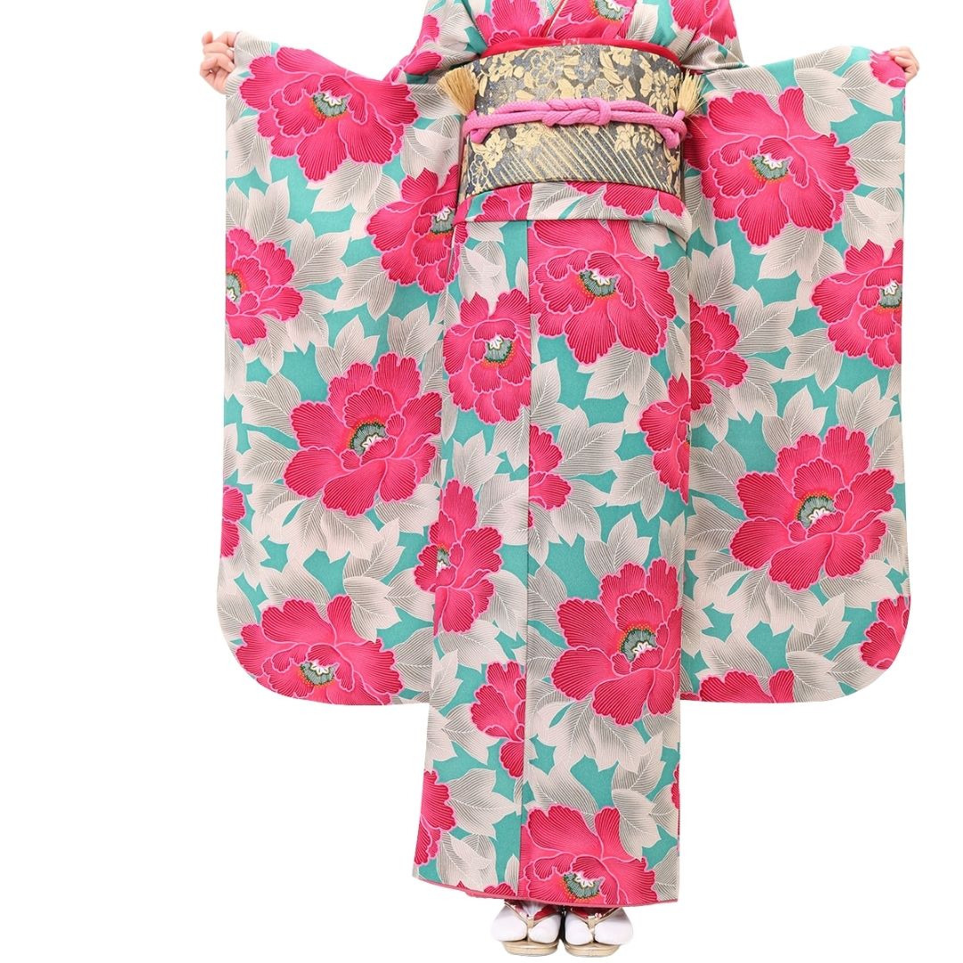 【対応身長150cm~165cm】【レトロ・アンティーク】【合繊】成人式レンタル振袖フルセット-242 花柄 レトロ クール系 ポップキュート ピンク系 水色系 緑系 牡丹 総柄