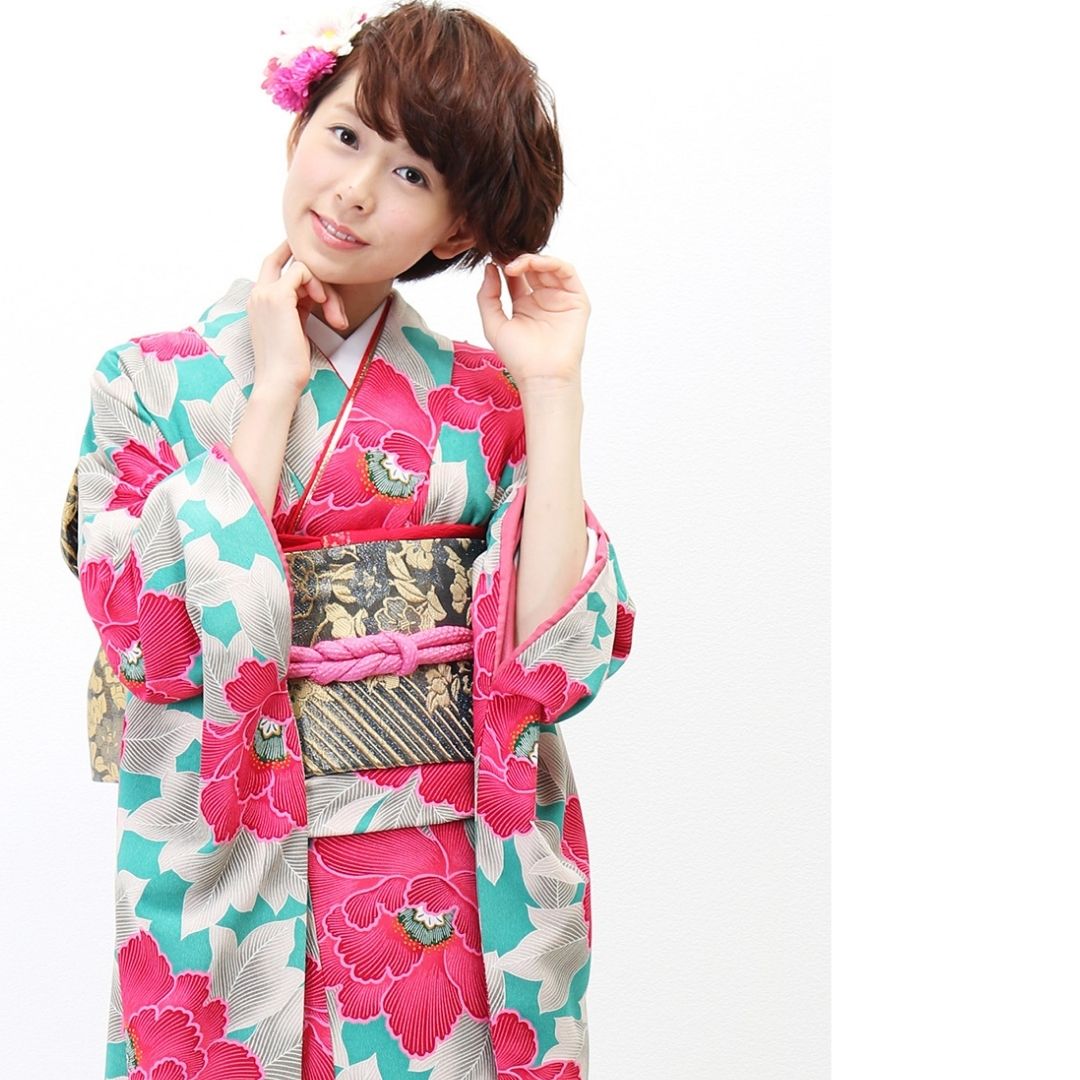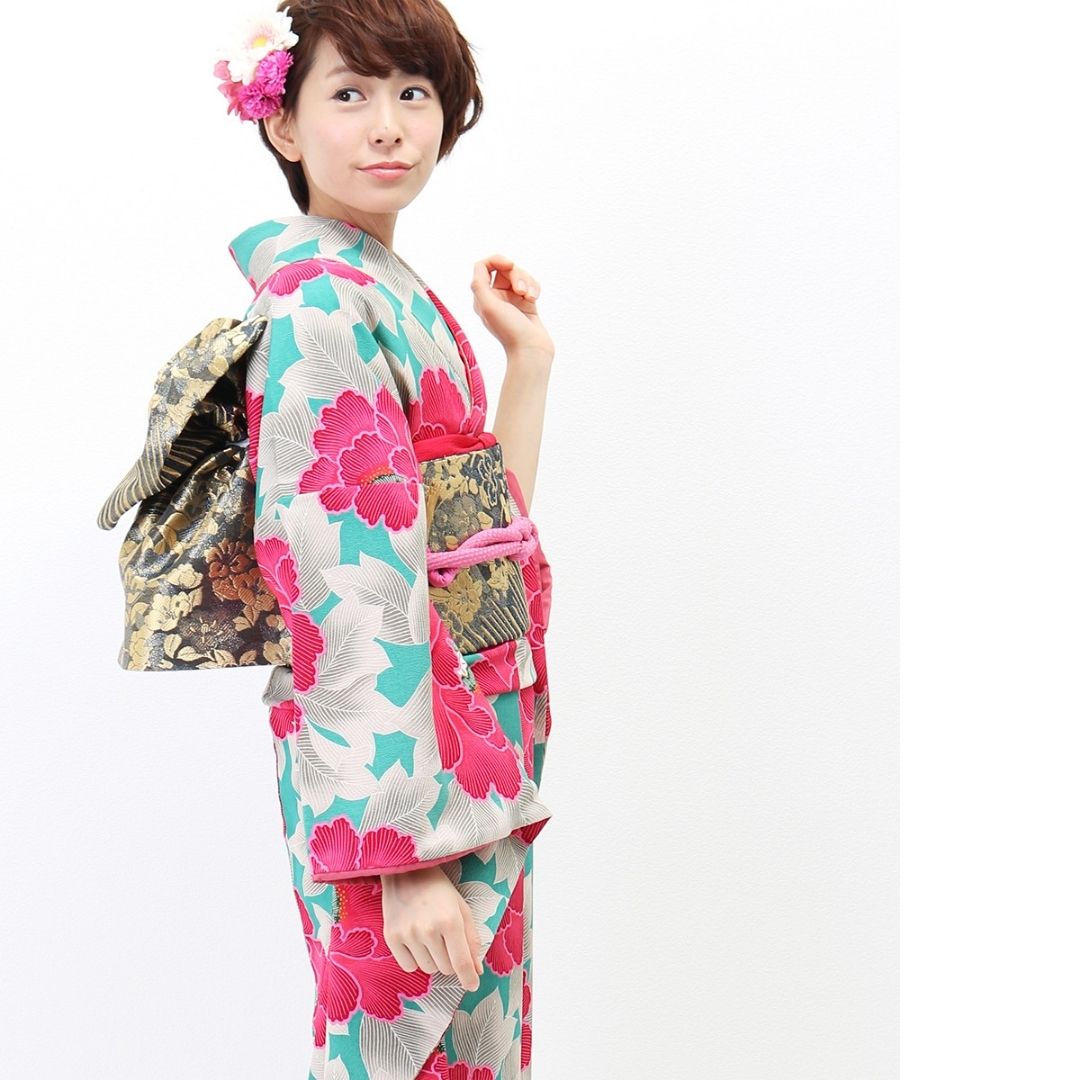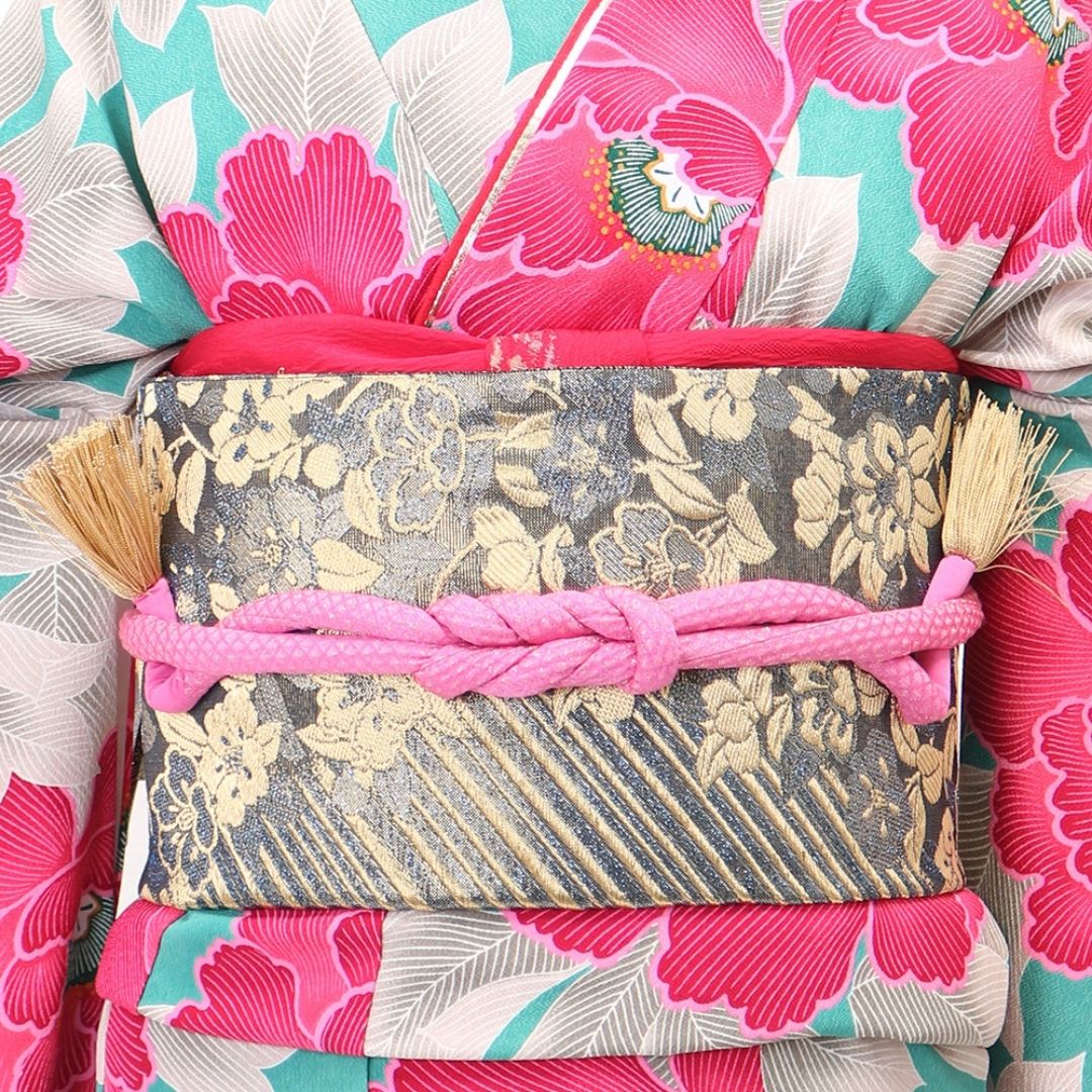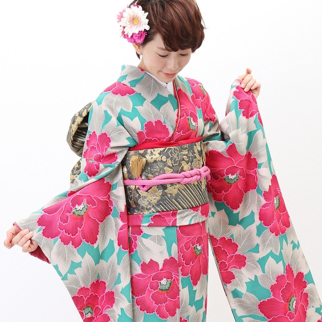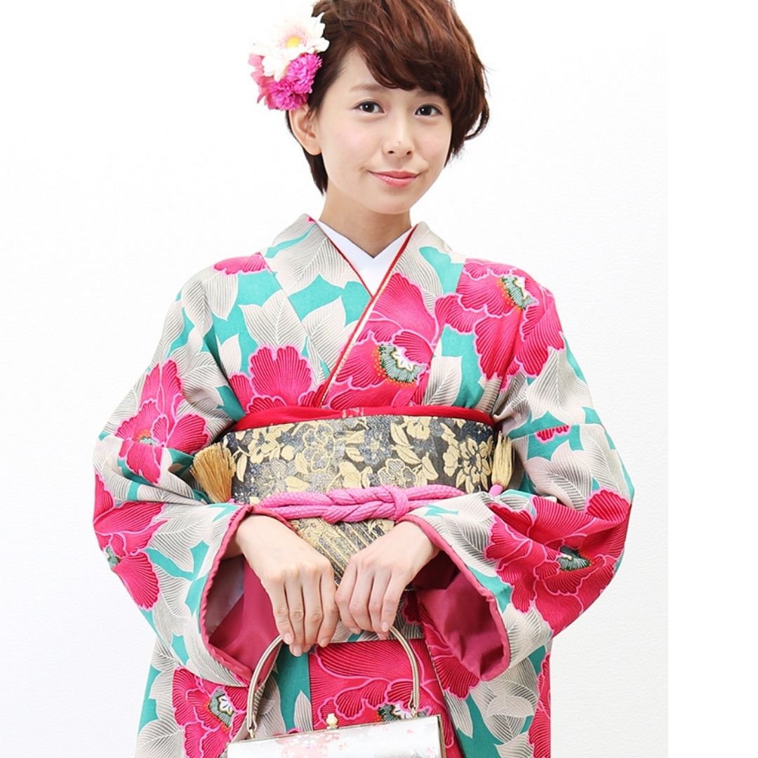 【対応身長150cm~165cm】【レトロ・アンティーク】【合繊】成人式レンタル振袖フルセット-242 花柄 レトロ クール系 ポップキュート ピンク系 水色系 緑系 牡丹 総柄