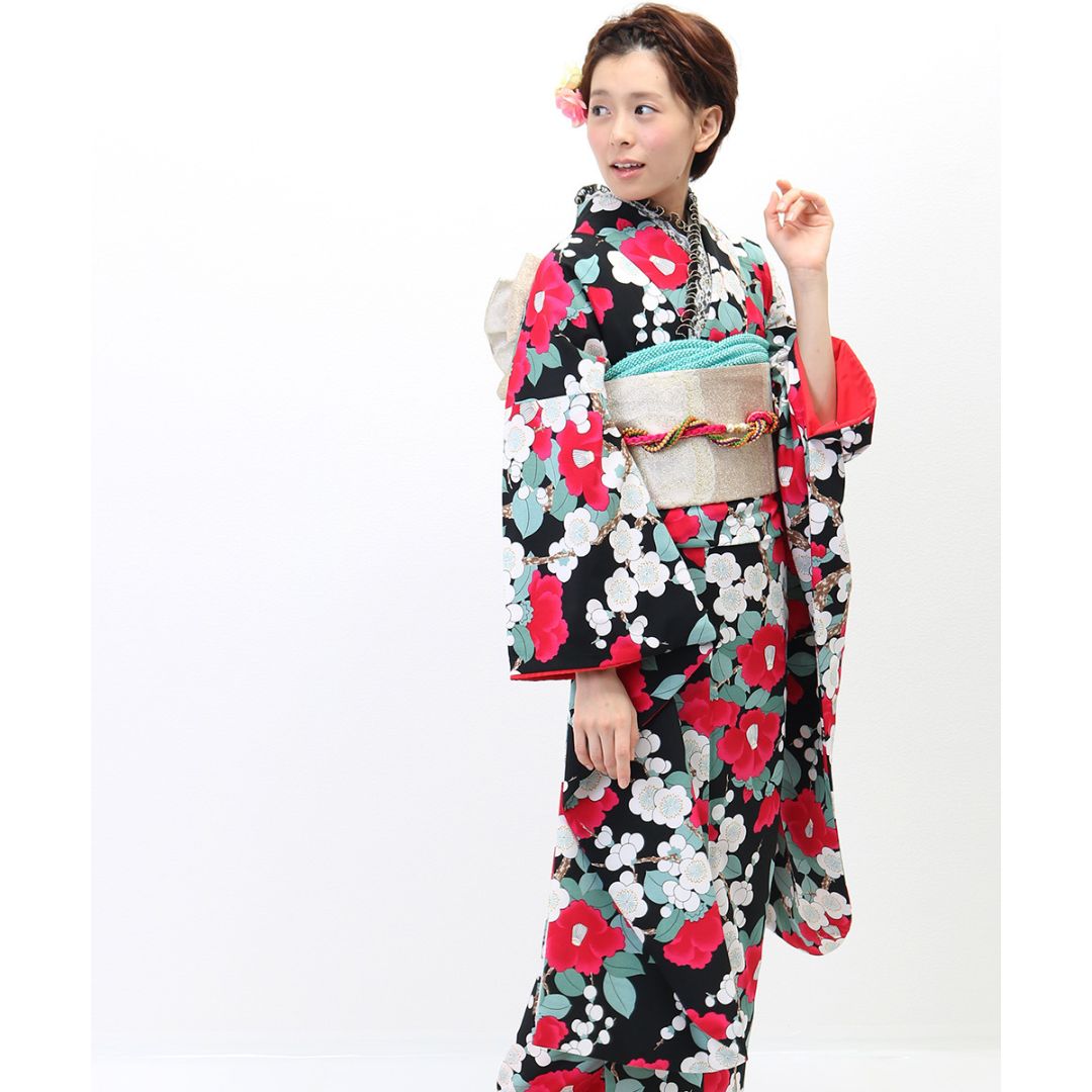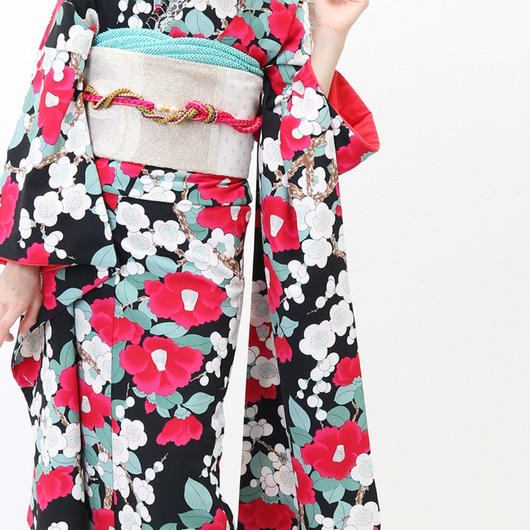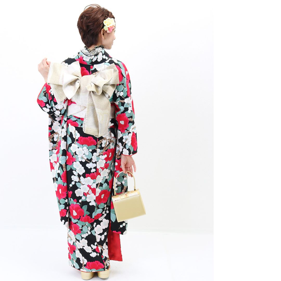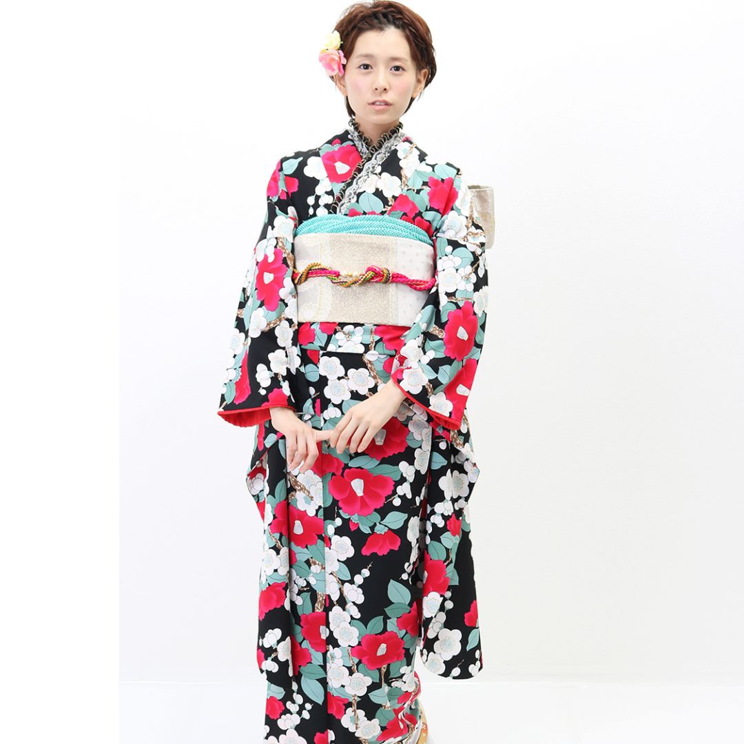 【対応身長150cm~165cm】【レトロ・アンティーク】【合繊】成人式レンタル振袖フルセット-243 花柄 レトロ クール系 ポップキュート ピンク系 黒系 椿 総柄 岡重