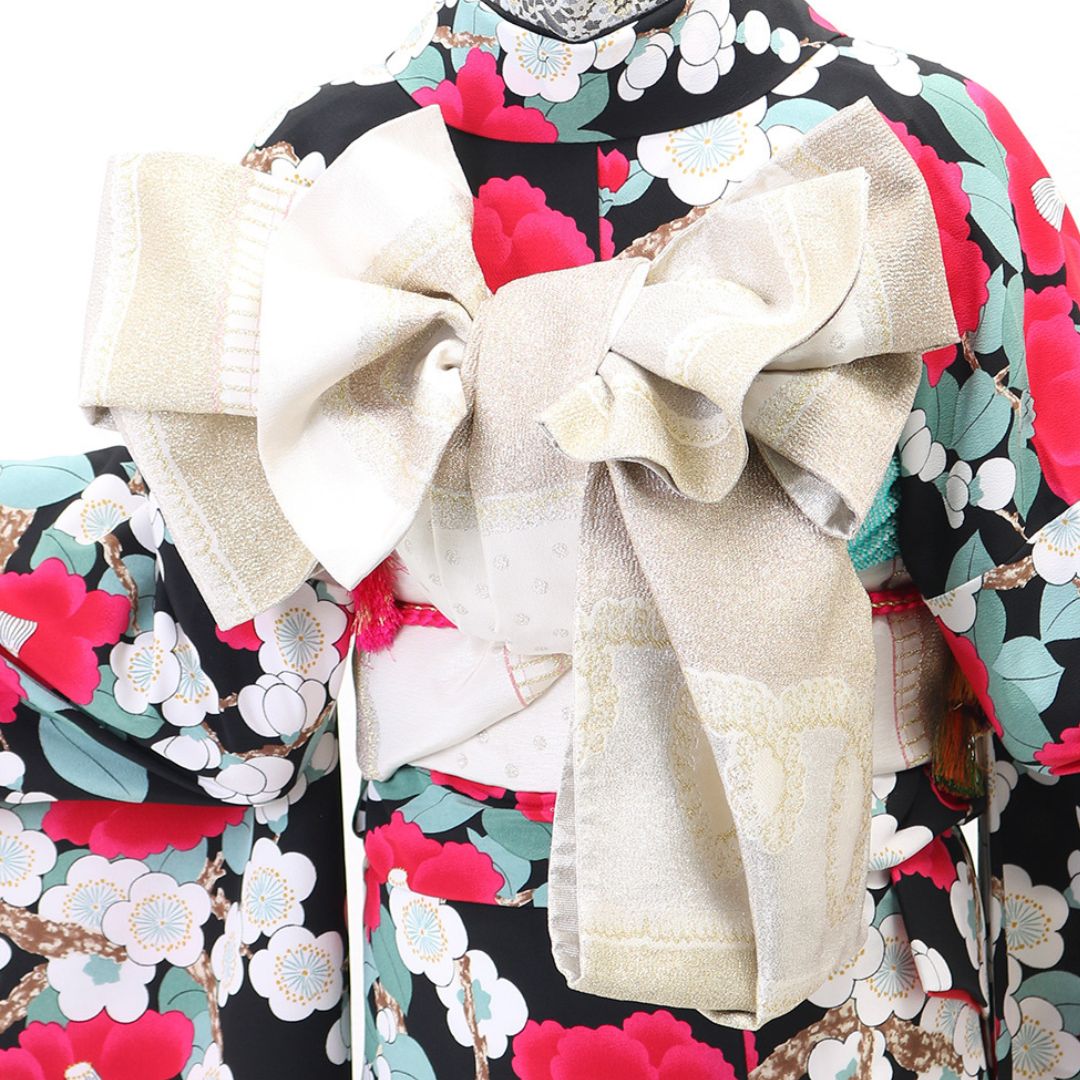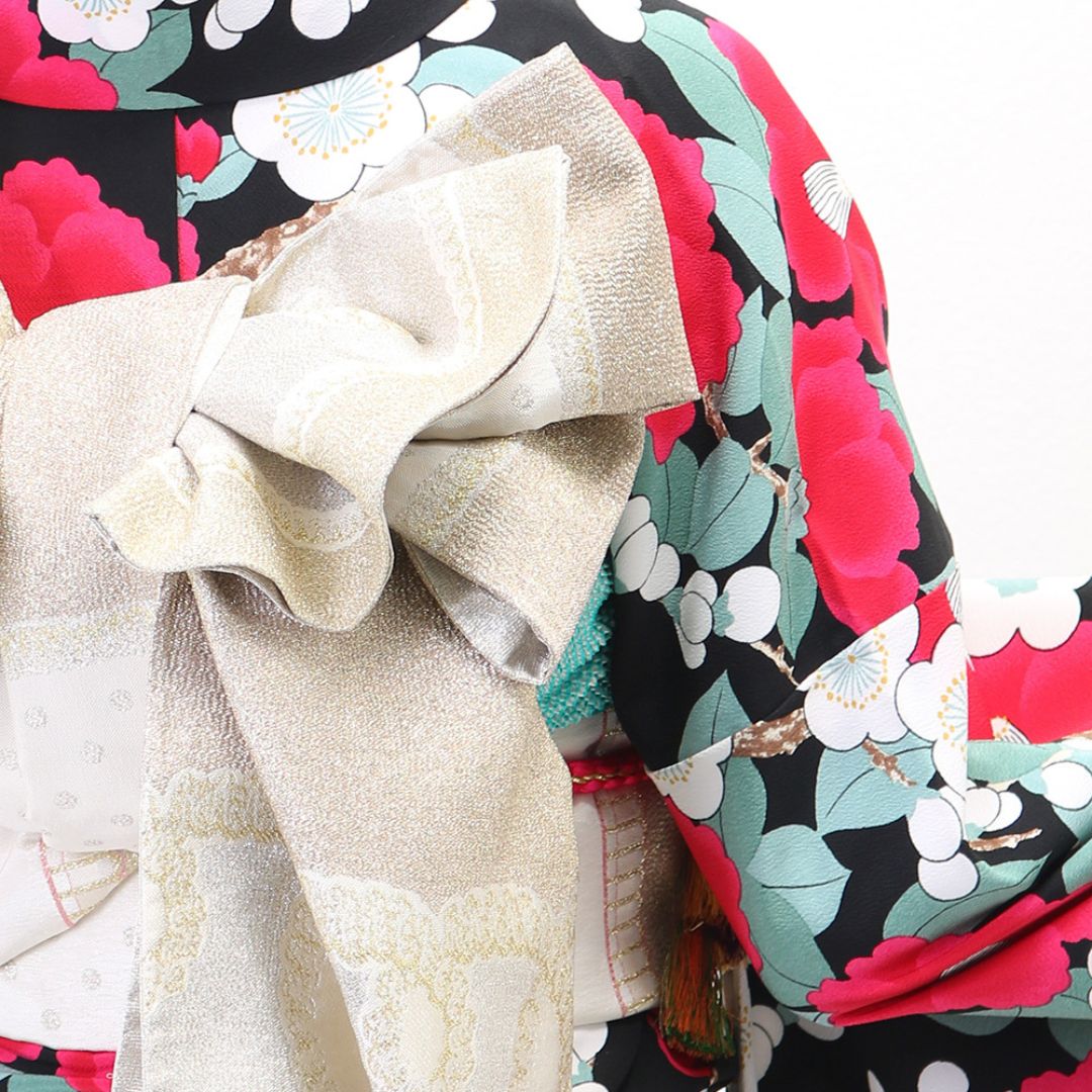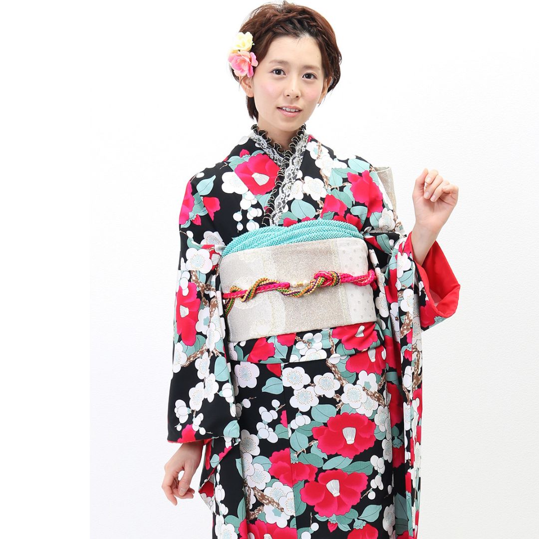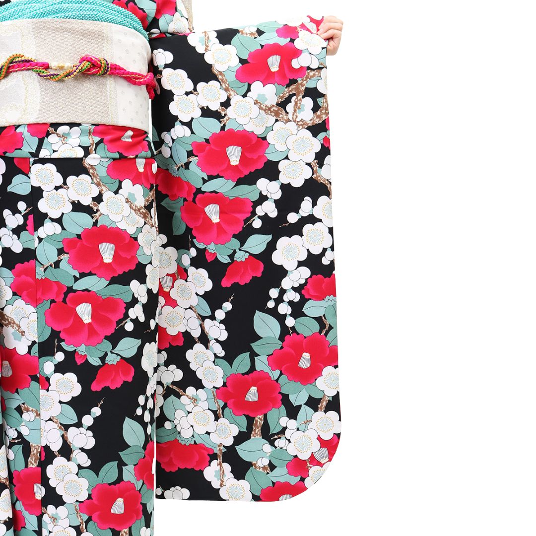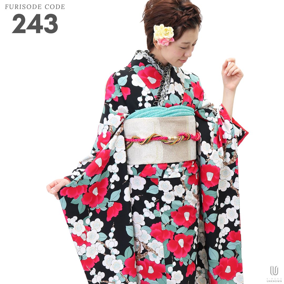 【対応身長150cm~165cm】【レトロ・アンティーク】【合繊】成人式レンタル振袖フルセット-243 花柄 レトロ クール系 ポップキュート ピンク系 黒系 椿 総柄 岡重