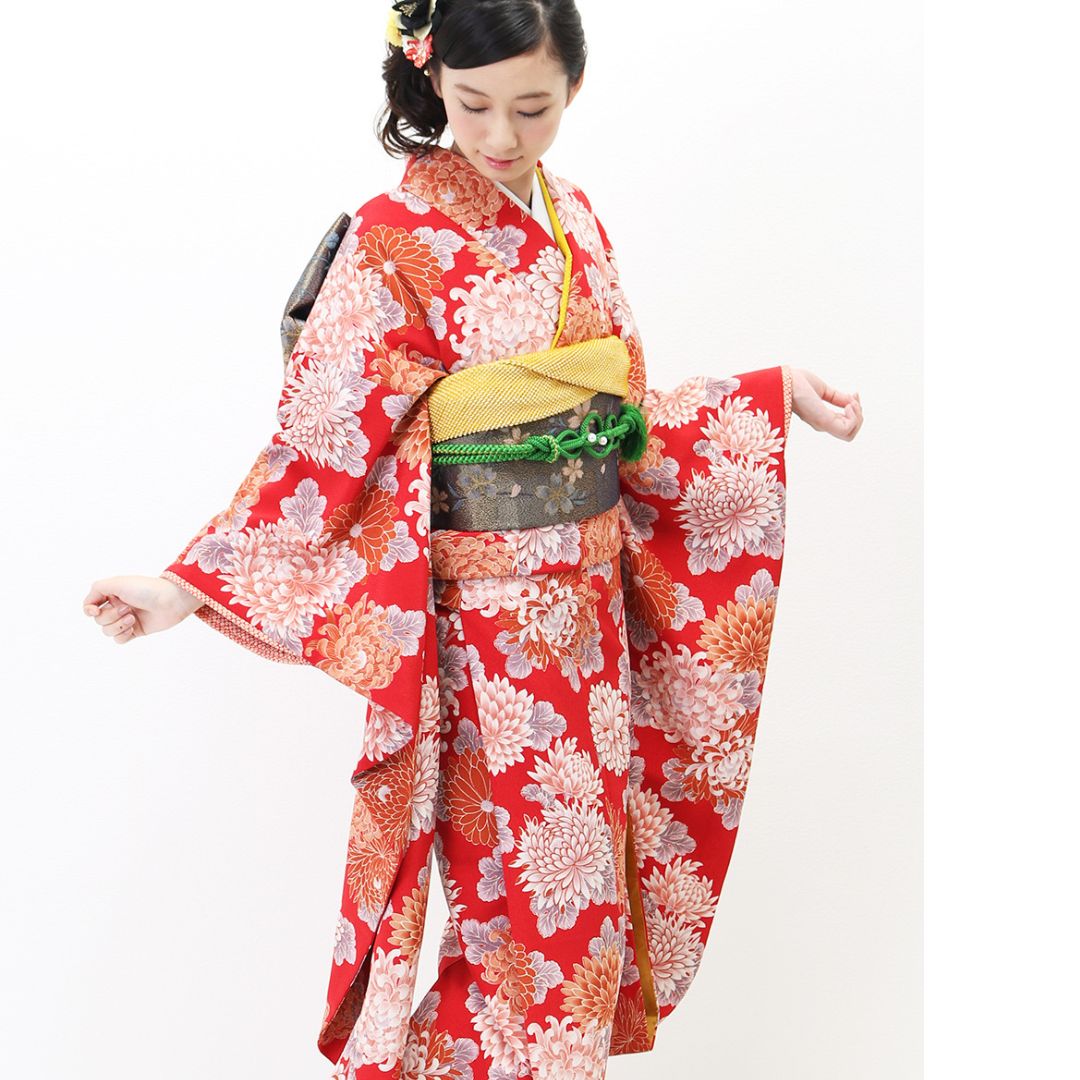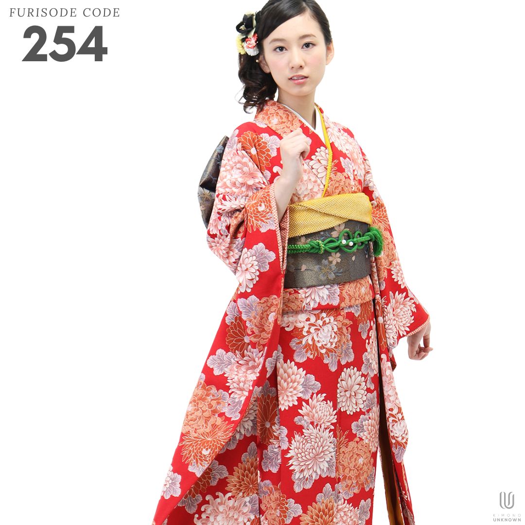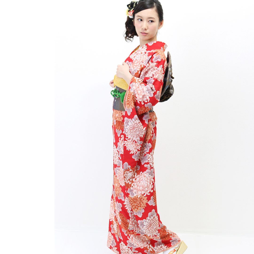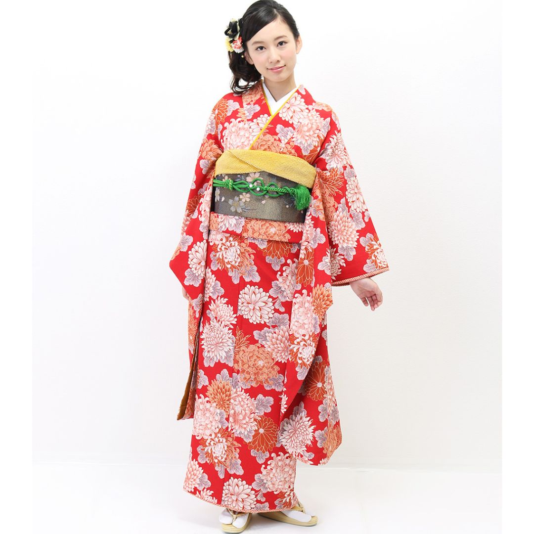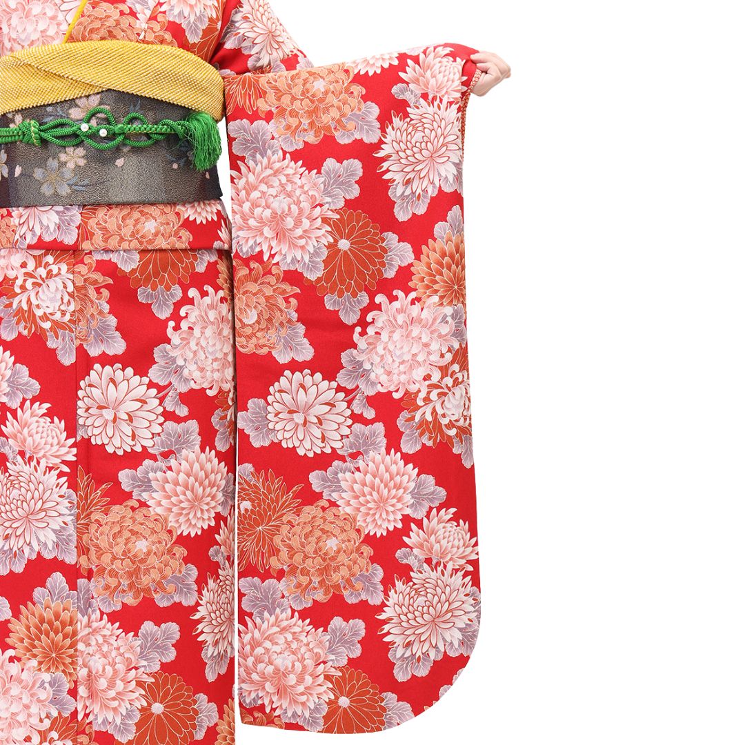 【対応身長155cm~170cm】【レトロ・アンティーク風】【合繊】成人式レンタル振袖フルセット-254 花柄 レトロ クール系 ポップキュート 赤系 オレンジ系 菊 総柄