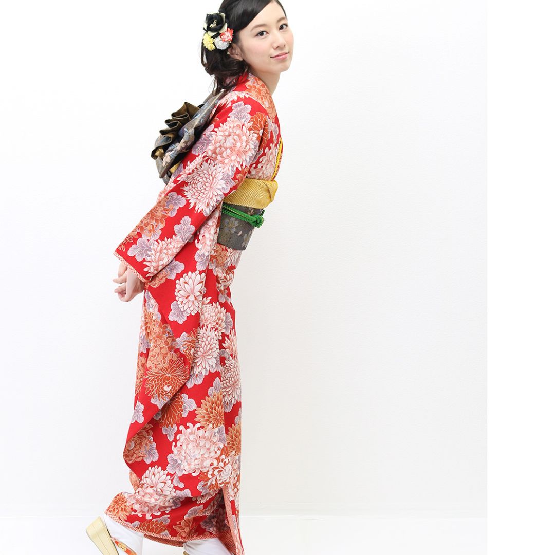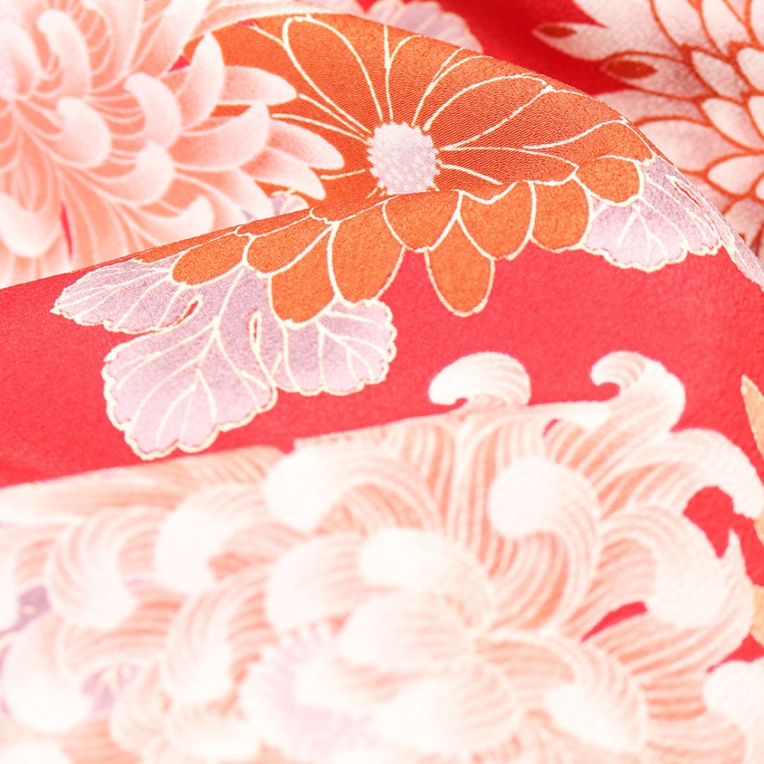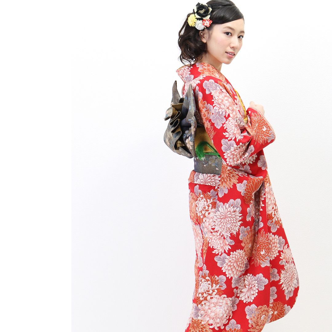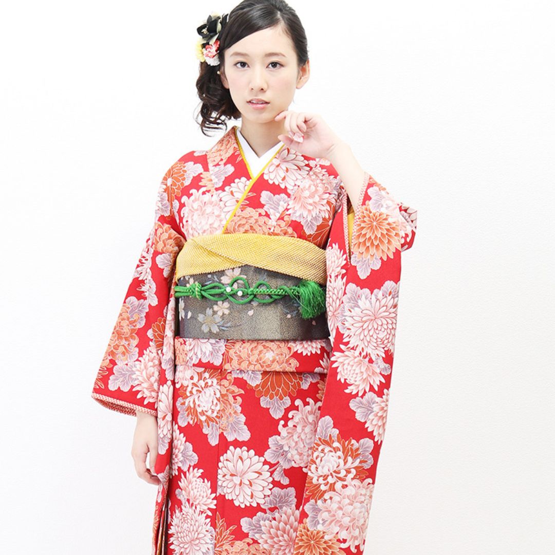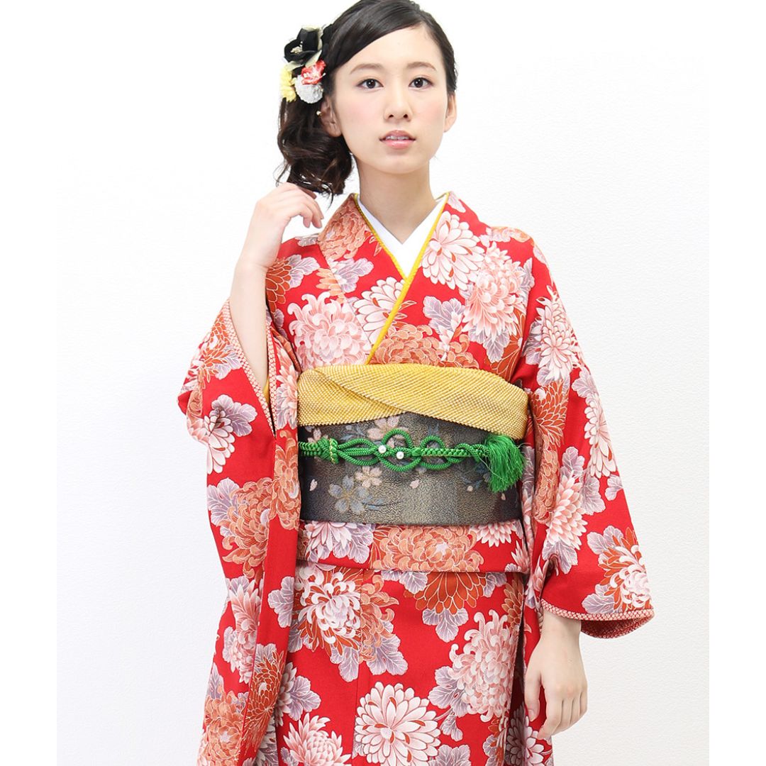 【対応身長155cm~170cm】【レトロ・アンティーク風】【合繊】成人式レンタル振袖フルセット-254 花柄 レトロ クール系 ポップキュート 赤系 オレンジ系 菊 総柄