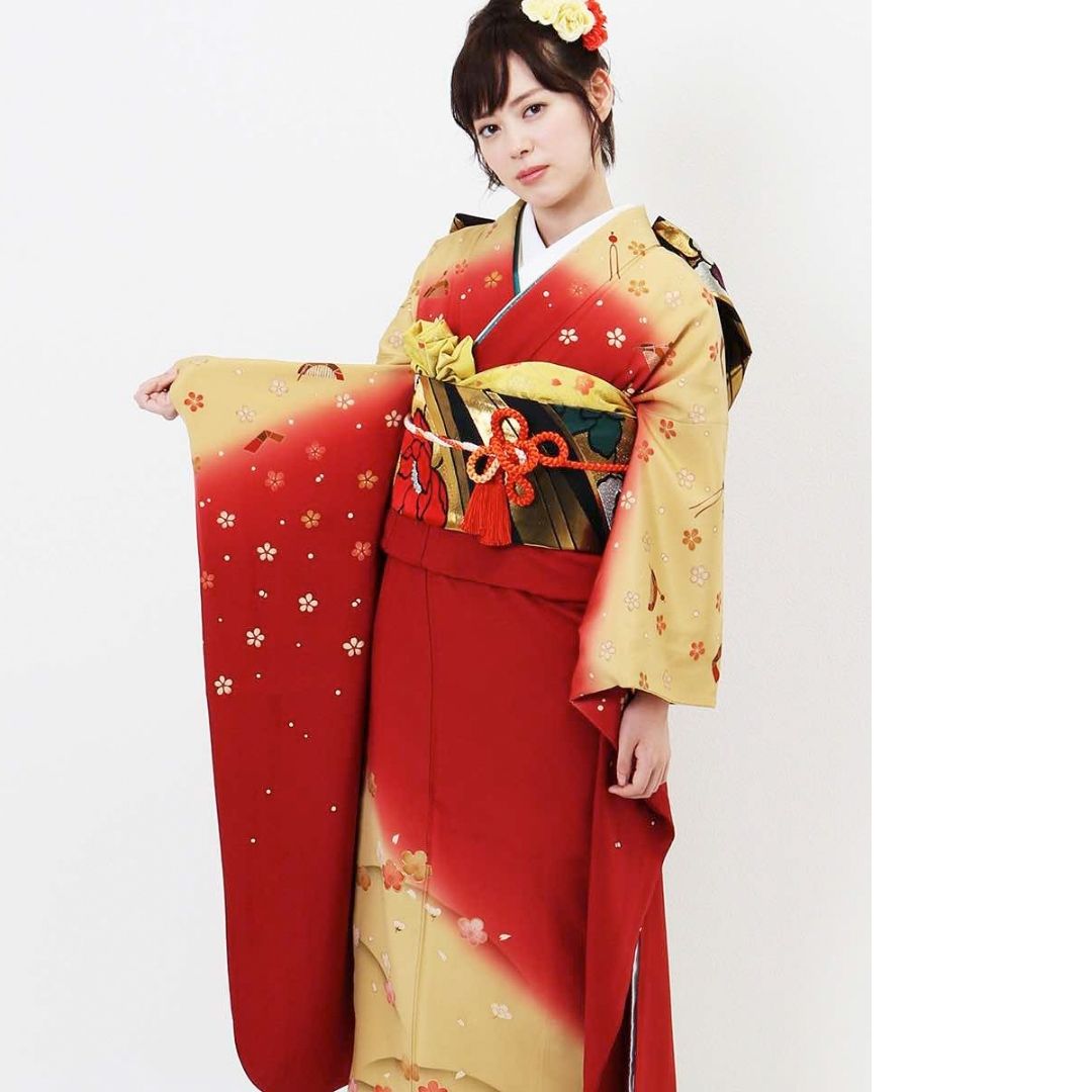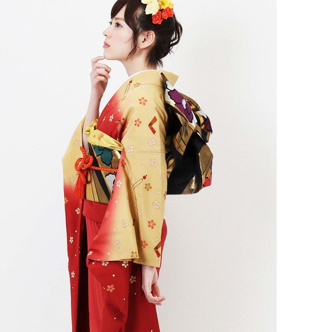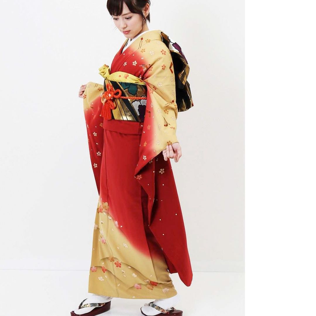 【対応身長155cm~170cm】【ポップ・キュート】【正絹】成人式レンタル振袖フルセット-301 花柄 レトロ クール系 定番 古典 オレンジ系 赤系 黄色系 桜