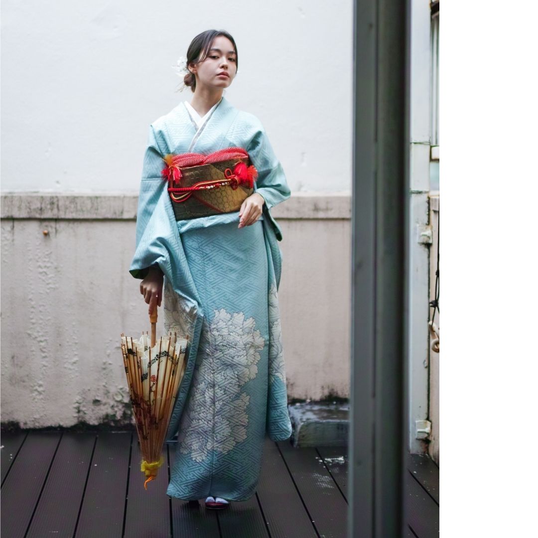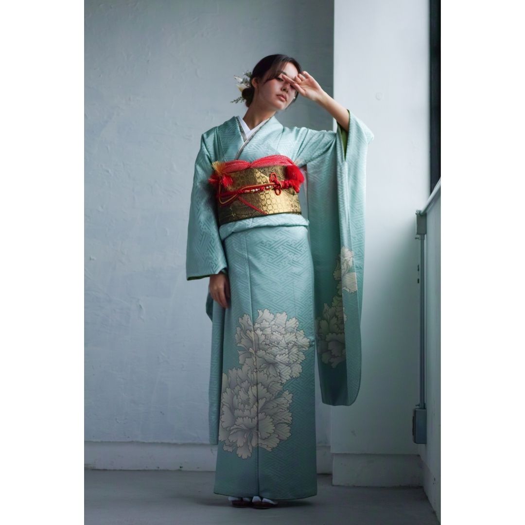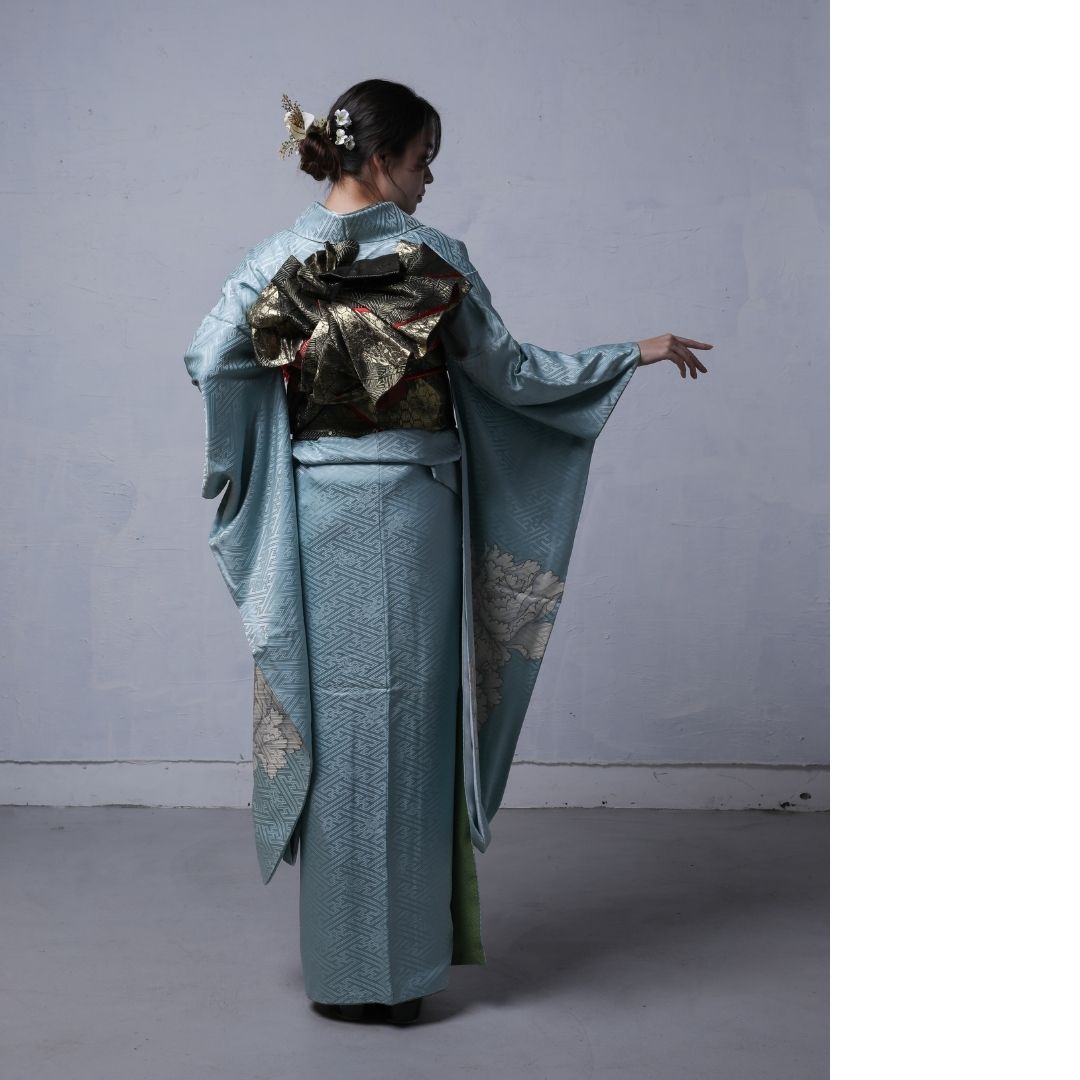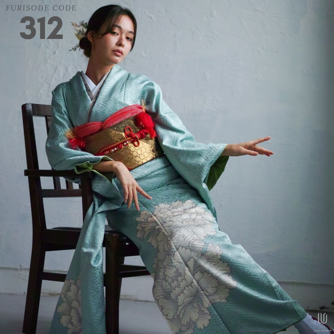 【対応身長155cm~170cm】【クール・モダン】【正絹】成人式レンタル振袖フルセット-312 花柄 レトロ クール系 古典 水色系 白系 牡丹 紗綾形 綸子 コシノジュンコ