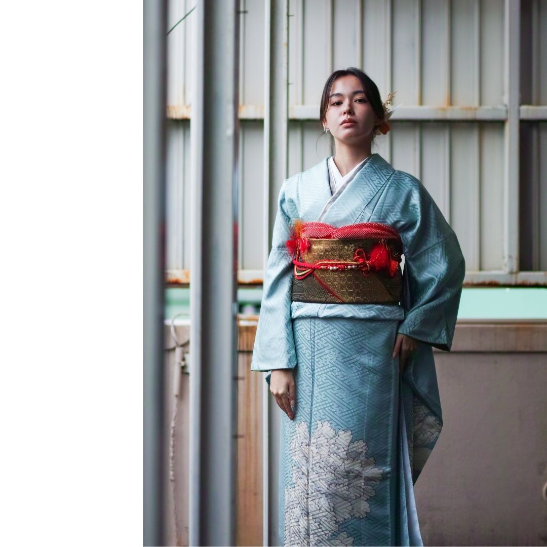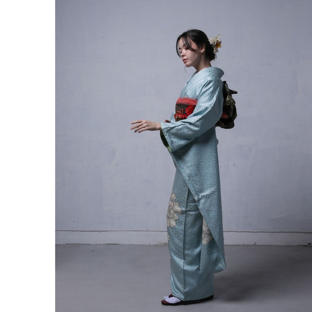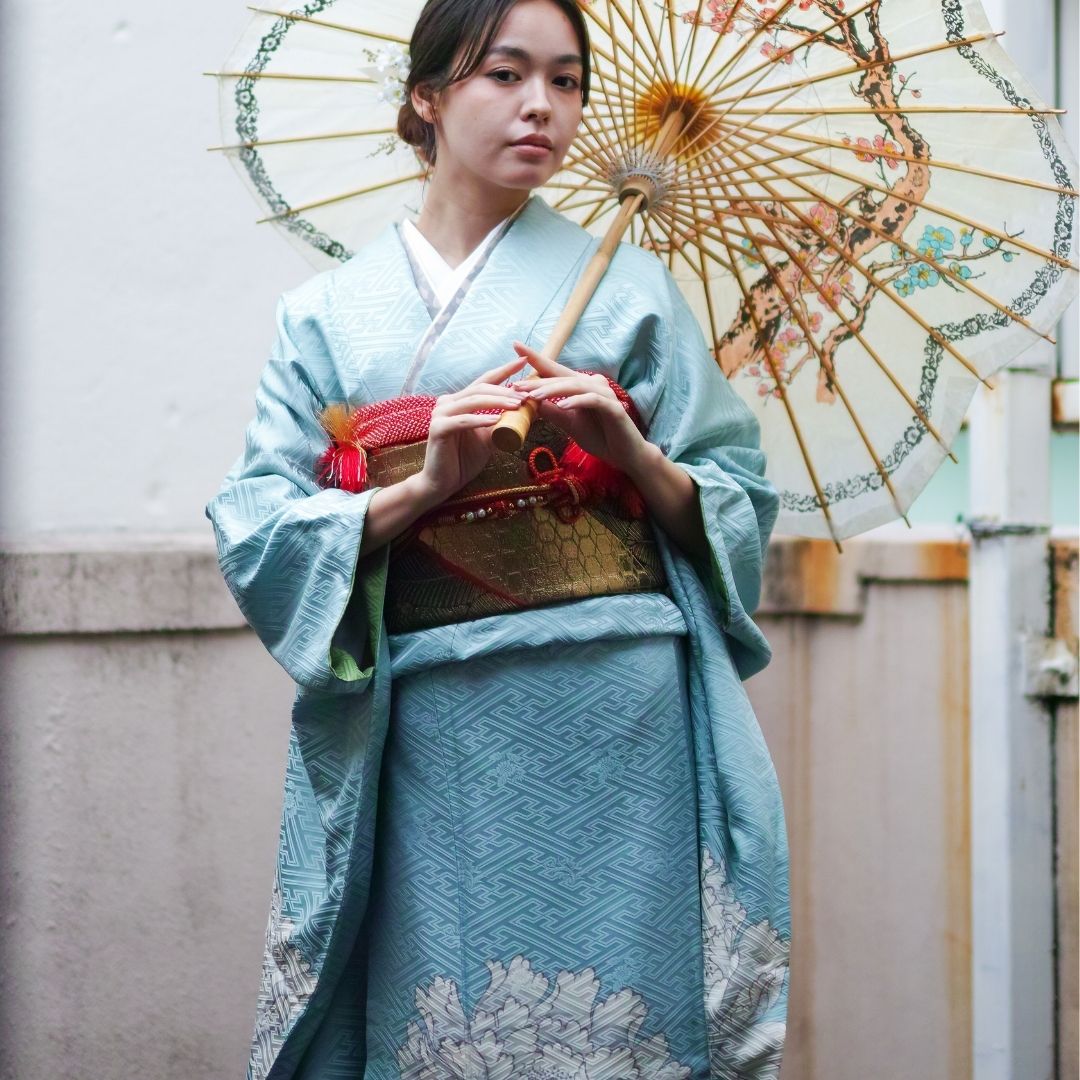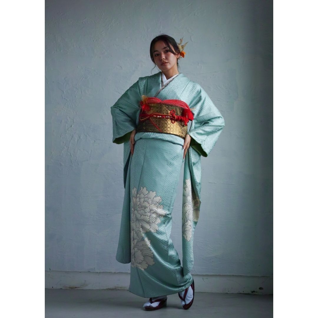 【対応身長155cm~170cm】【クール・モダン】【正絹】成人式レンタル振袖フルセット-312 花柄 レトロ クール系 古典 水色系 白系 牡丹 紗綾形 綸子 コシノジュンコ