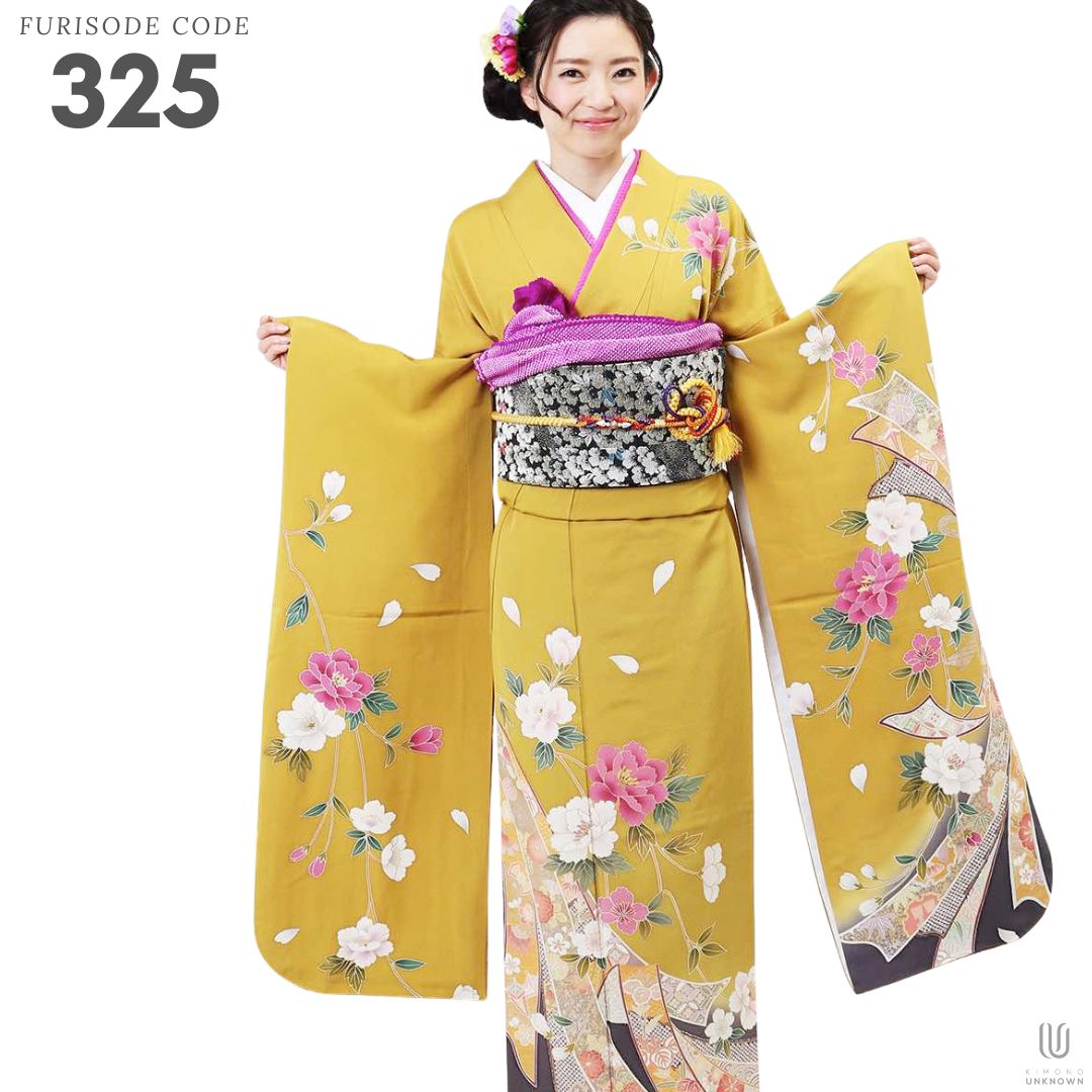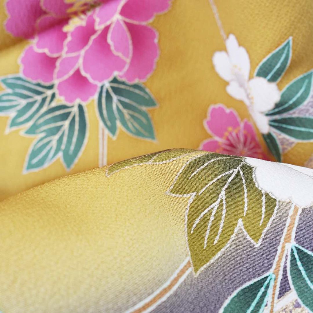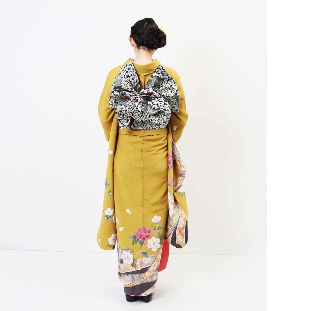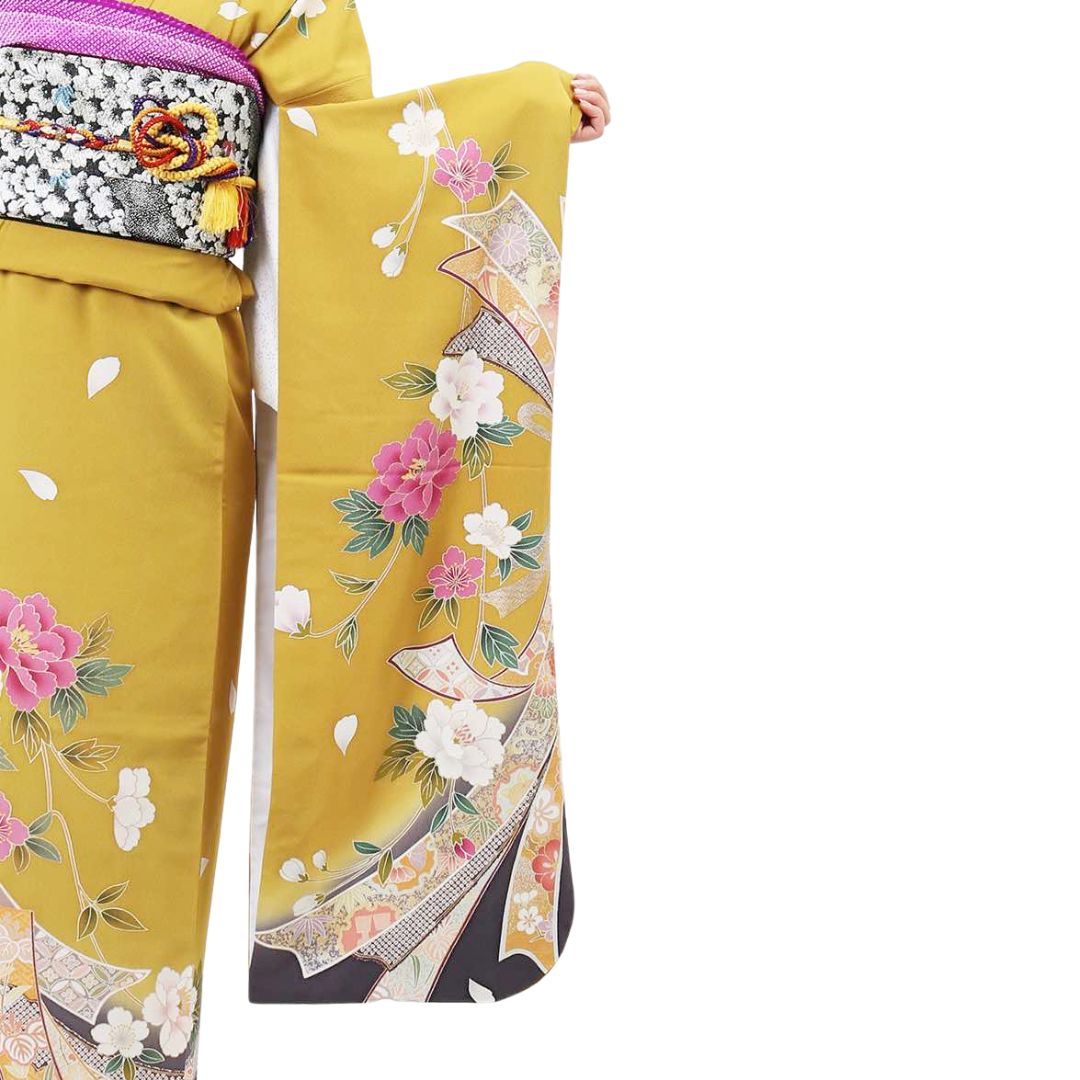 【対応身長155cm~170cm】【ポップ・キュート】【正絹】成人式レンタル振袖フルセット-325 花柄 クール系 定番 古典 ポップキュート 黄色系 グレー系 牡丹 束ね熨斗