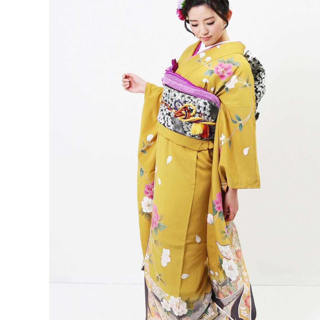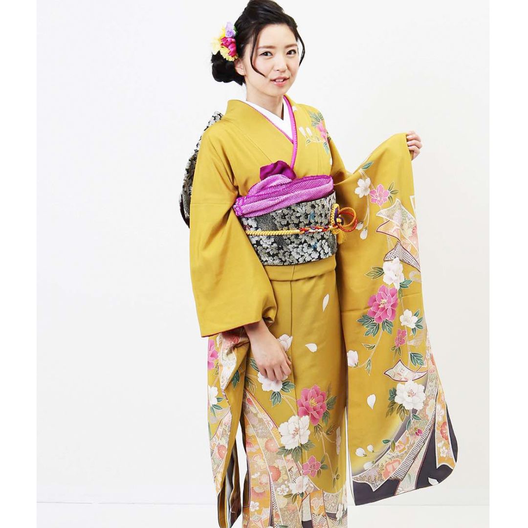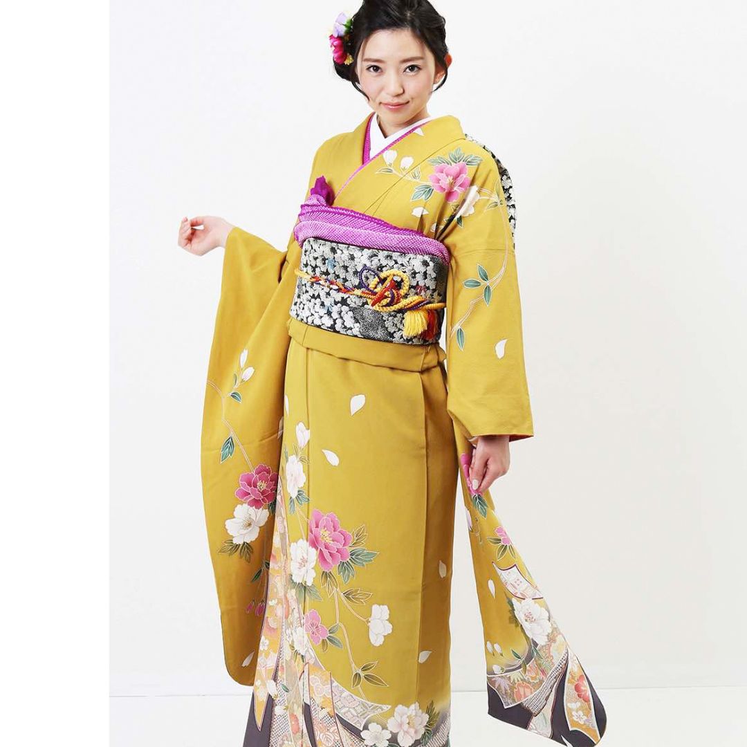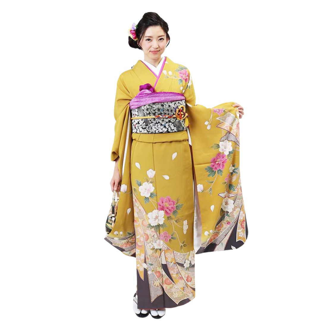 【対応身長155cm~170cm】【ポップ・キュート】【正絹】成人式レンタル振袖フルセット-325 花柄 クール系 定番 古典 ポップキュート 黄色系 グレー系 牡丹 束ね熨斗
