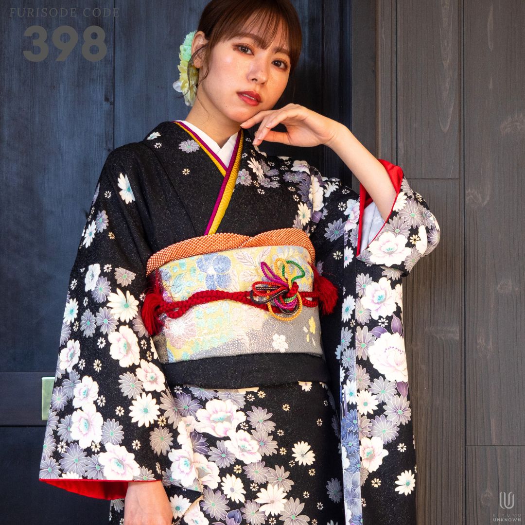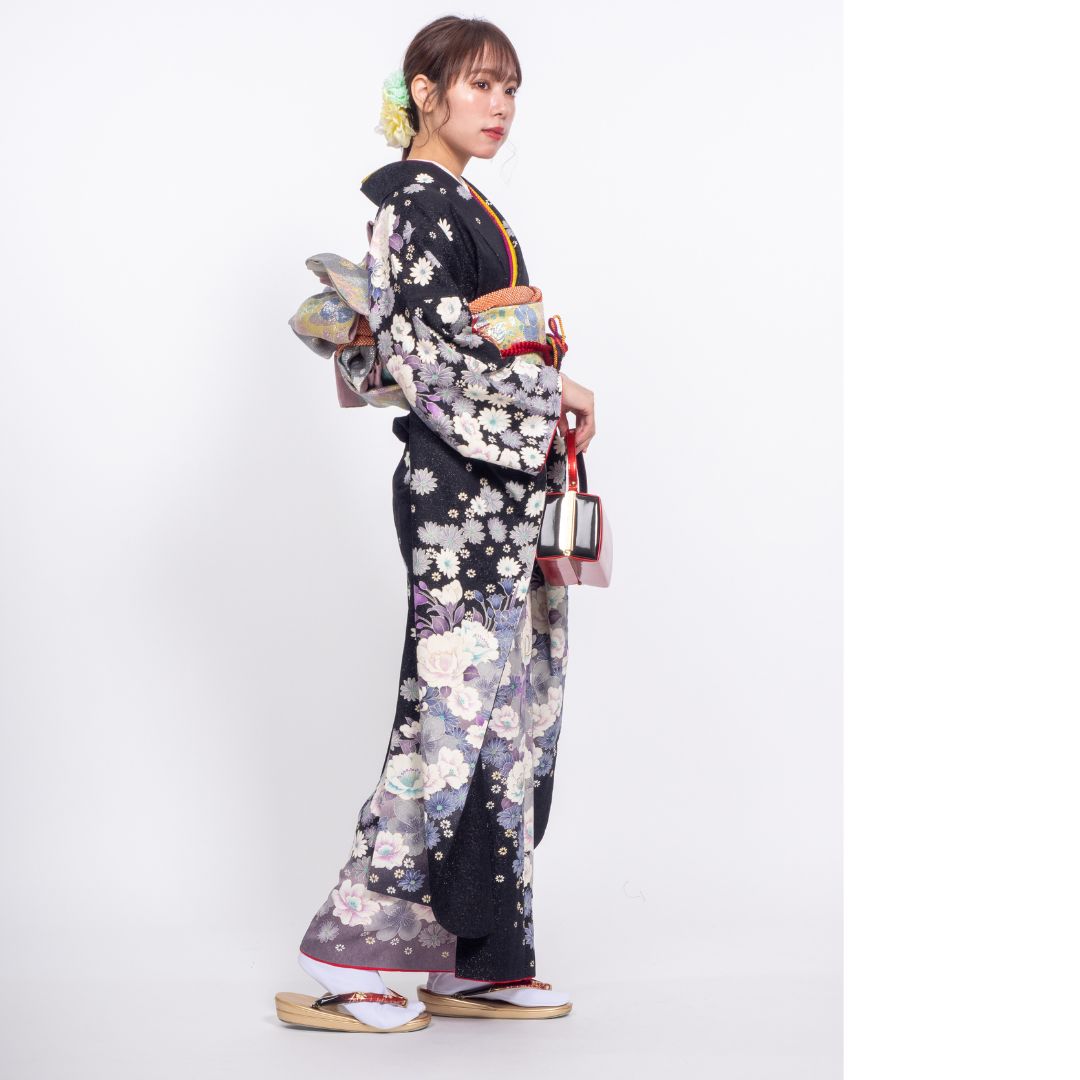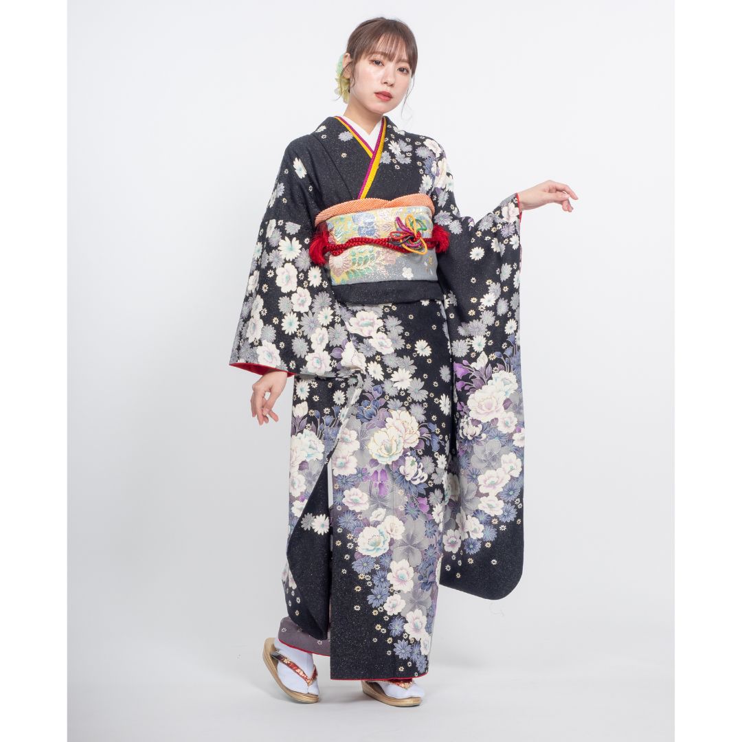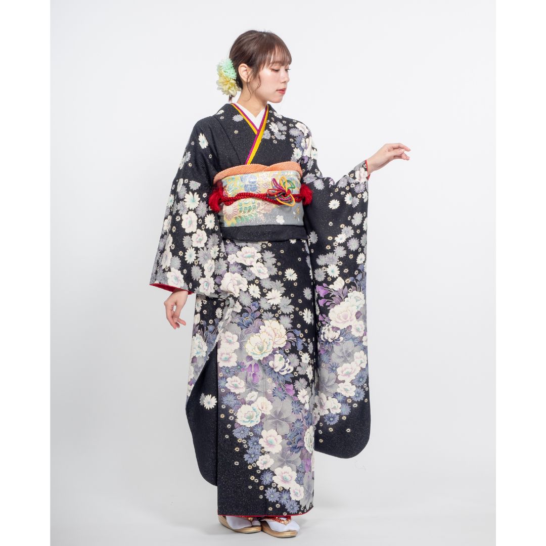 【対応身長155cm~170cm】【クール・モダン】【正絹】成人式レンタル振袖フルセット-398 花柄 クール系 定番 ポップキュート 黒系 紫系 洋花 豪華
