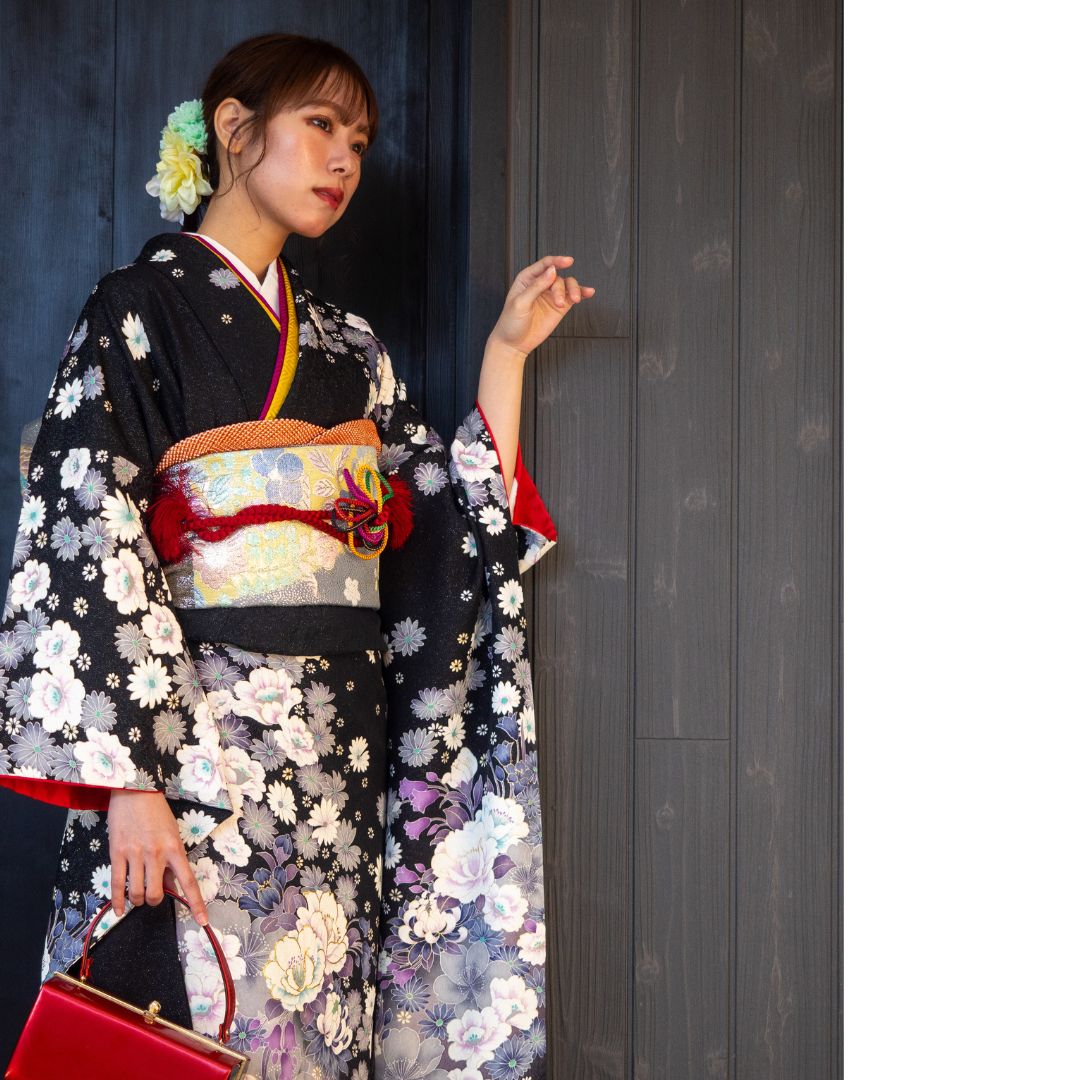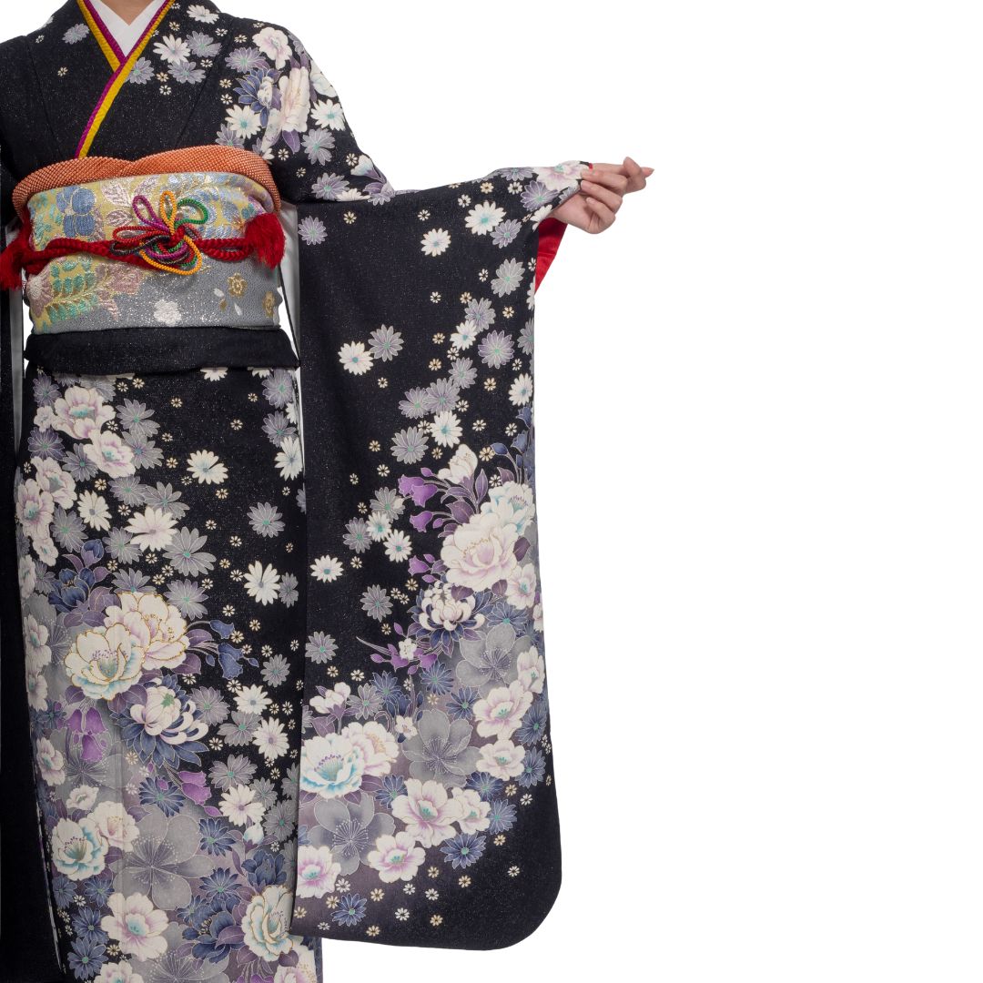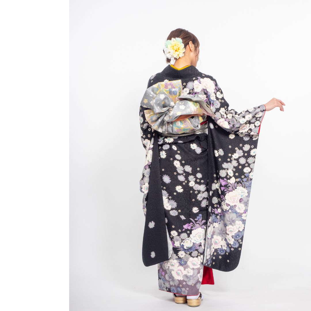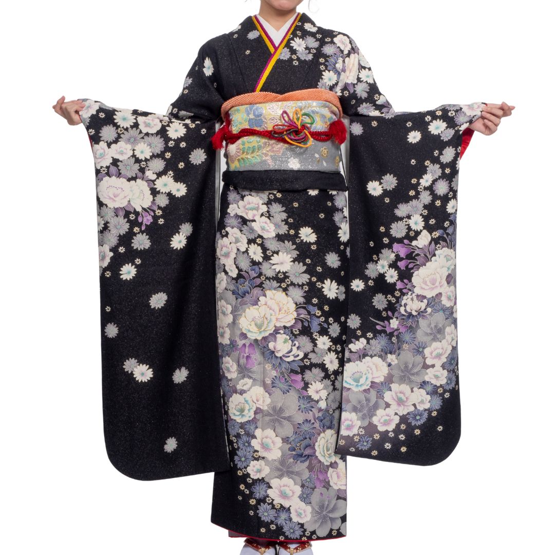 【対応身長155cm~170cm】【クール・モダン】【正絹】成人式レンタル振袖フルセット-398 花柄 クール系 定番 ポップキュート 黒系 紫系 洋花 豪華