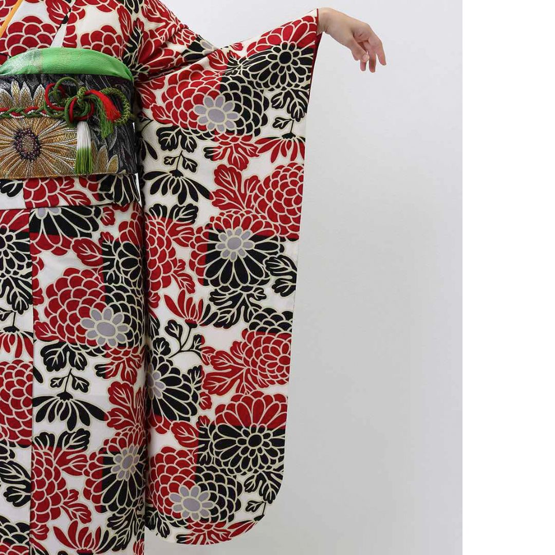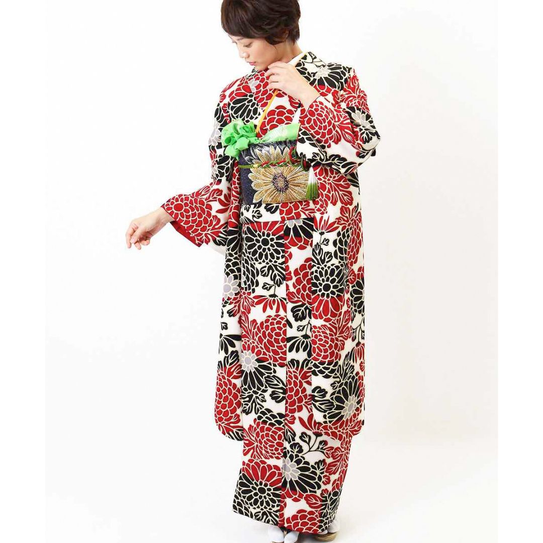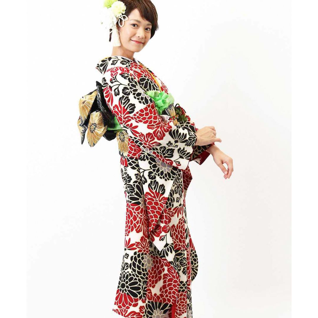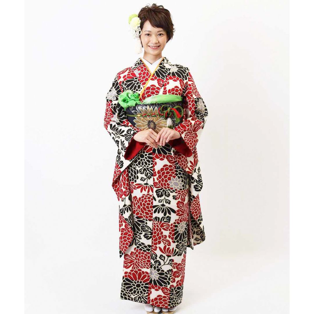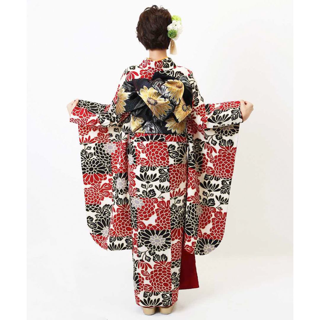 【対応身長150cm~165cm】【レトロ・アンティーク風】【合繊】成人式レンタル振袖フルセット-409 花柄 レトロ クール系 ポップキュート 赤系 黒系 白系 総柄