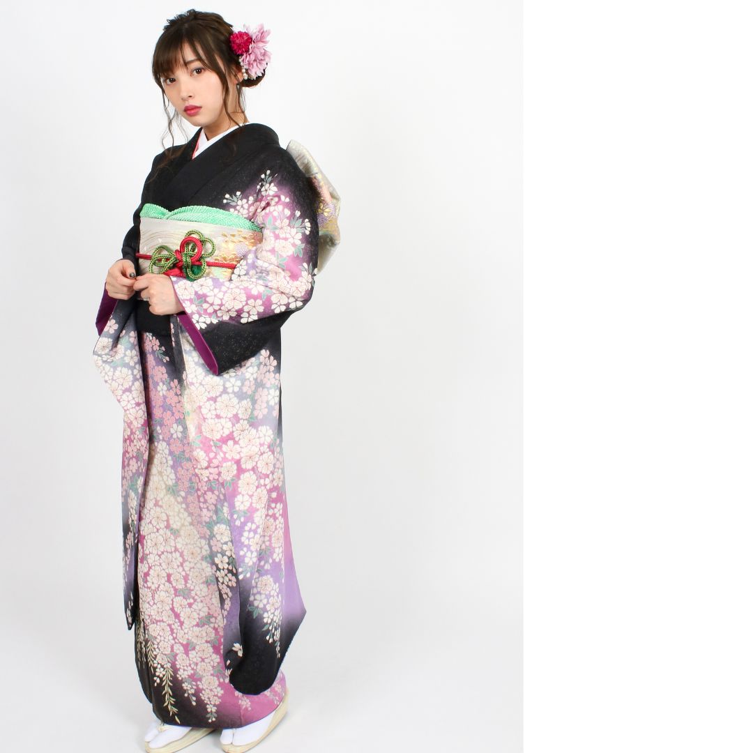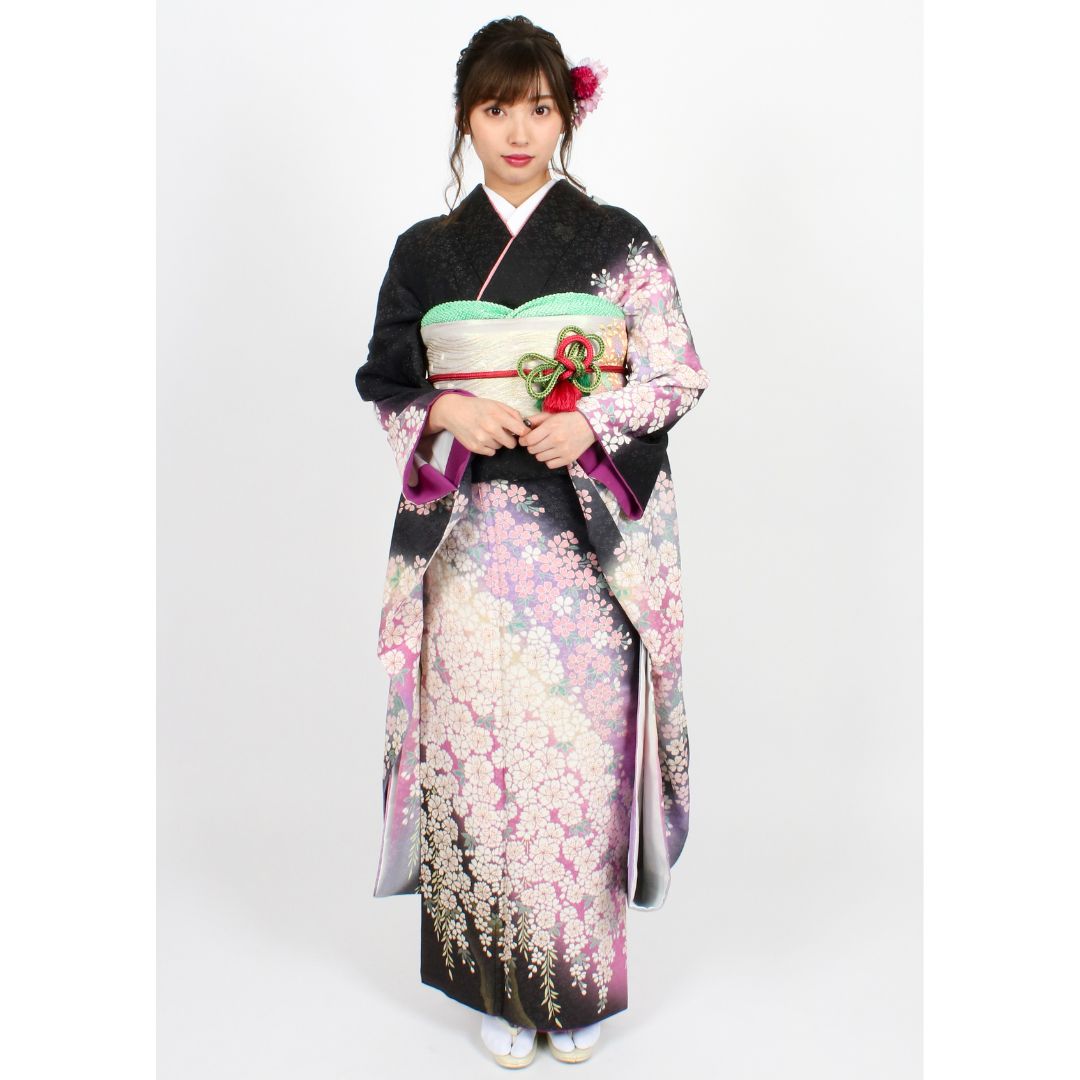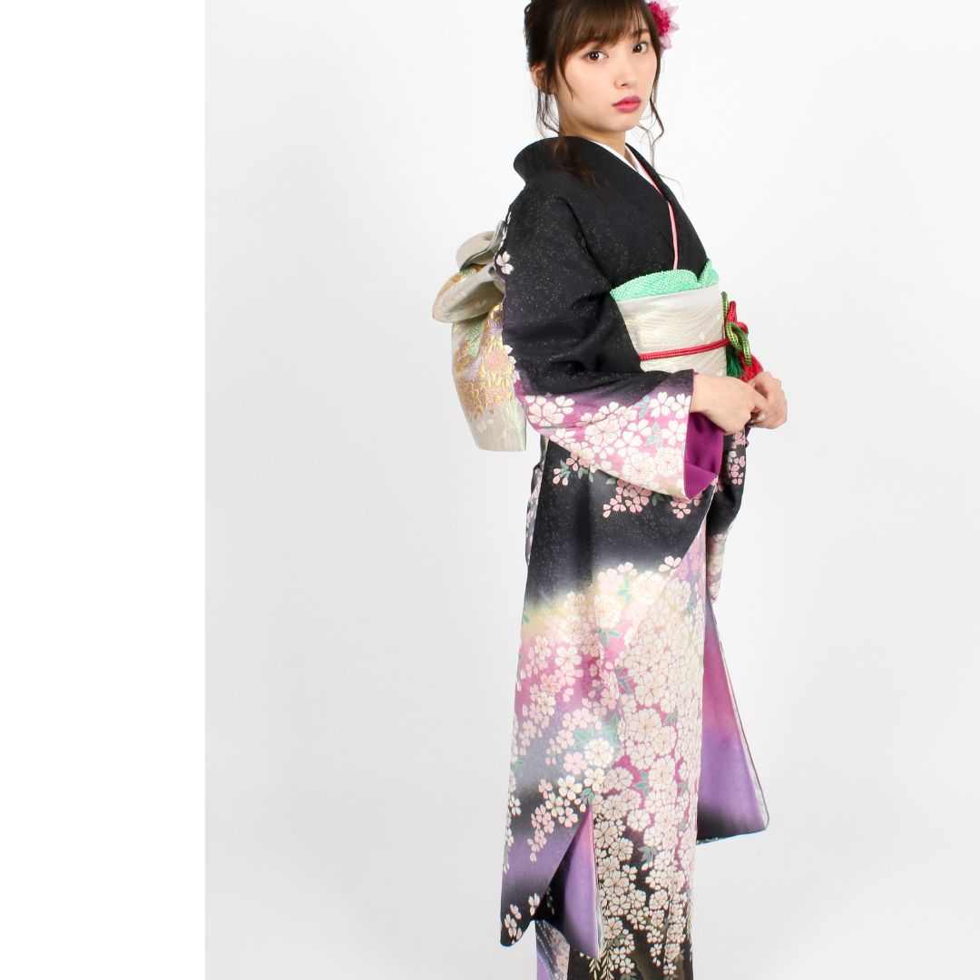 【対応身長150cm~165cm】【古典・正統派】【正絹】成人式レンタル振袖フルセット-418 花柄 クール系 定番 黒系 紫系 おぼろ
