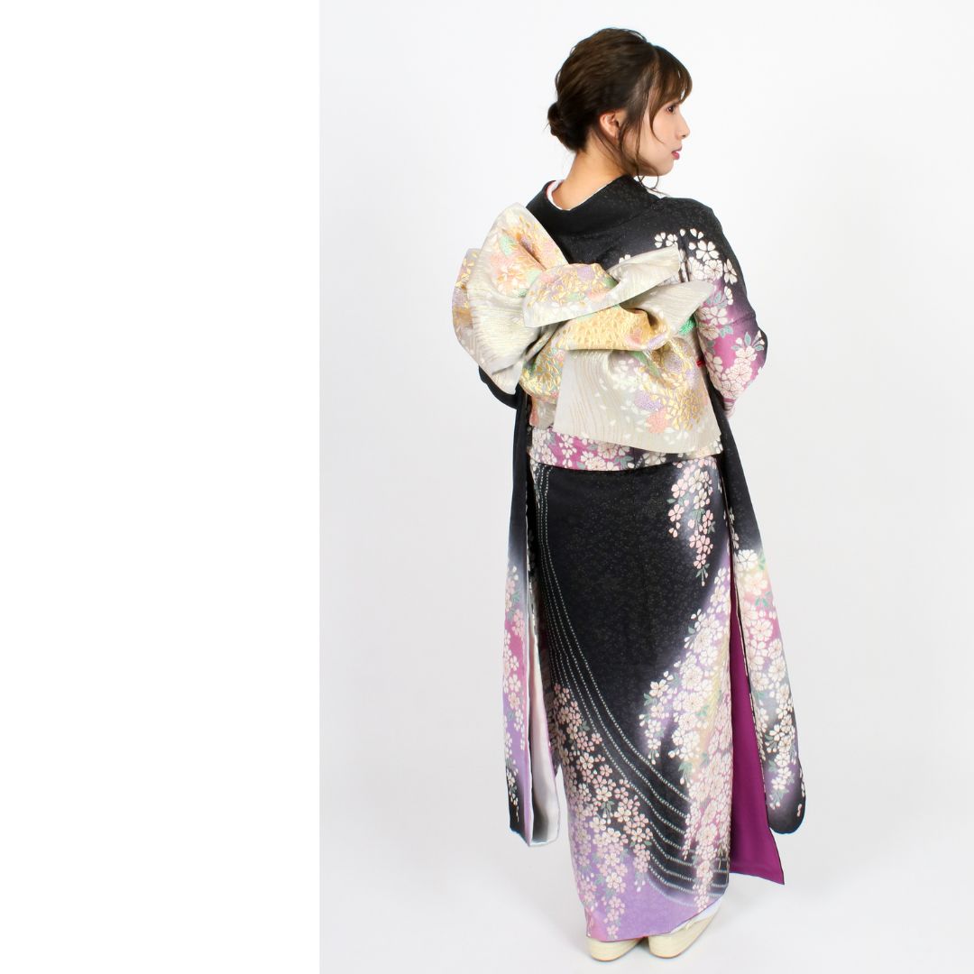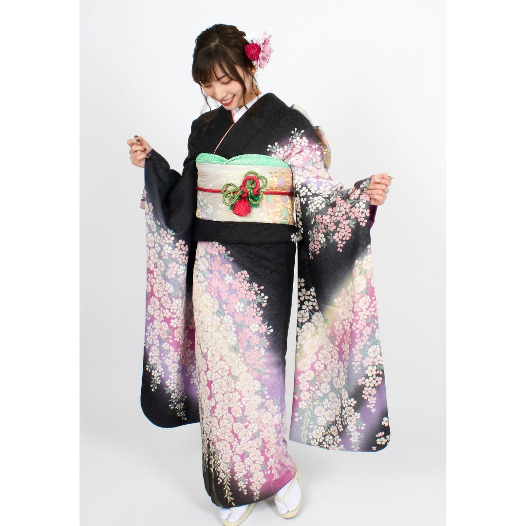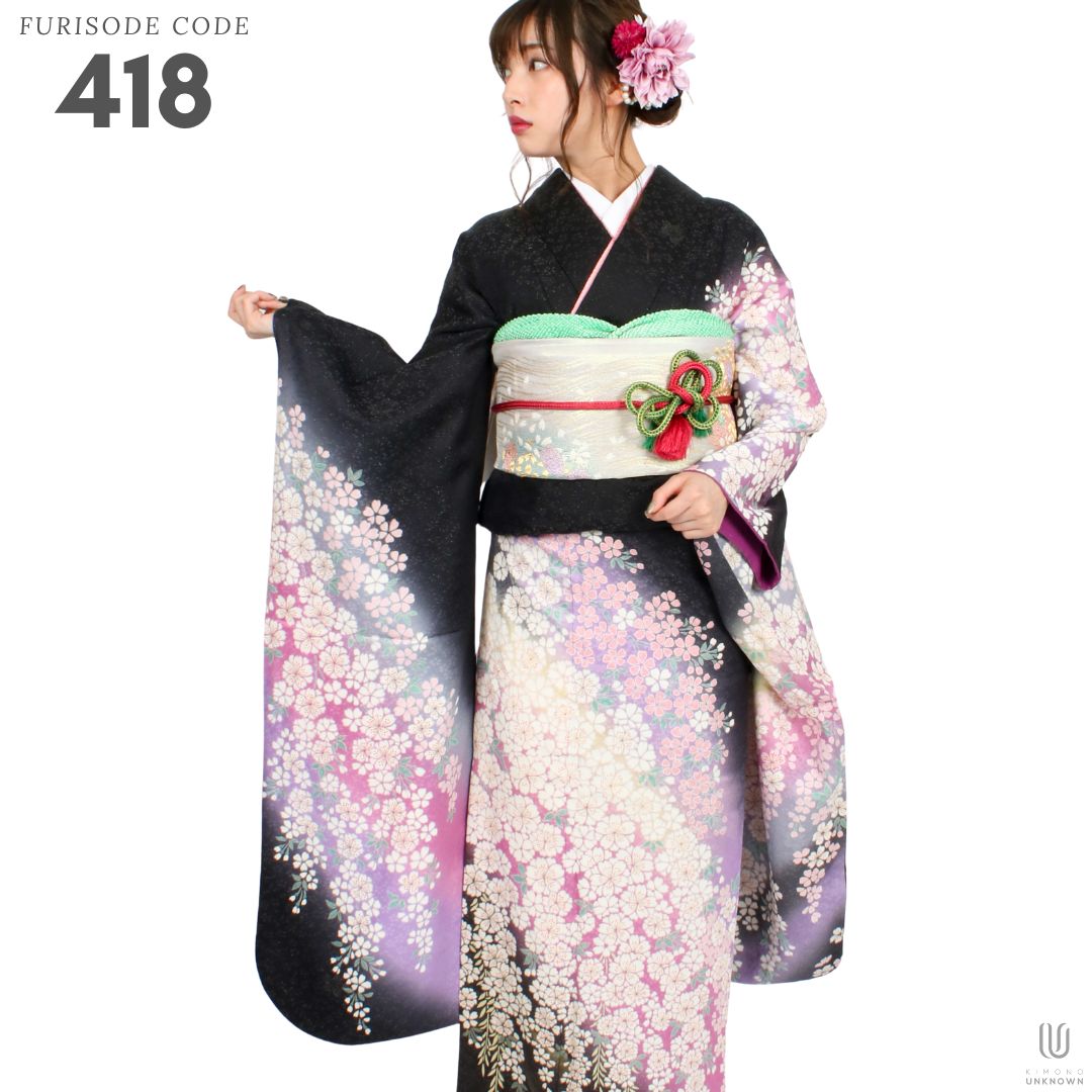 【対応身長150cm~165cm】【古典・正統派】【正絹】成人式レンタル振袖フルセット-418 花柄 クール系 定番 黒系 紫系 おぼろ