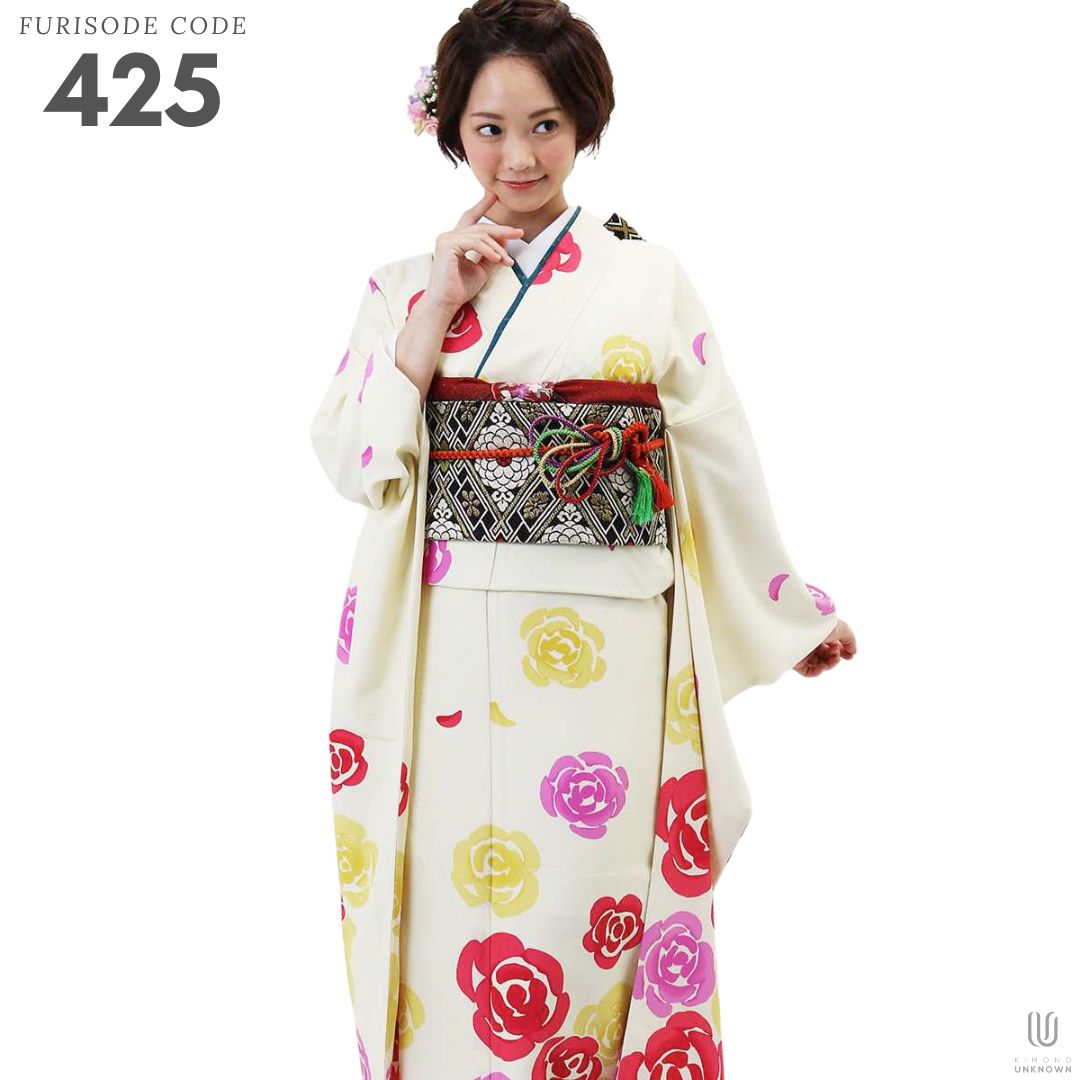 【対応身長150cm~165cm】【ポップ・キュート】【合繊】成人式レンタル振袖フルセット-425 花柄 モダン ポップキュート 白系 ピンク系 ツモリチサト