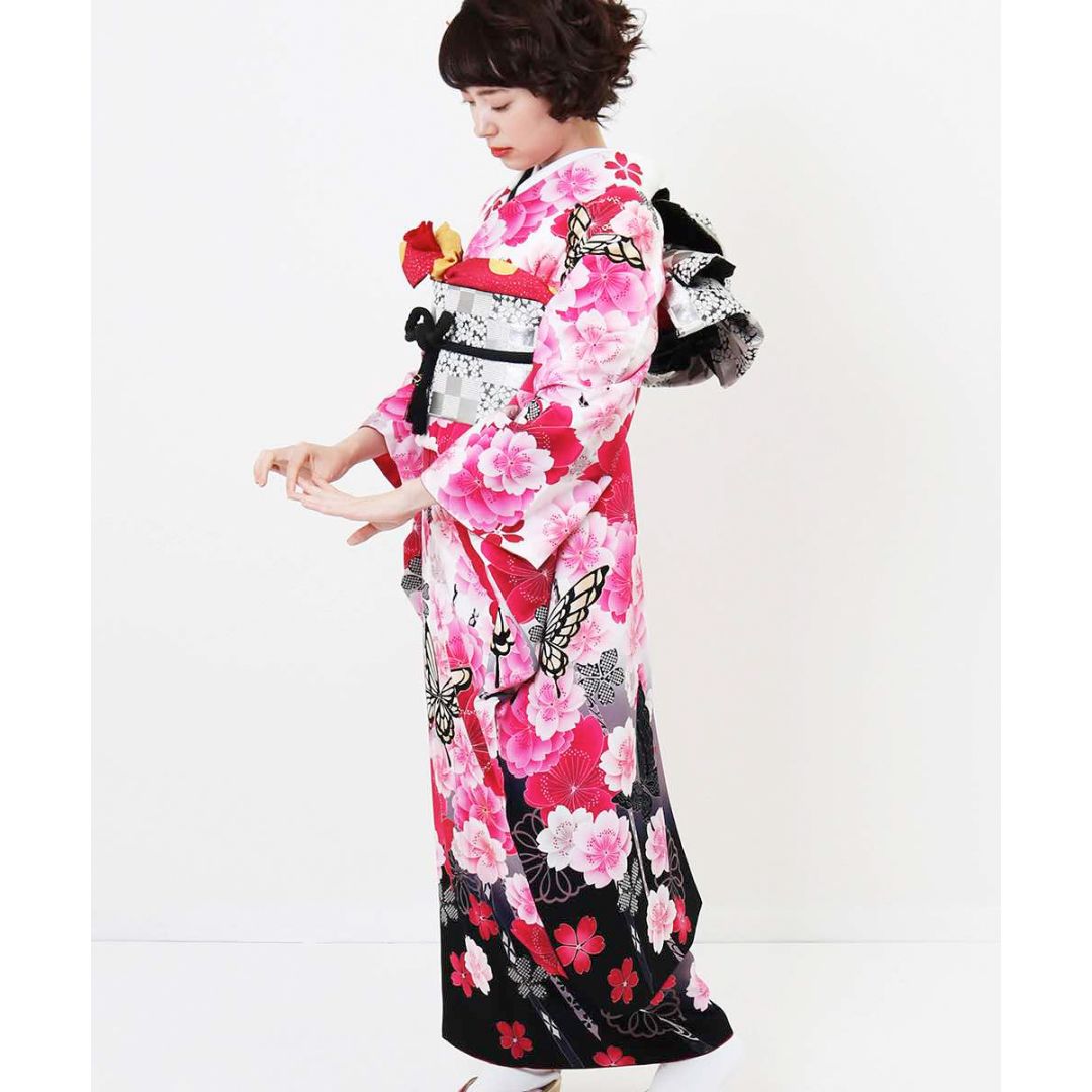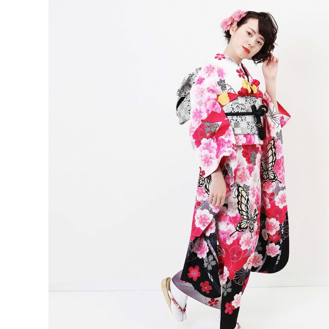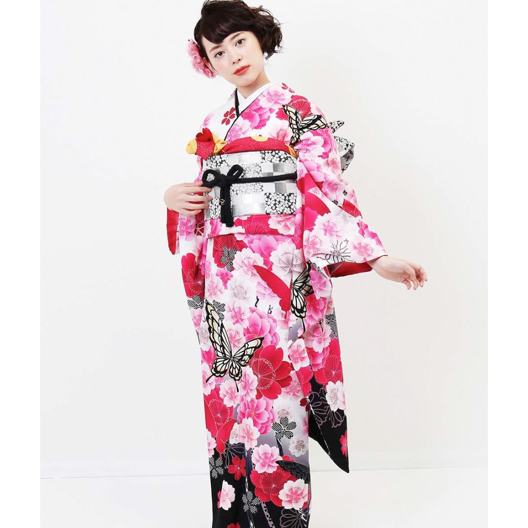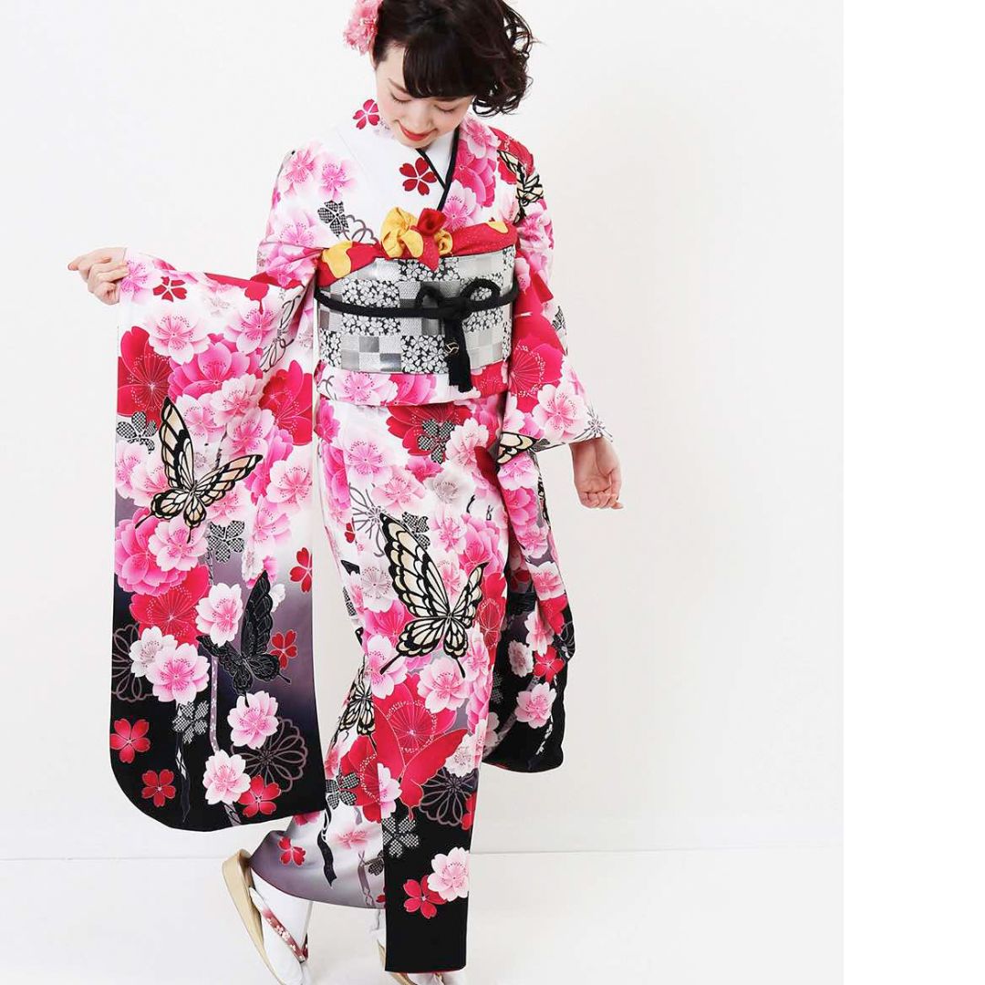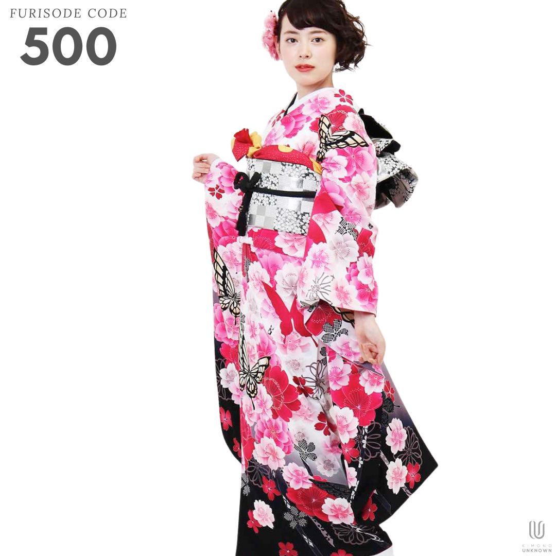 【対応身長160cm~175cm】【クール・モダン】【合繊】成人式レンタル振袖フルセット-500 花柄 モダン ポップキュート 白系 ピンク系 蝶 桜 JAPAN STYLE
