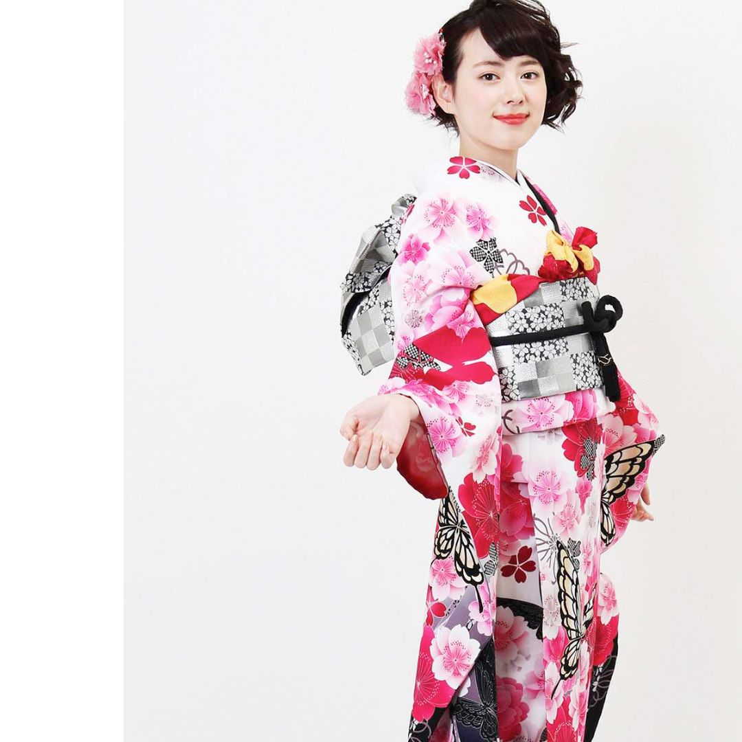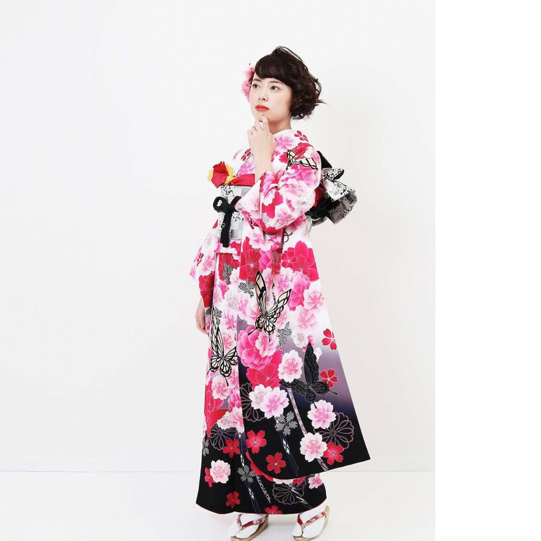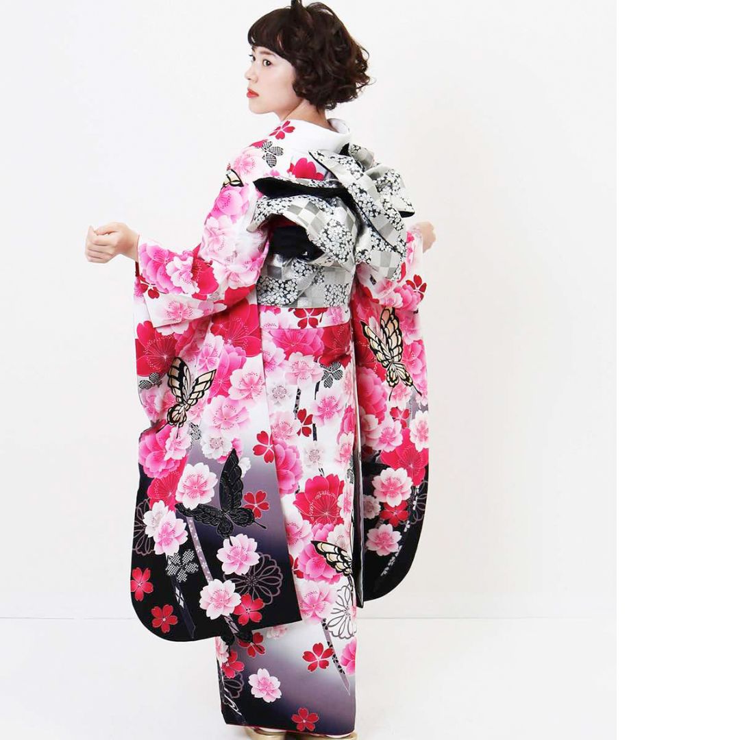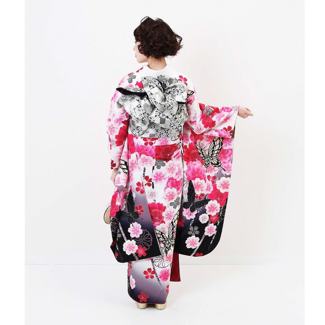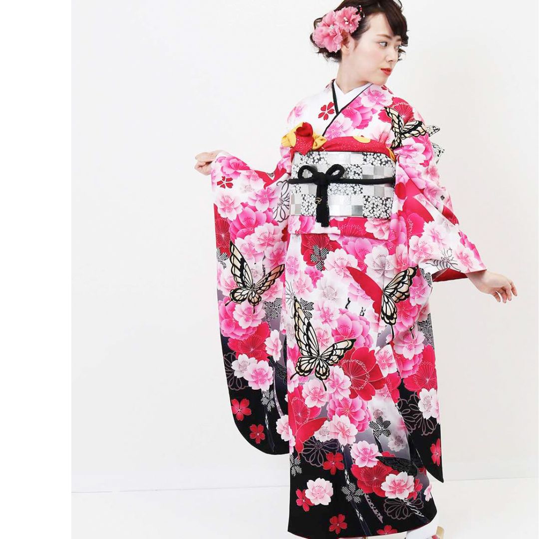 【対応身長160cm~175cm】【クール・モダン】【合繊】成人式レンタル振袖フルセット-500 花柄 モダン ポップキュート 白系 ピンク系 蝶 桜 JAPAN STYLE