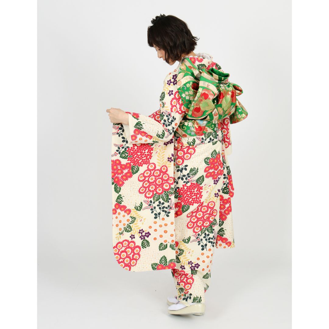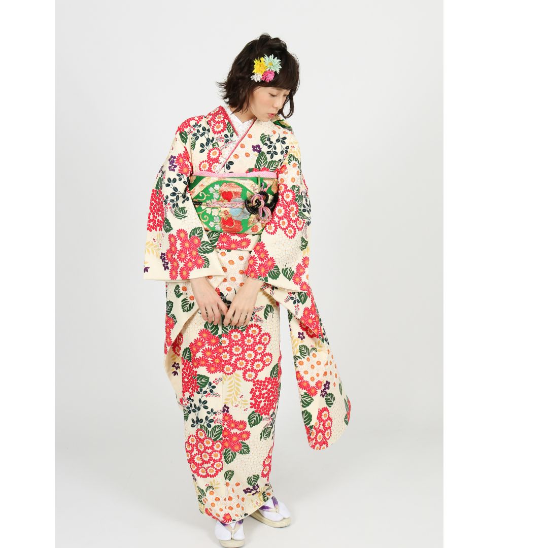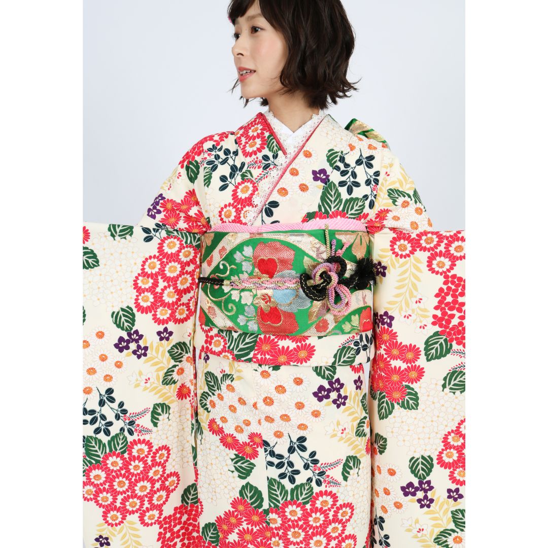 【対応身長155cm~170cm】【レトロ・アンティーク風】成人式レンタル振袖フルセット-623 花柄 レトロ ポップキュート ピンク系 白系 緑系 総柄