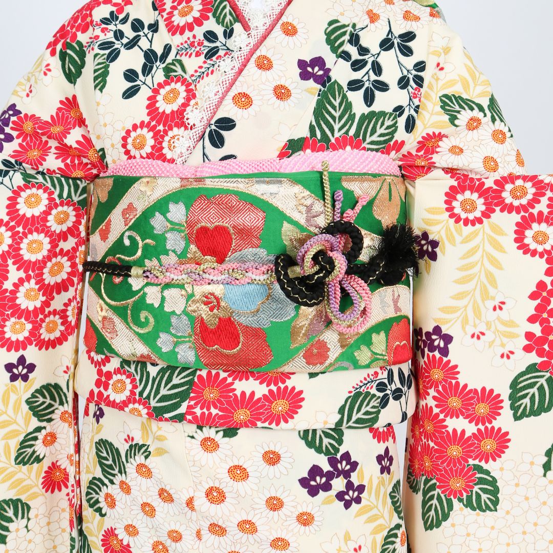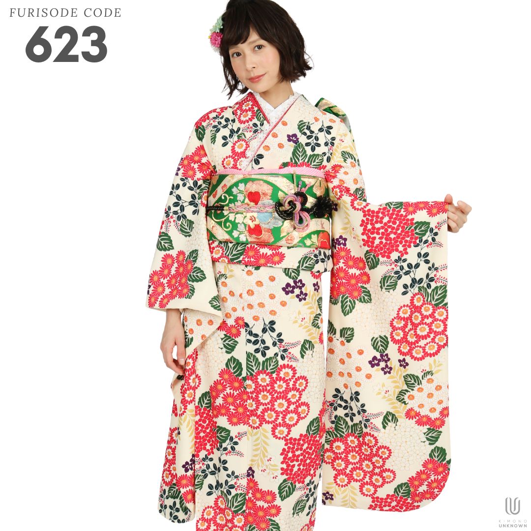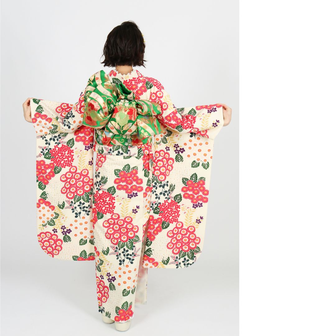 【対応身長155cm~170cm】【レトロ・アンティーク風】成人式レンタル振袖フルセット-623 花柄 レトロ ポップキュート ピンク系 白系 緑系 総柄