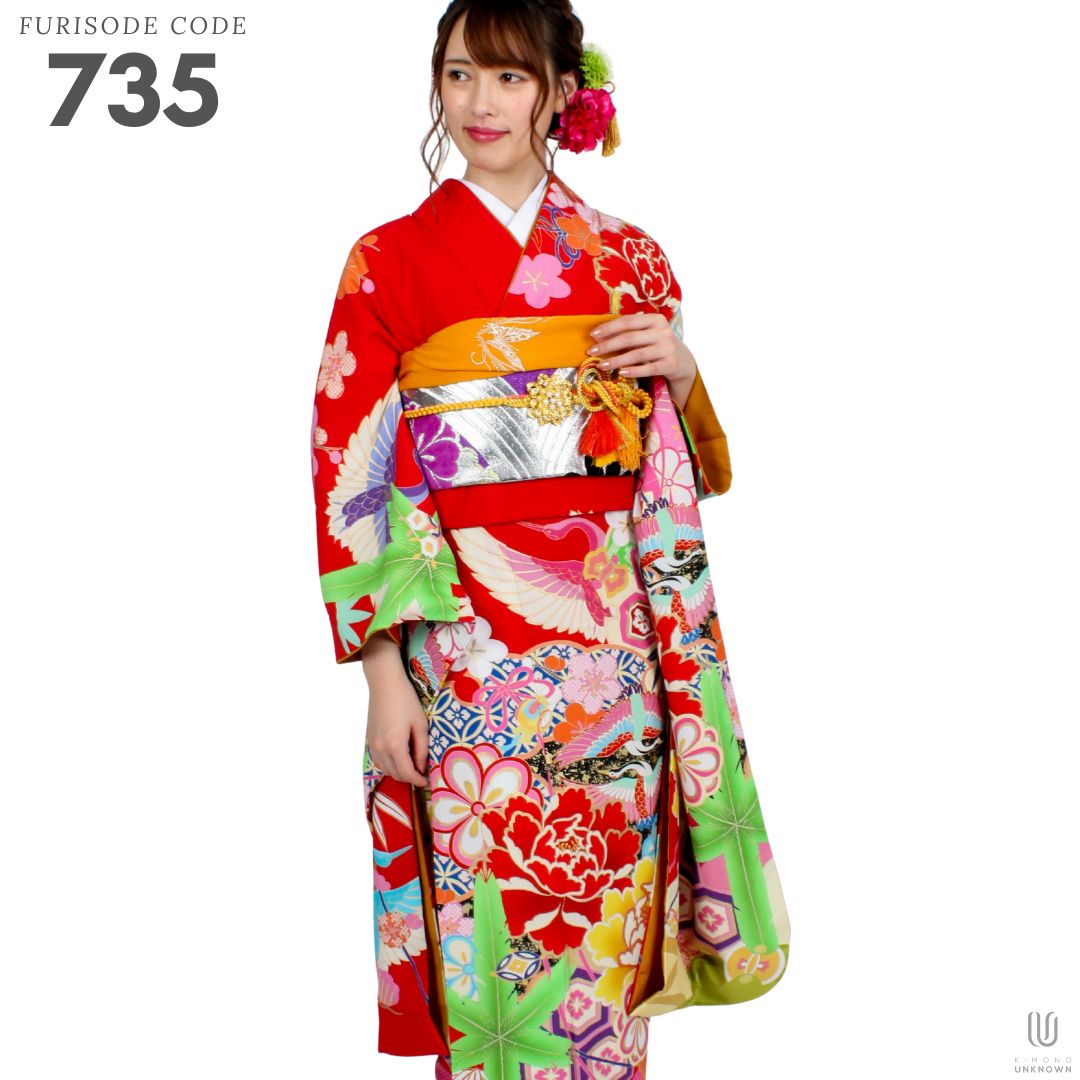 【対応身長155cm~170cm】【レトロ・アンティーク風】【合繊】成人式レンタル振袖フルセット-735 レトロ 牡丹 豪華系 古典系 赤系 鶴