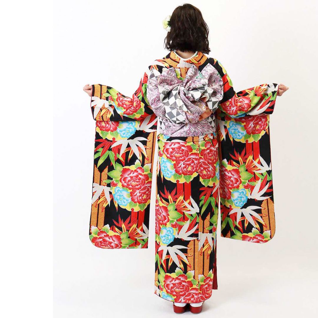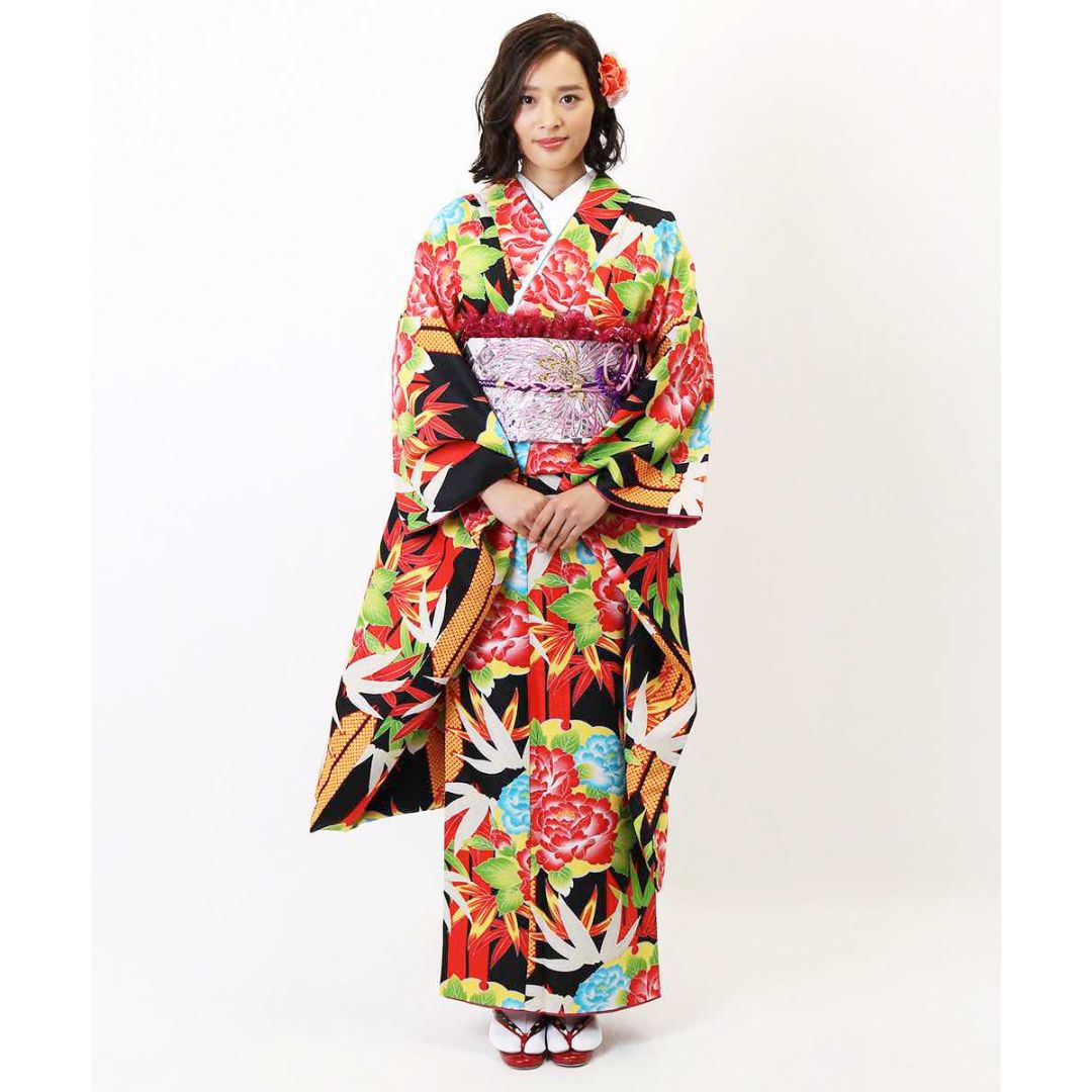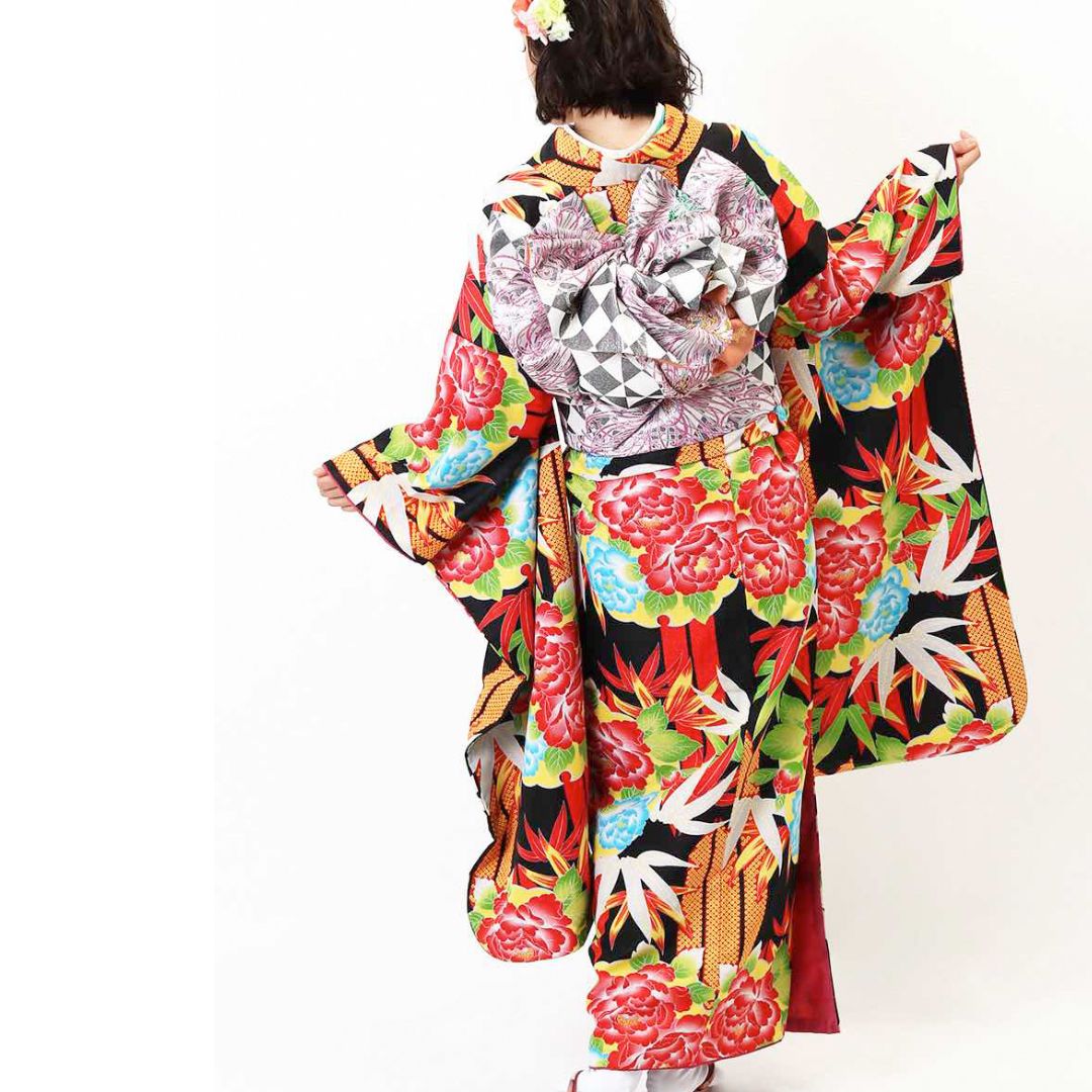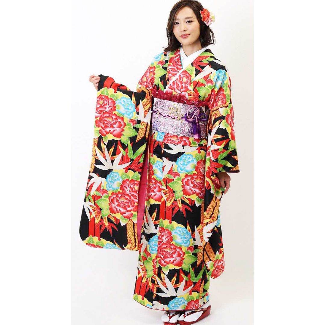 【対応身長154cm~169cm】【ポップ・キュート】成人式レンタル振袖フルセット-827 花柄 レトロ クール系 ポップキュート 黒系 緑系