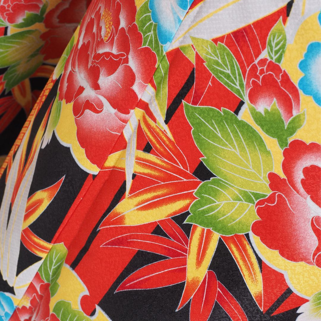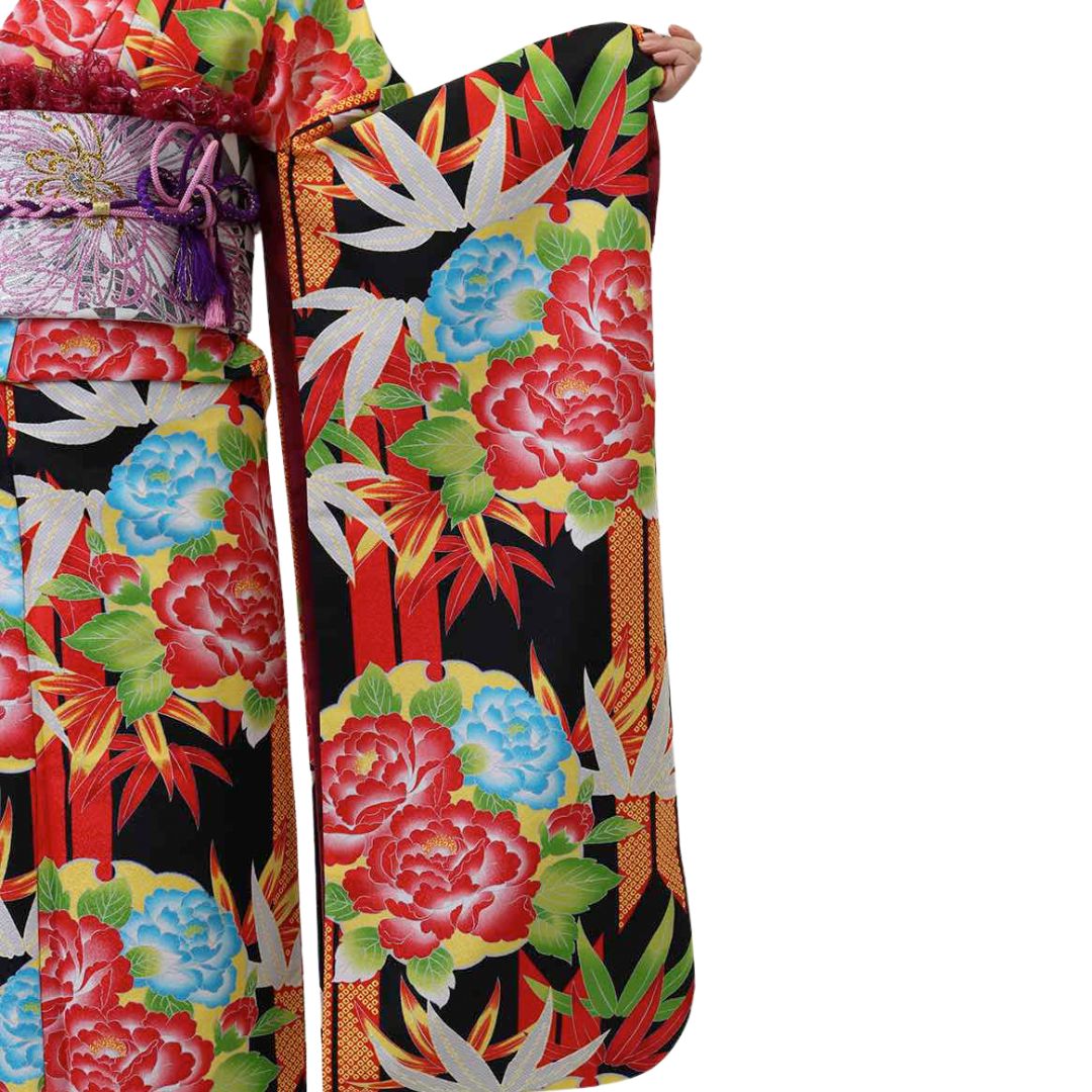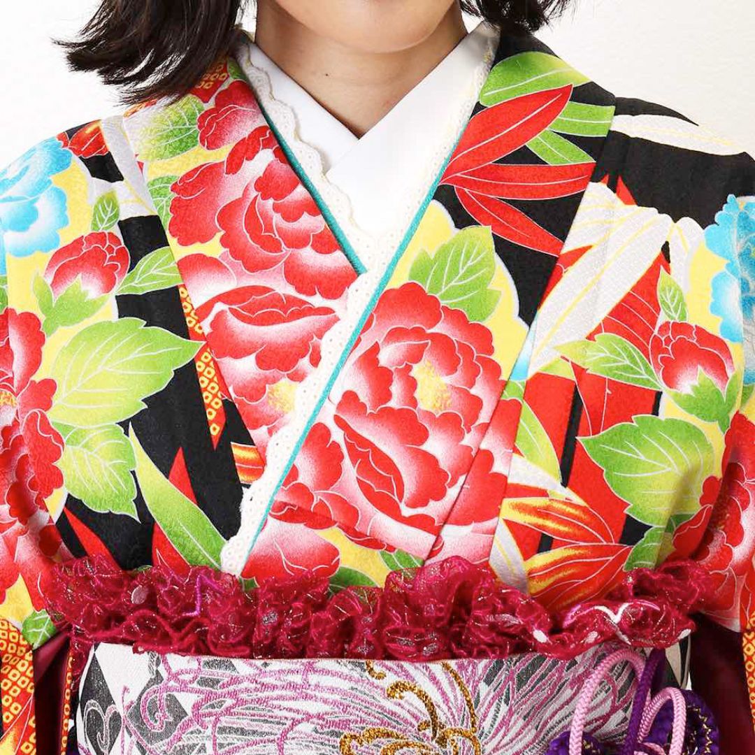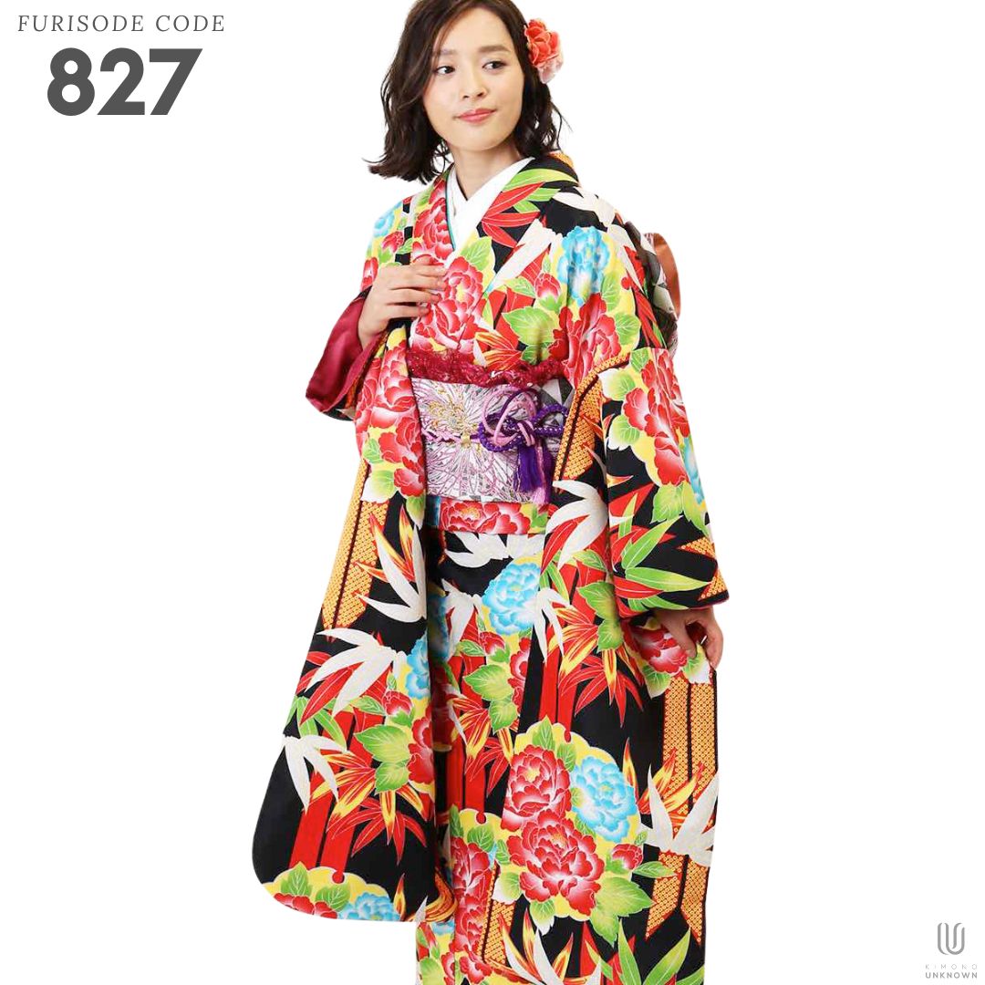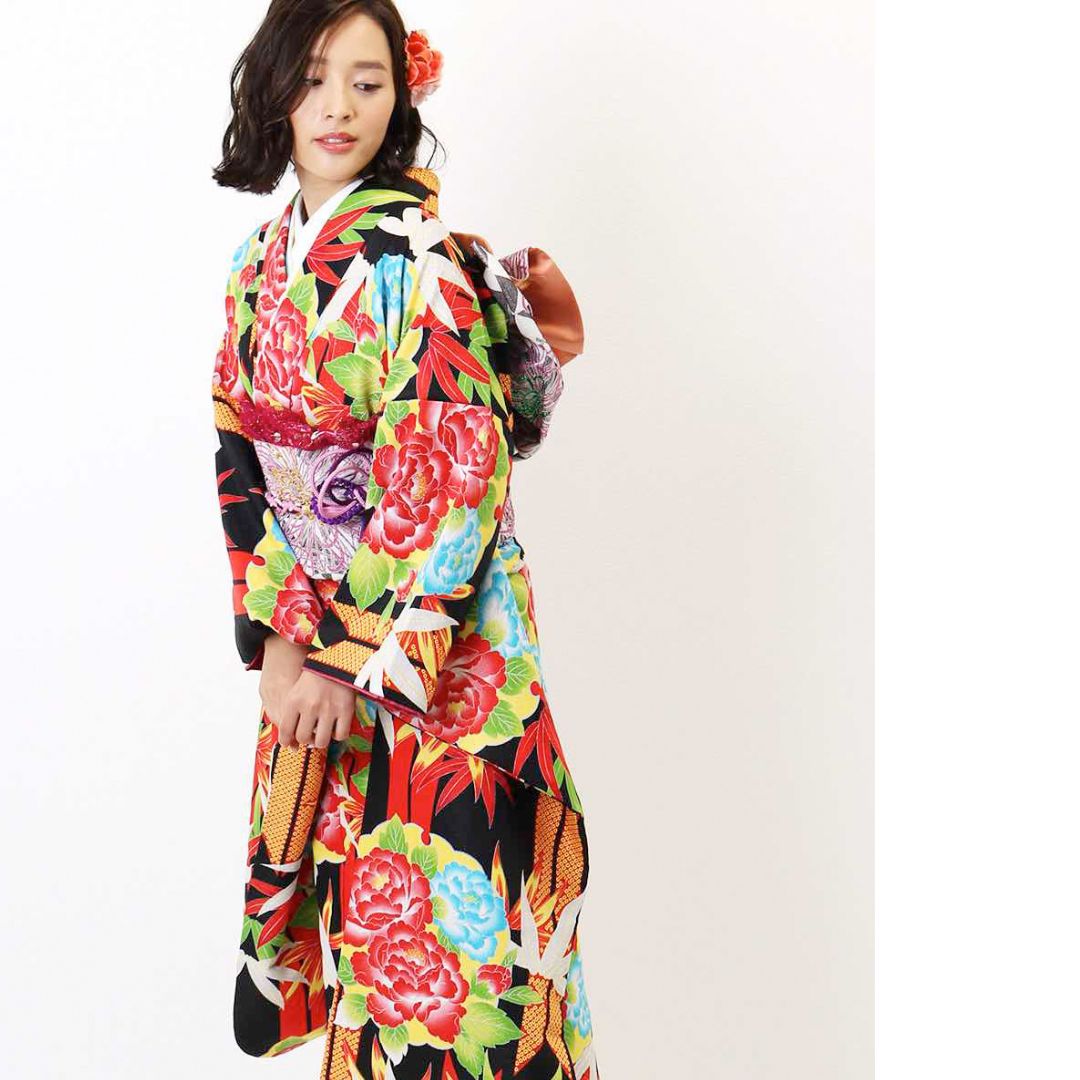 【対応身長154cm~169cm】【ポップ・キュート】成人式レンタル振袖フルセット-827 花柄 レトロ クール系 ポップキュート 黒系 緑系