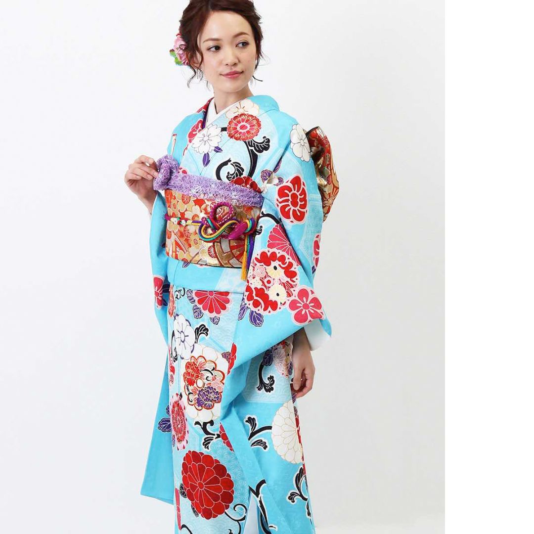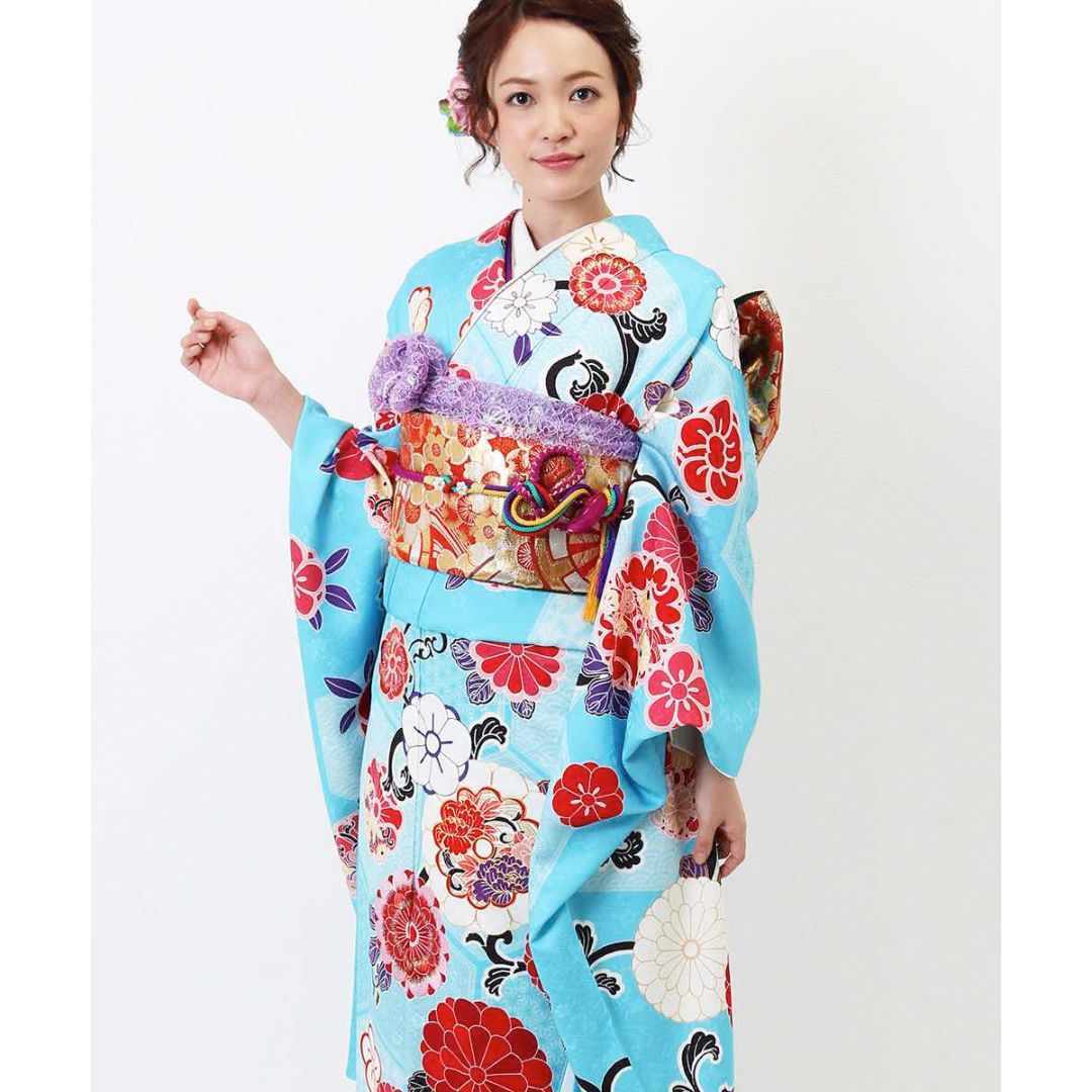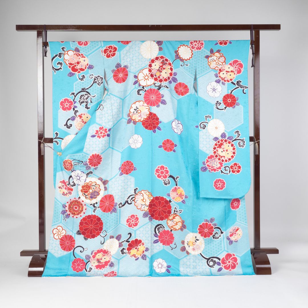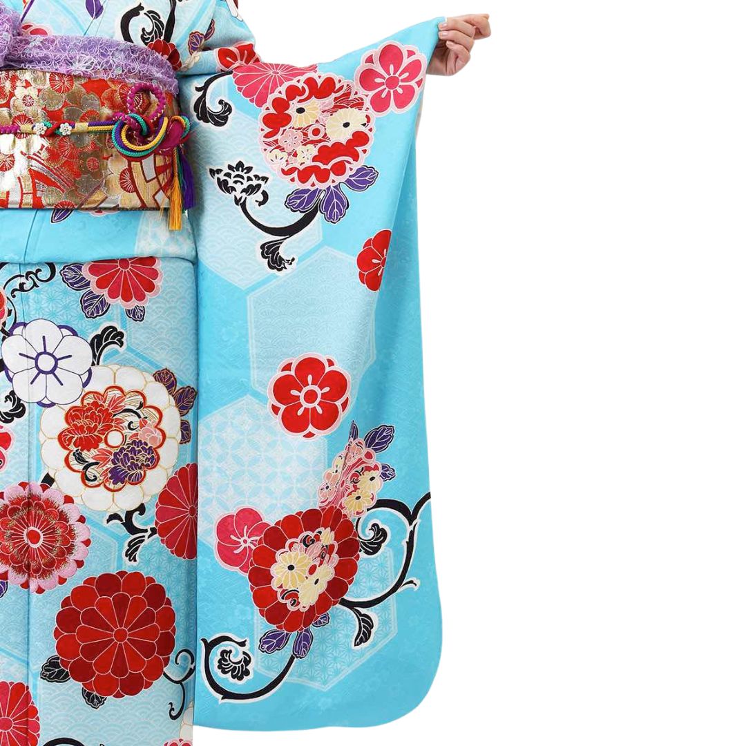 【対応身長155cm~170cm】【ポップ・キュート】成人式レンタル振袖フルセット-870 花柄 レトロ クール系 古典 水色系 菊 青海波 亀甲