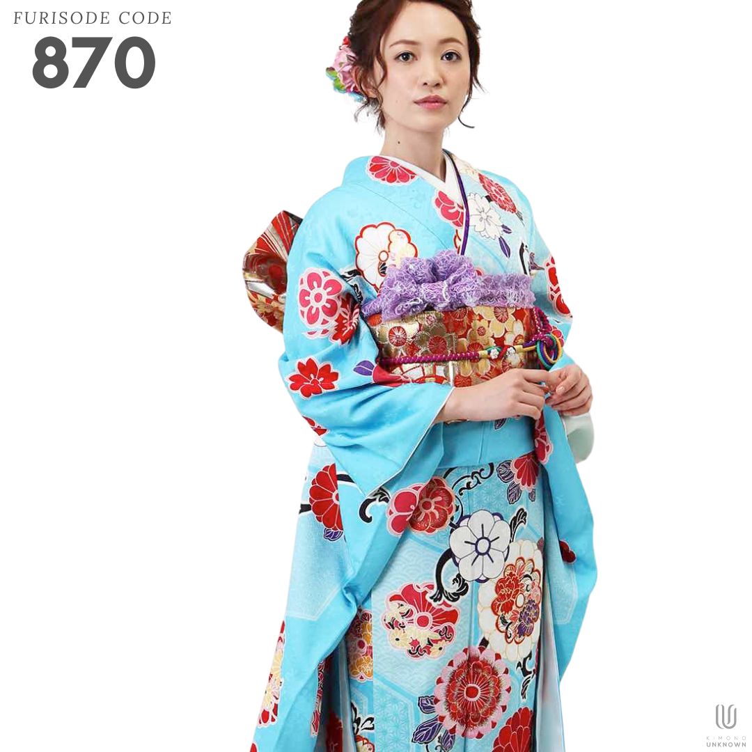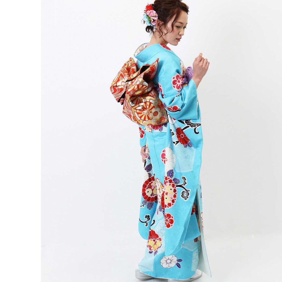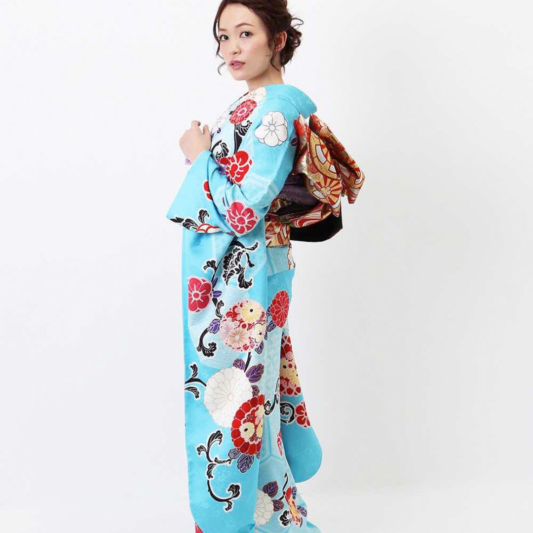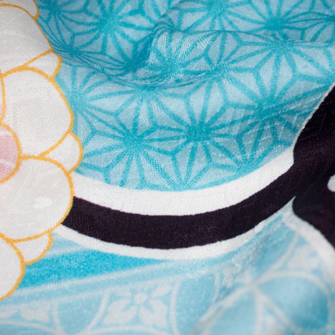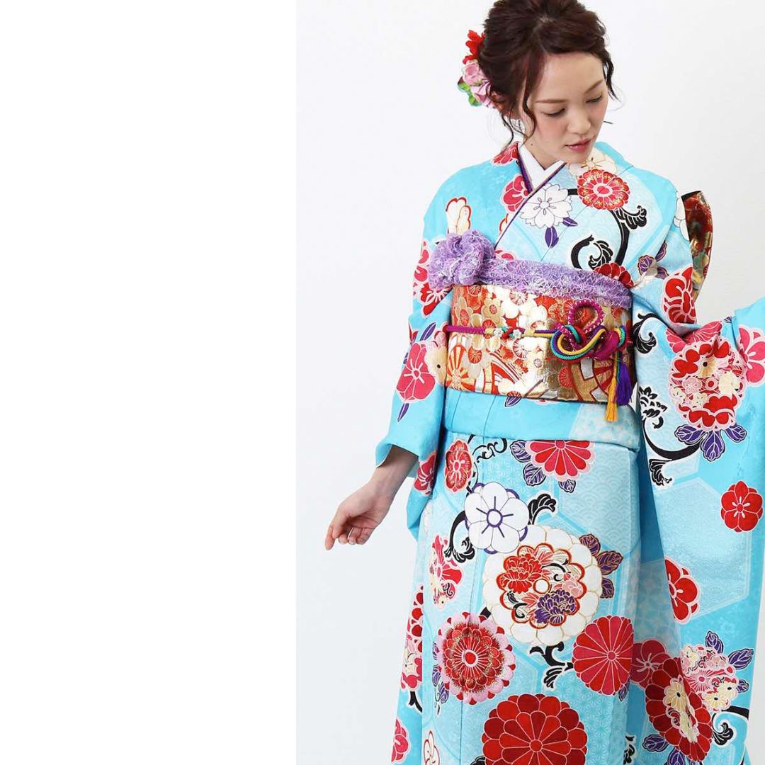 【対応身長155cm~170cm】【ポップ・キュート】成人式レンタル振袖フルセット-870 花柄 レトロ クール系 古典 水色系 菊 青海波 亀甲