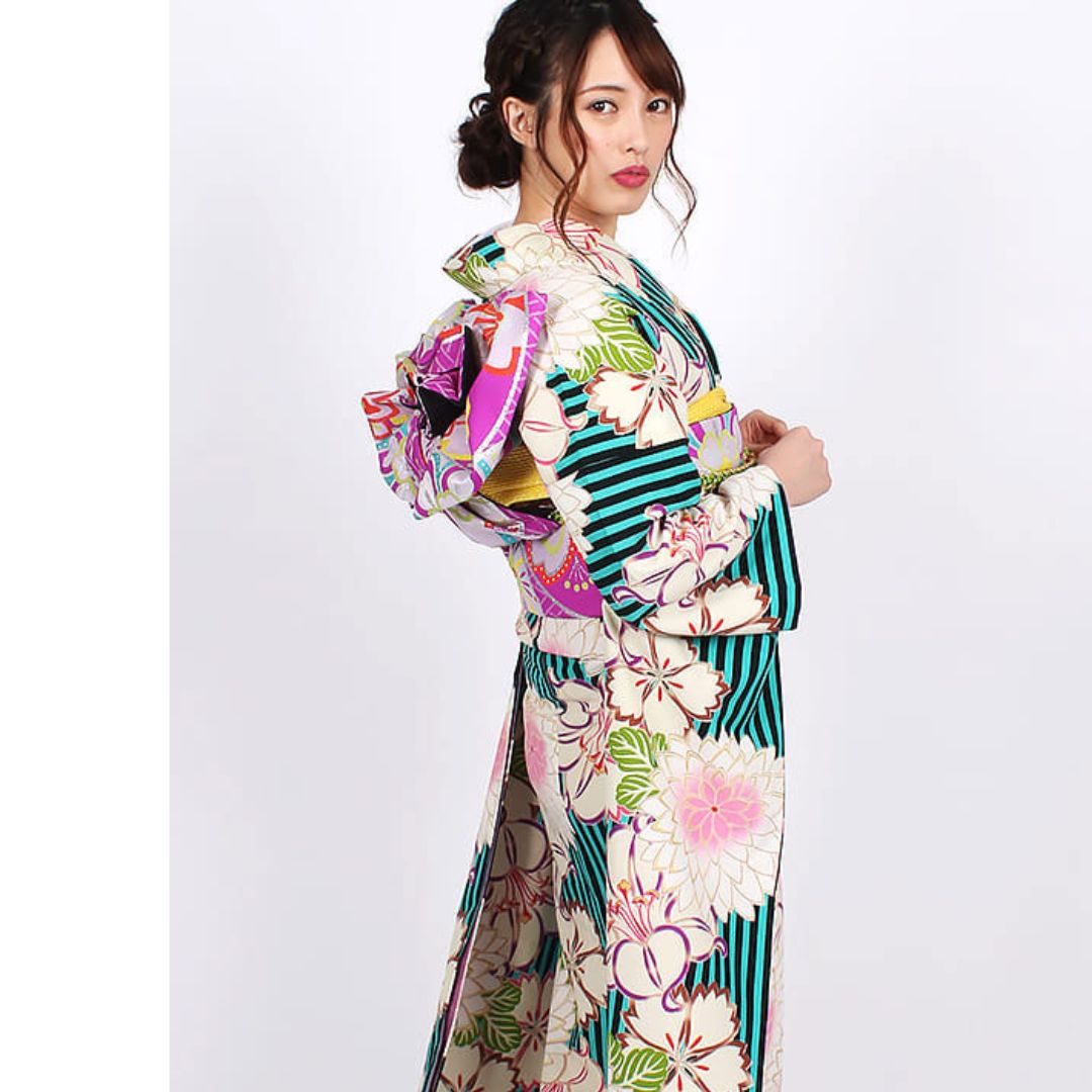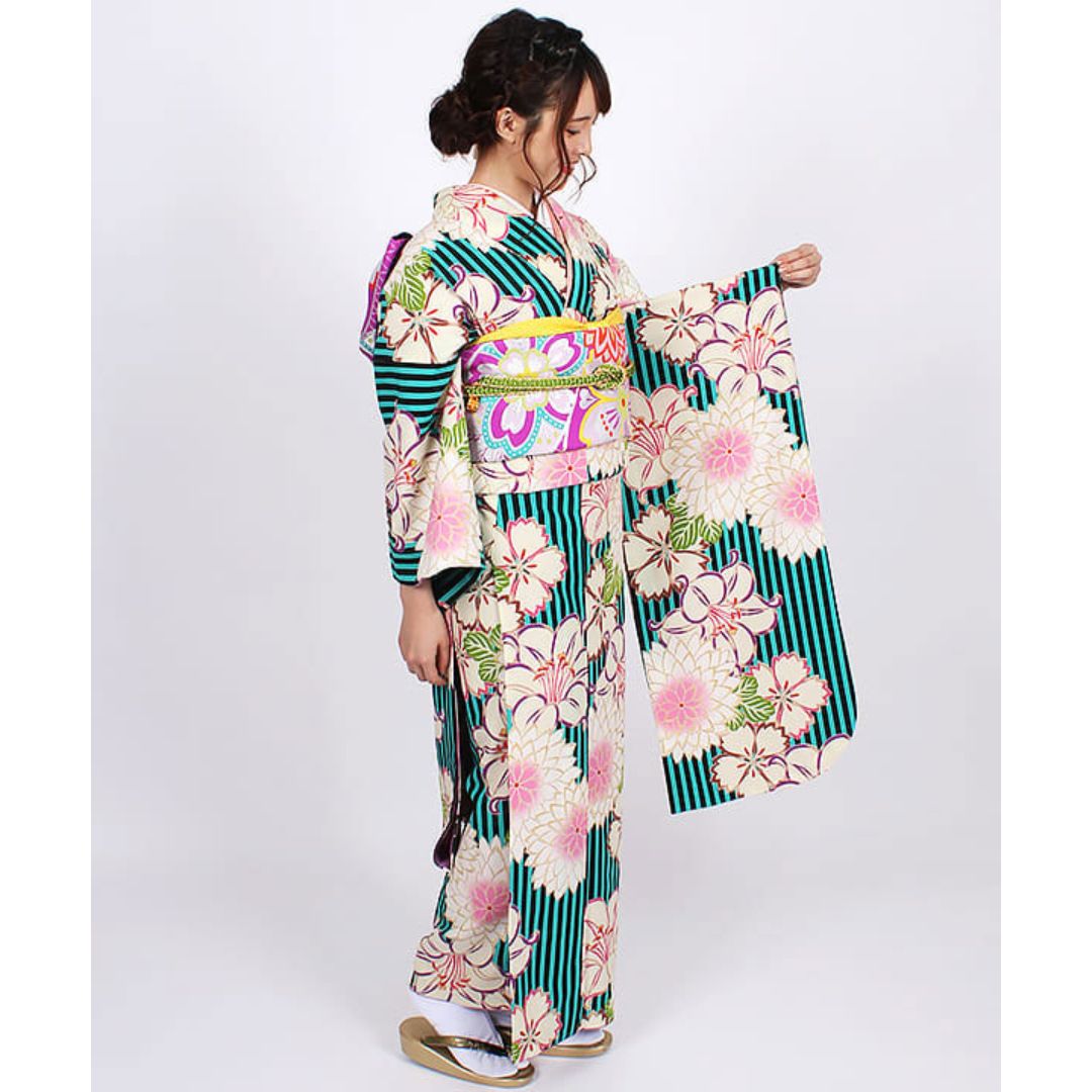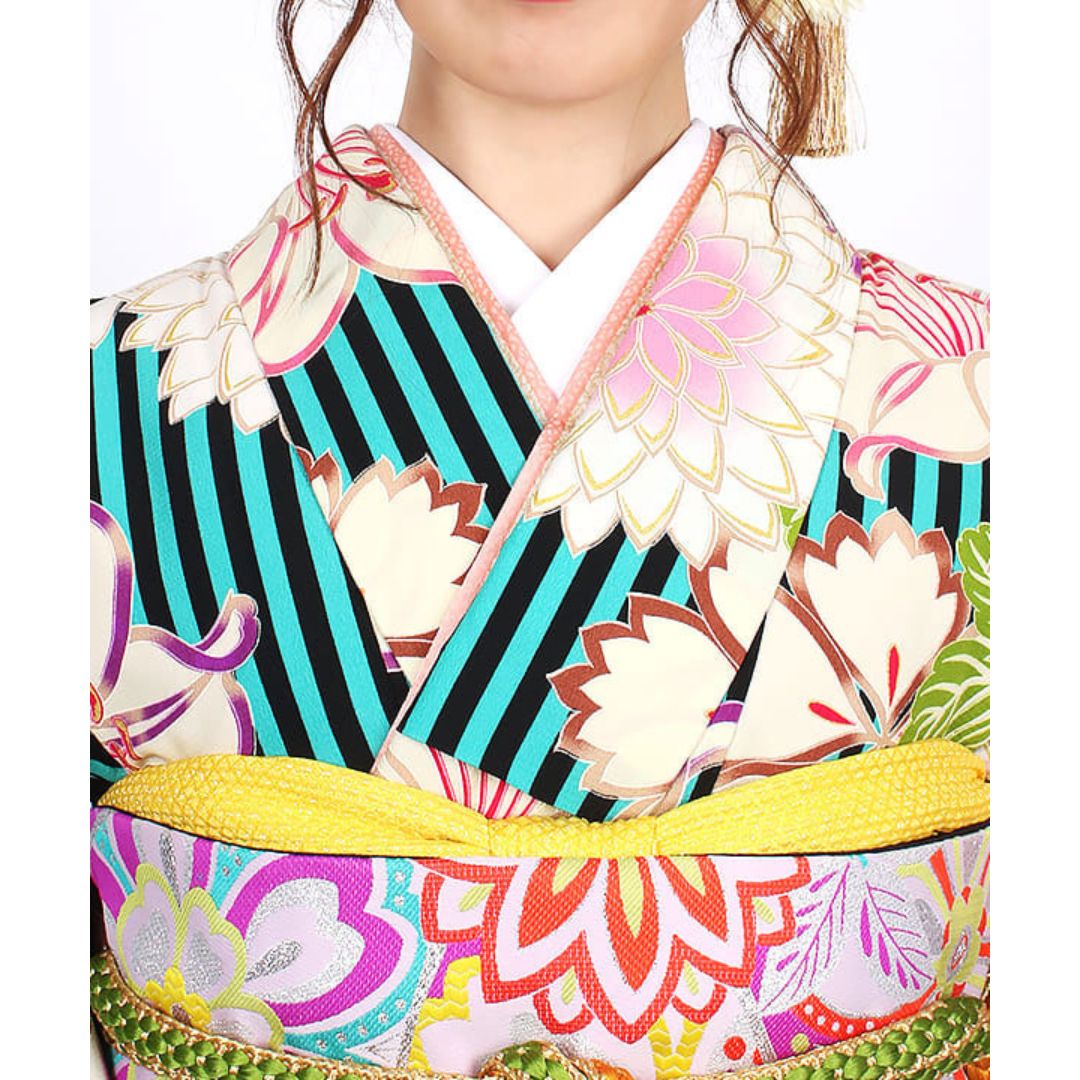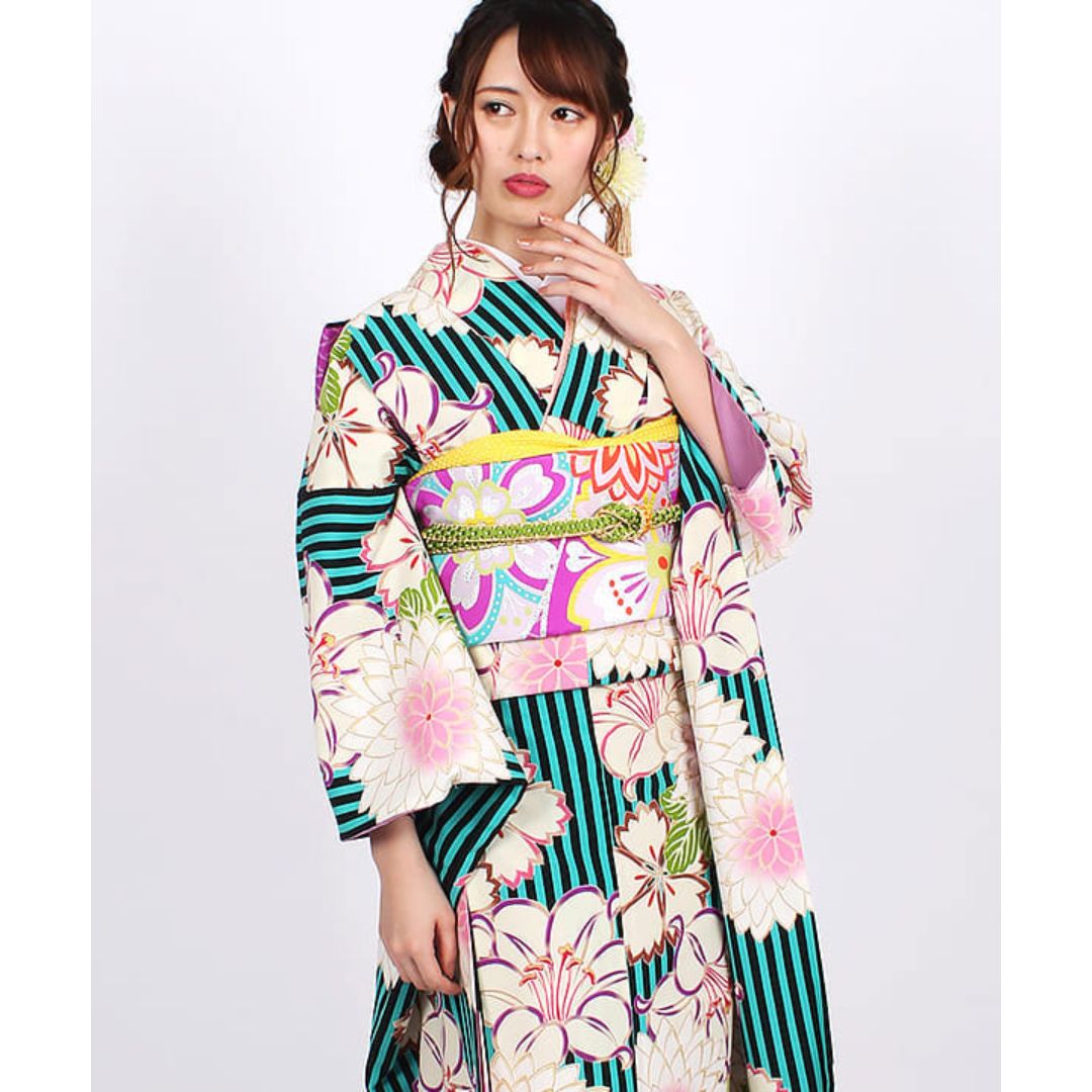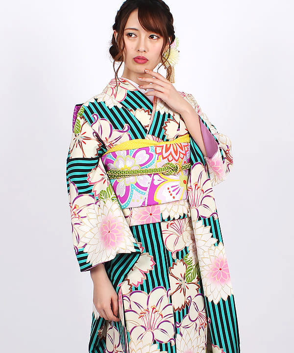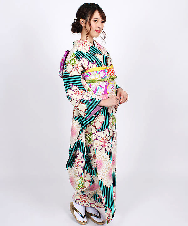 【対応身長155cm~170cm】【ポップ・キュート】成人式レンタル振袖フルセット-905 花柄 レトロ 定番 ポップキュート 緑系 黒系 洋花 ストライプ