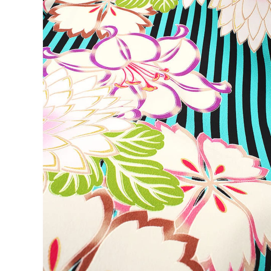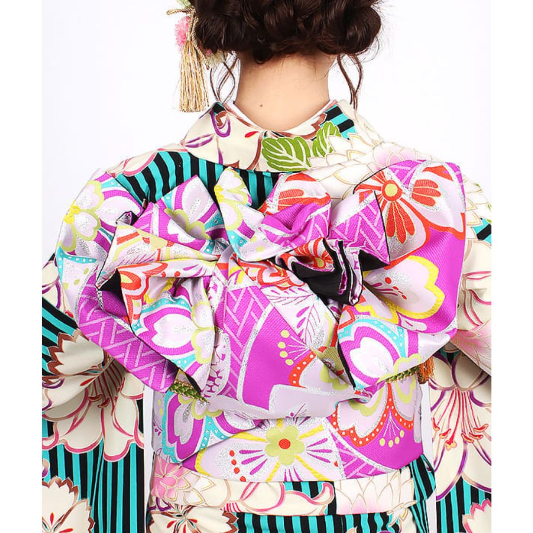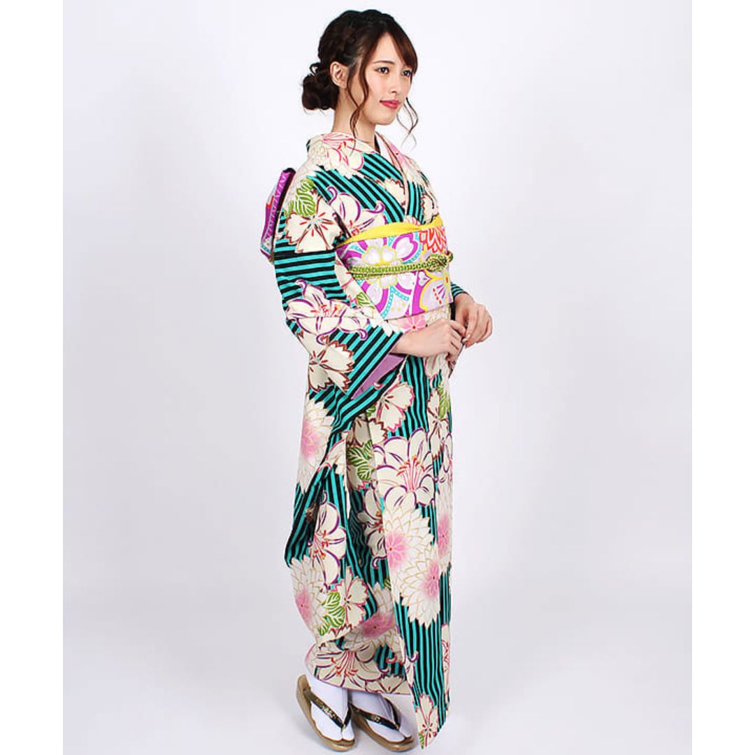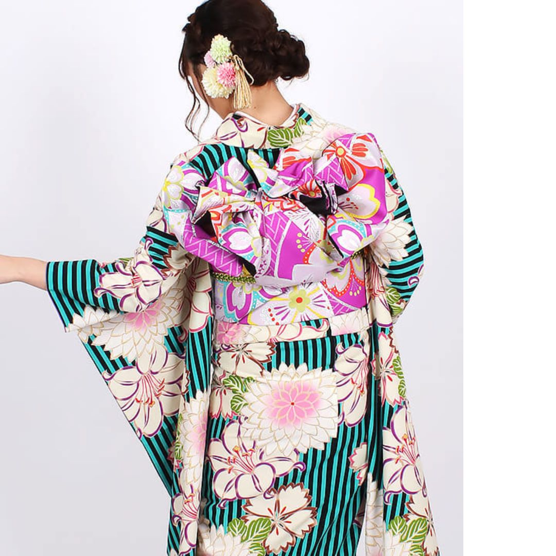 【対応身長155cm~170cm】【ポップ・キュート】成人式レンタル振袖フルセット-905 花柄 レトロ 定番 ポップキュート 緑系 黒系 洋花 ストライプ