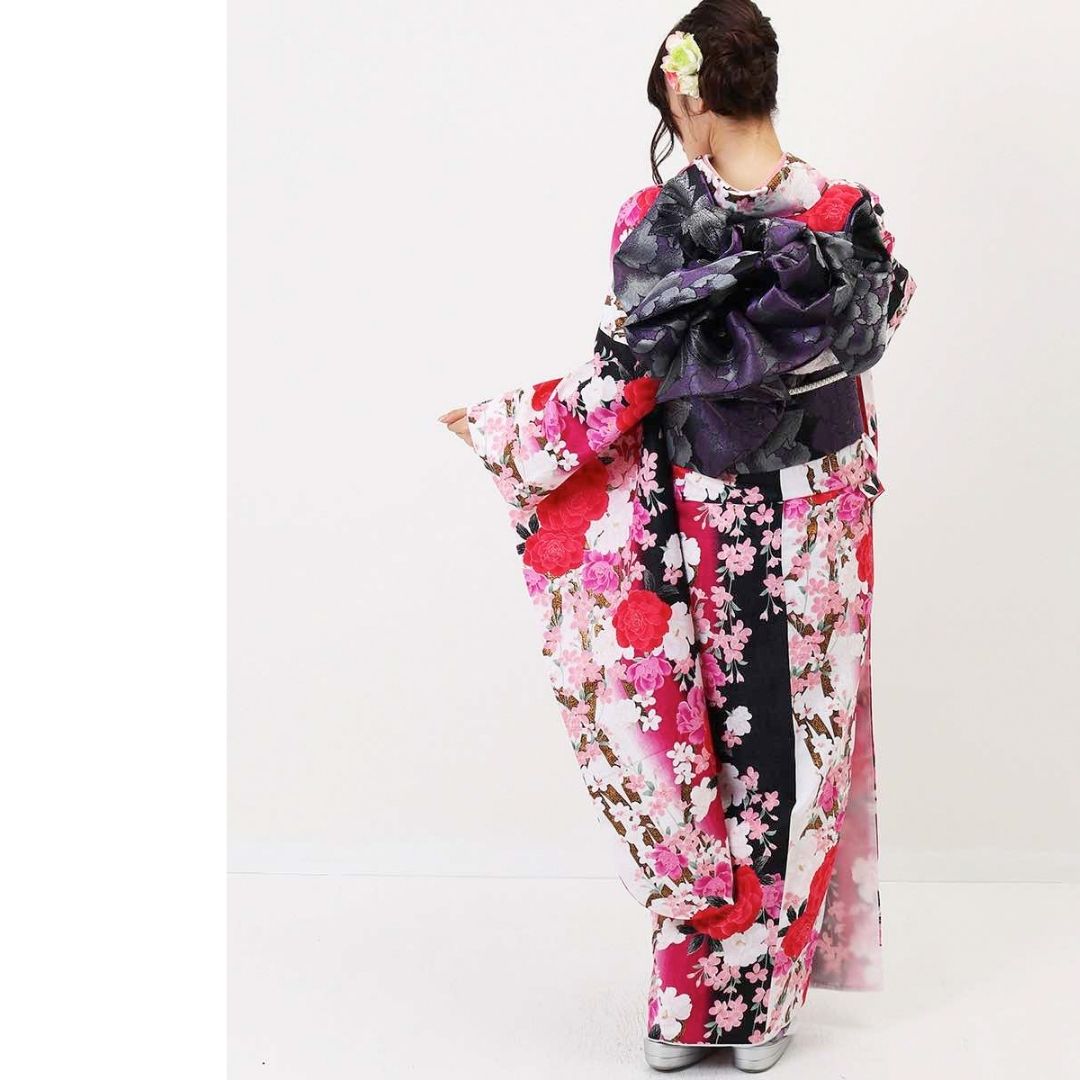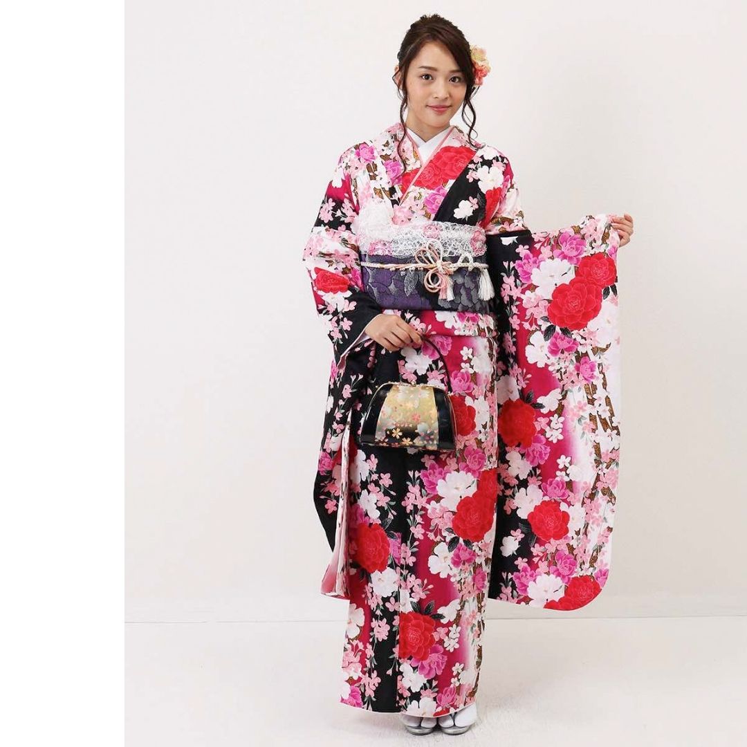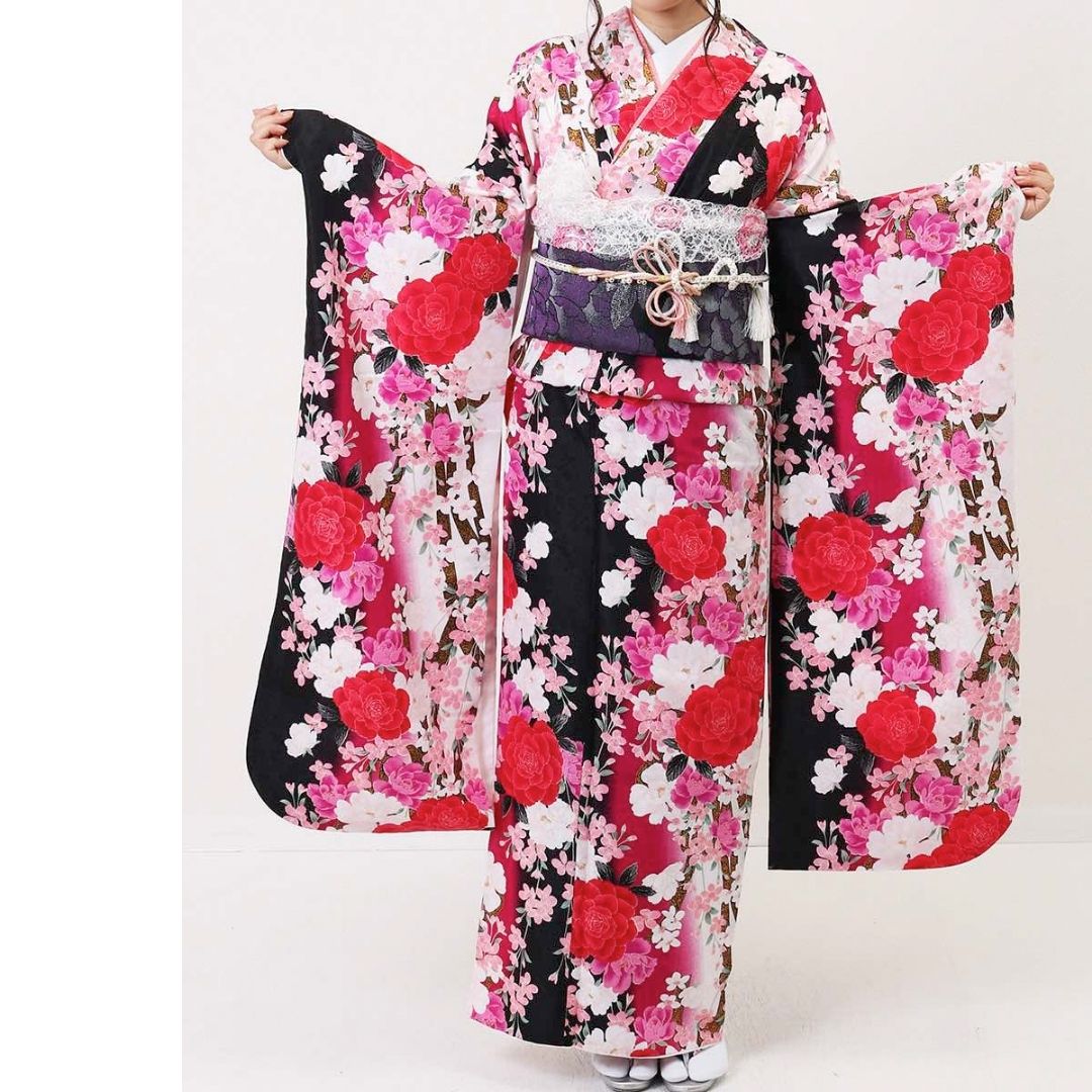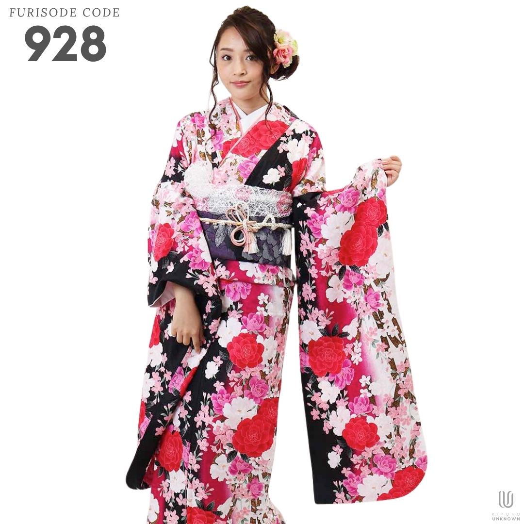 【対応身長155cm~170cm】成人式レンタル振袖フルセット-928 花柄 クール系 ポップキュート 赤系 ピンク系 黒系 総柄