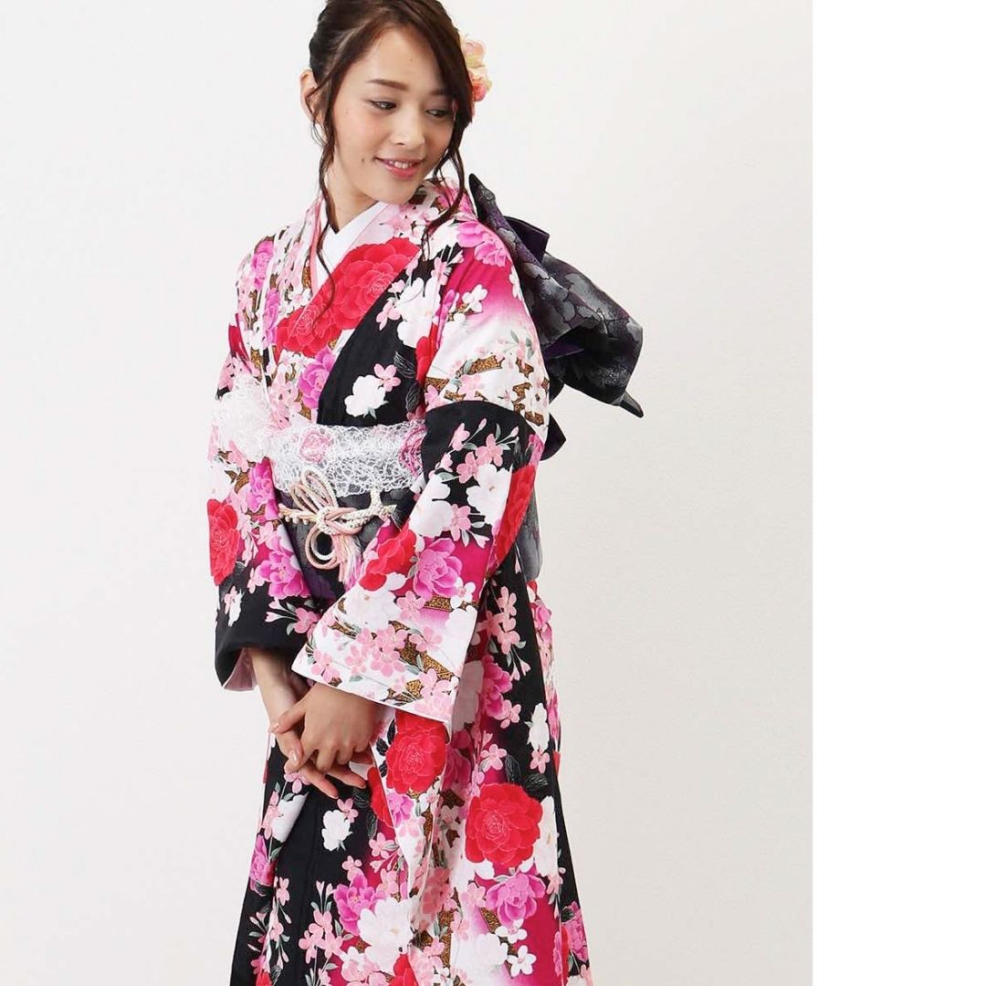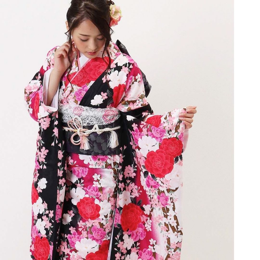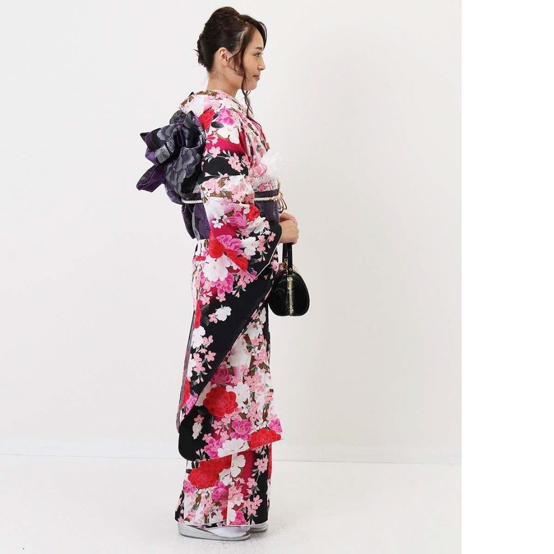 【対応身長155cm~170cm】成人式レンタル振袖フルセット-928 花柄 クール系 ポップキュート 赤系 ピンク系 黒系 総柄