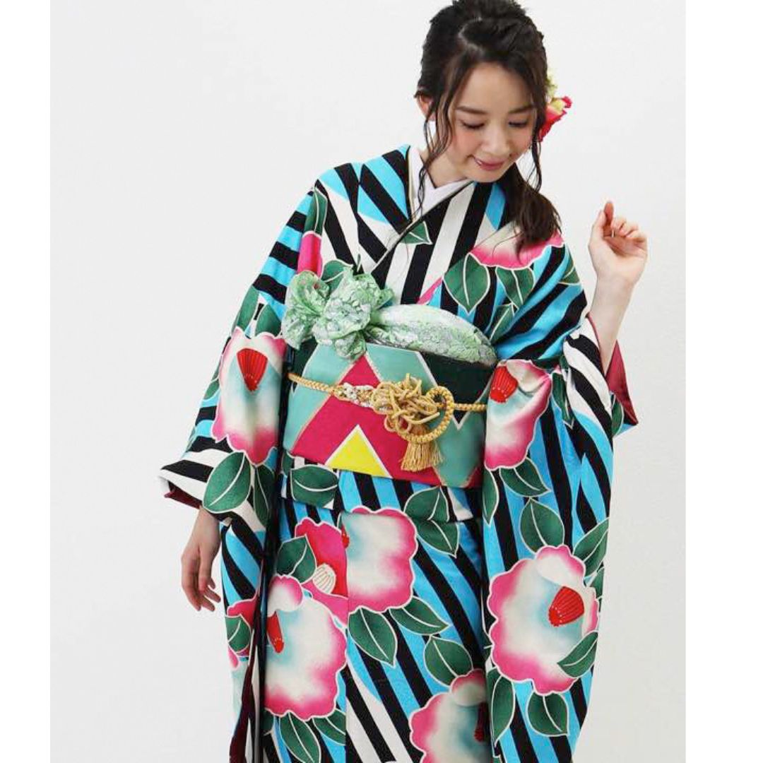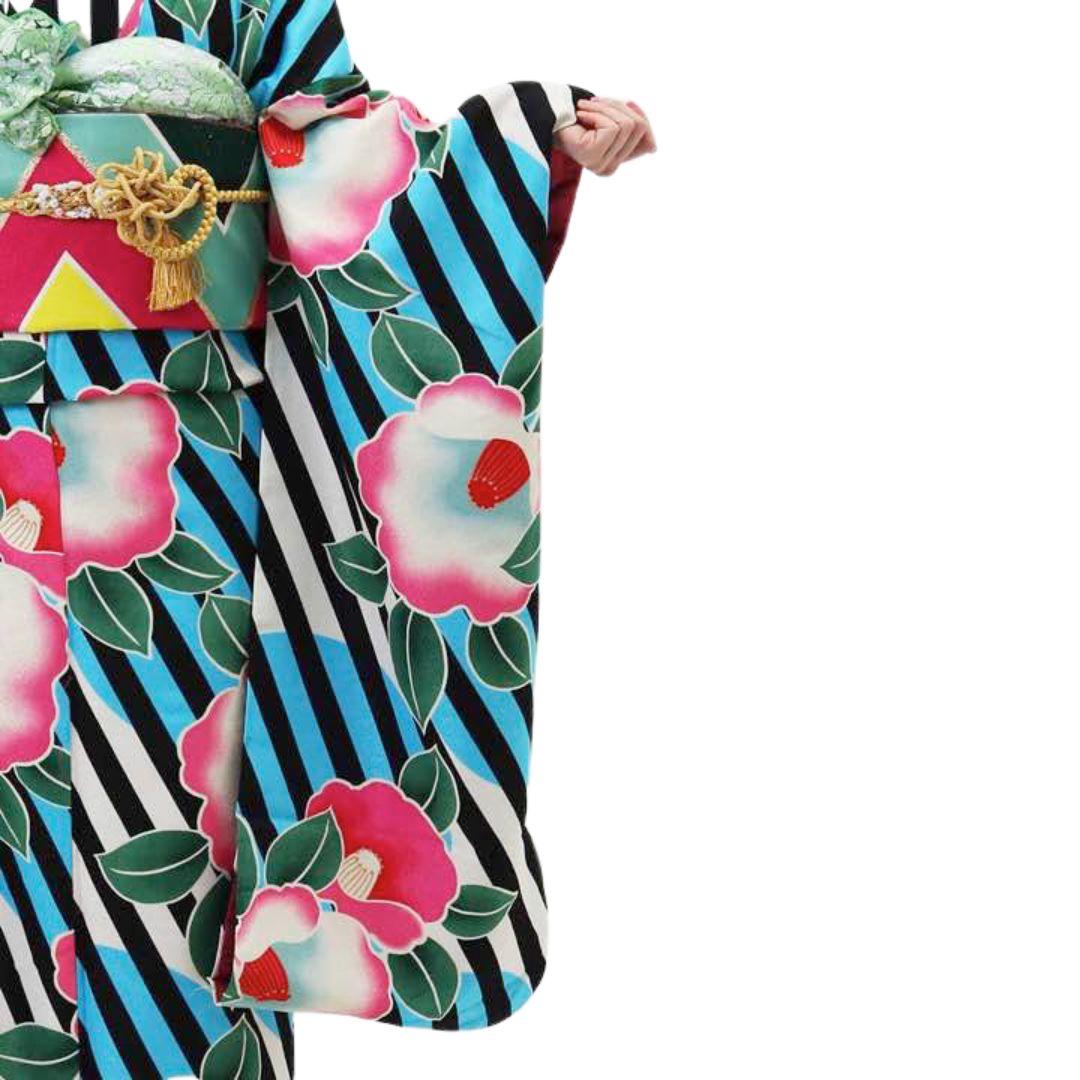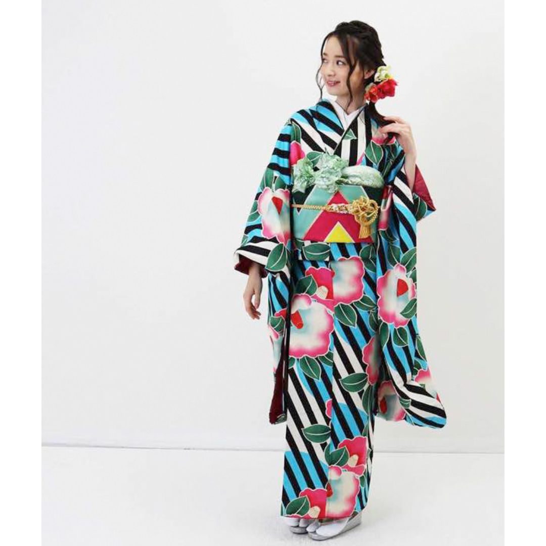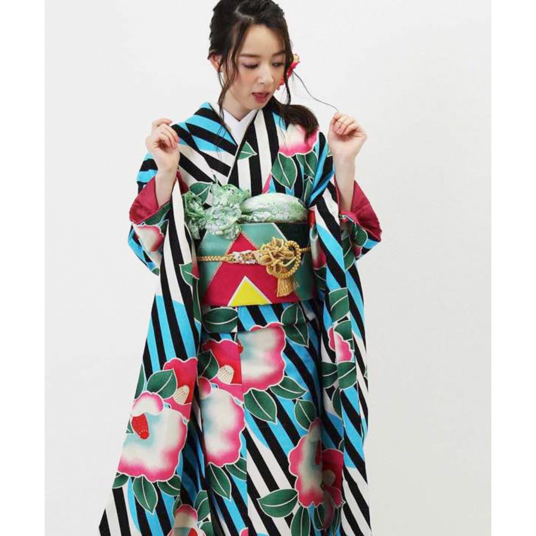 【対応身長155cm~170cm】【ポップ・キュート】【合繊】成人式レンタル振袖フルセット-944 ポップキュート ストライプ グリーン 水色 ピンク 椿