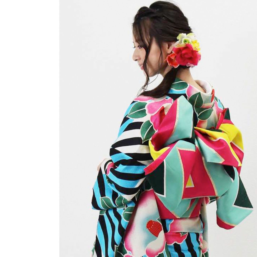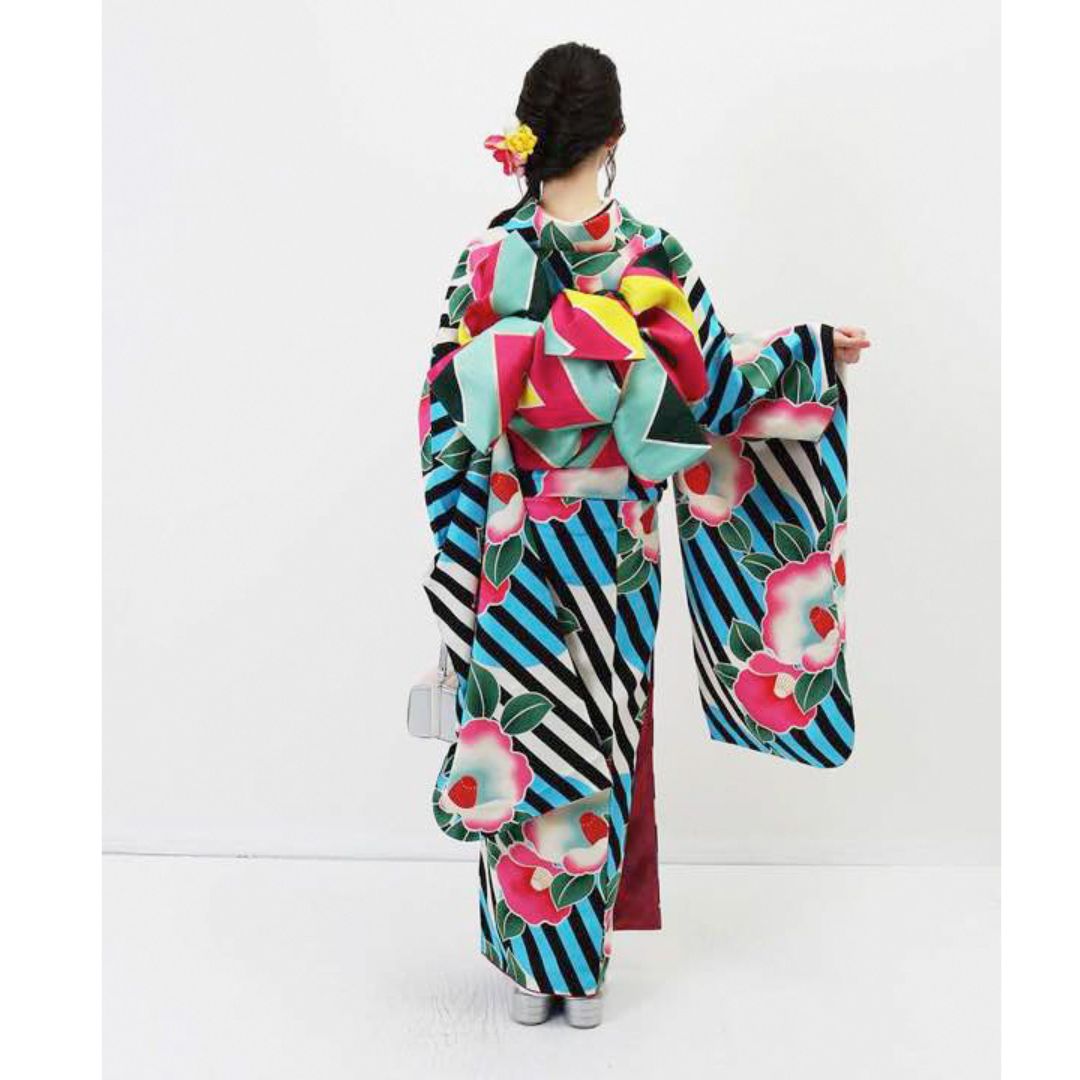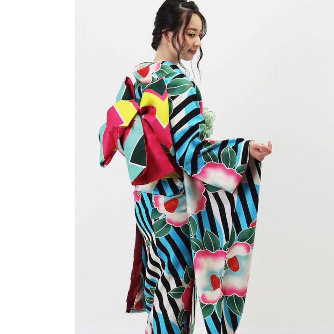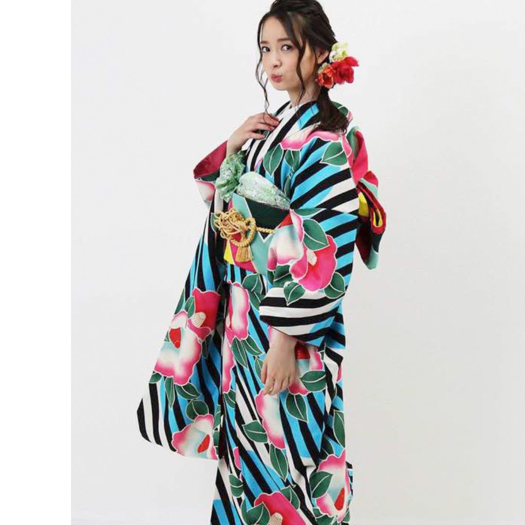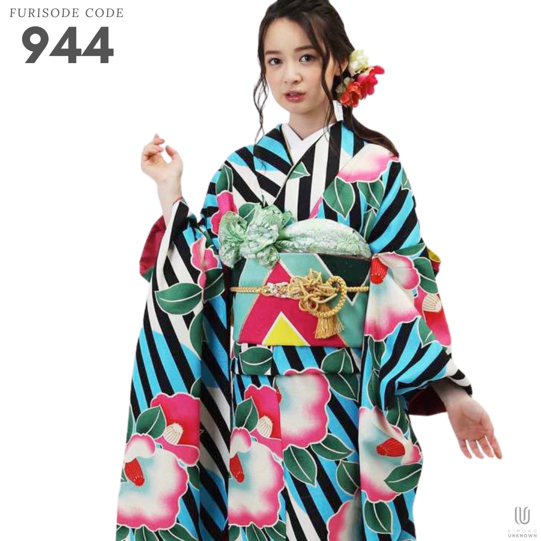 【対応身長155cm~170cm】【ポップ・キュート】【合繊】成人式レンタル振袖フルセット-944 ポップキュート ストライプ グリーン 水色 ピンク 椿