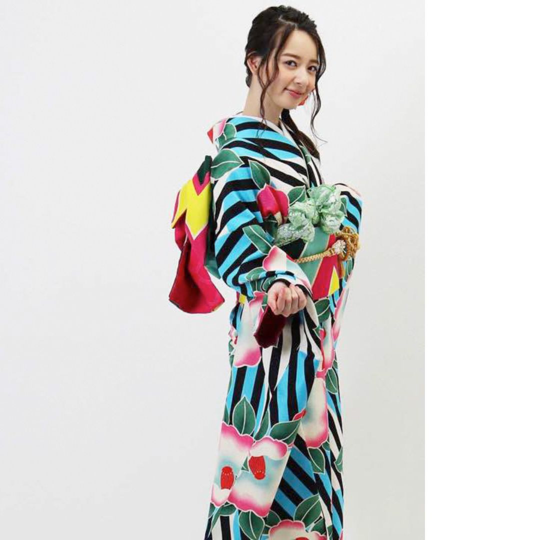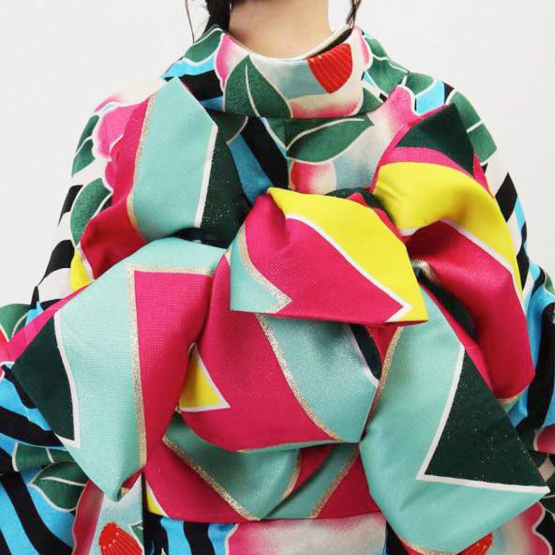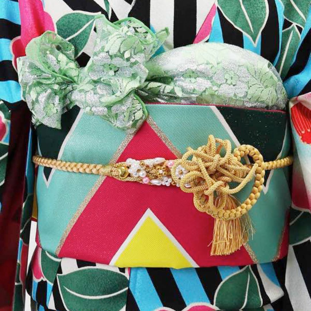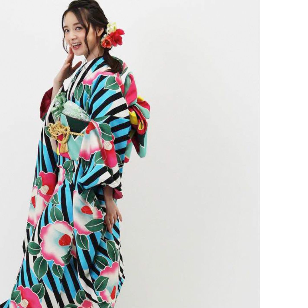 【対応身長155cm~170cm】【ポップ・キュート】【合繊】成人式レンタル振袖フルセット-944 ポップキュート ストライプ グリーン 水色 ピンク 椿