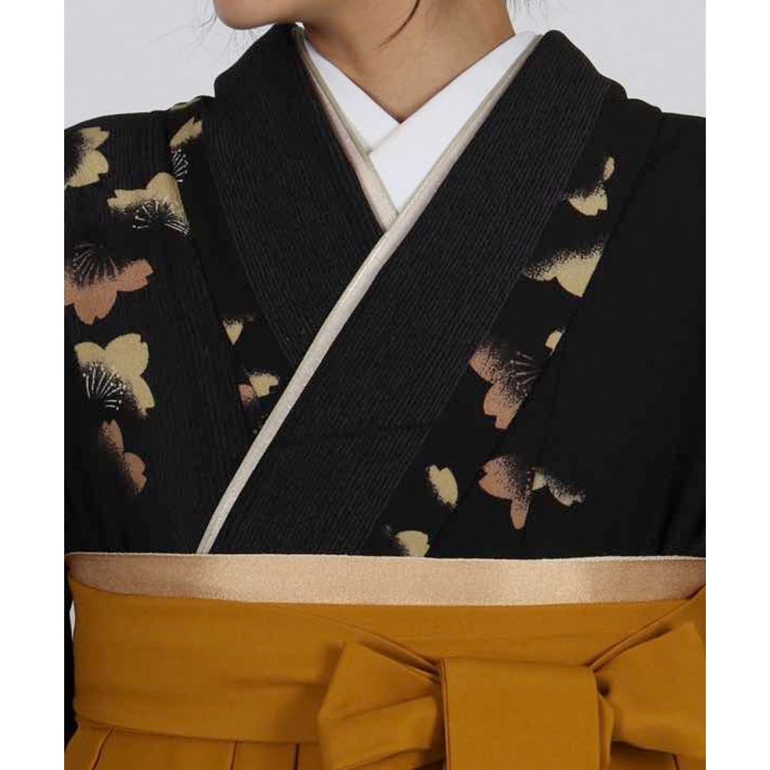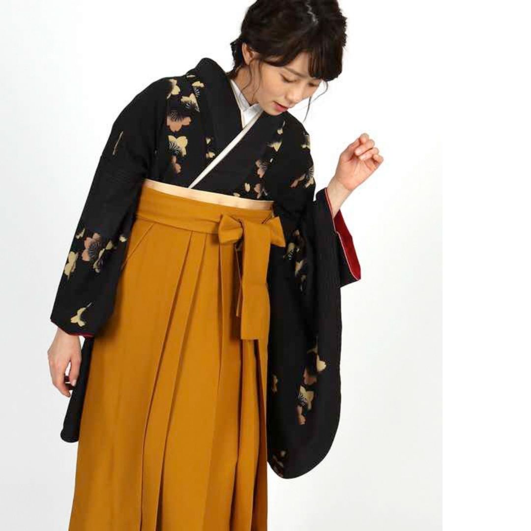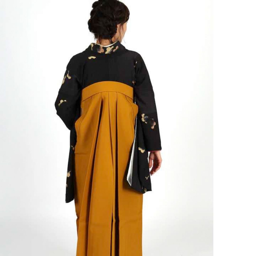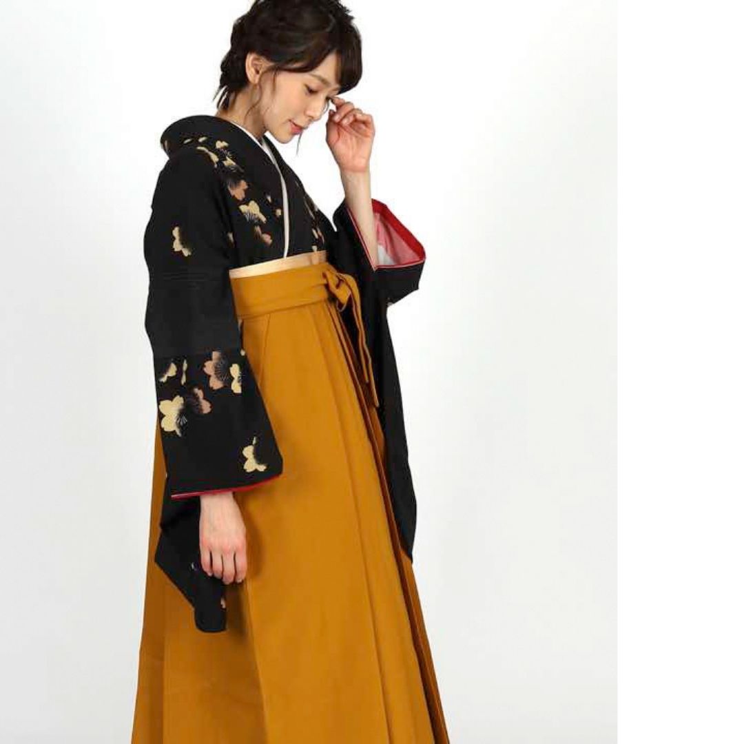 【対応身長 157cm~165cm】 卒業式レンタル袴フルセット-1006 花柄 黒 からし色