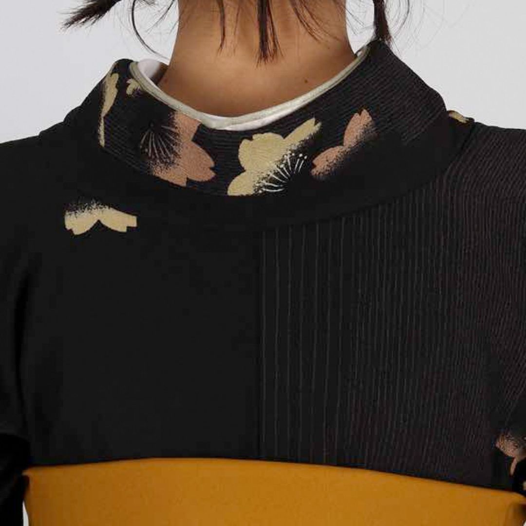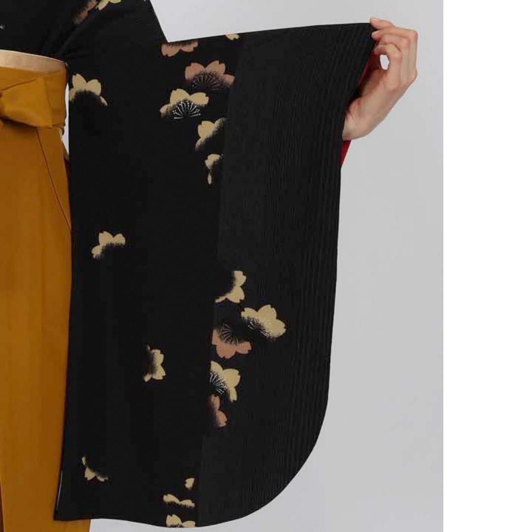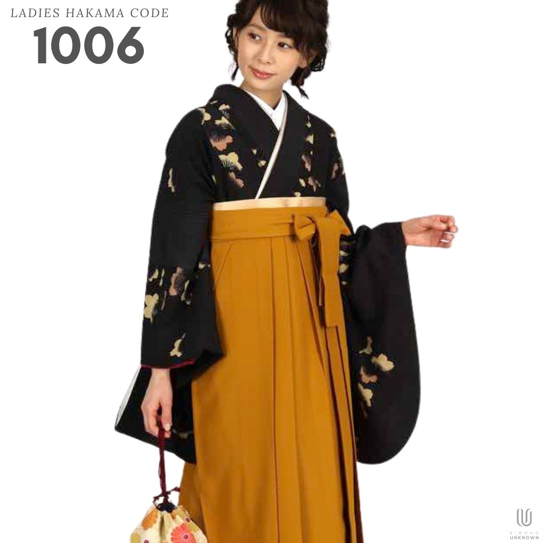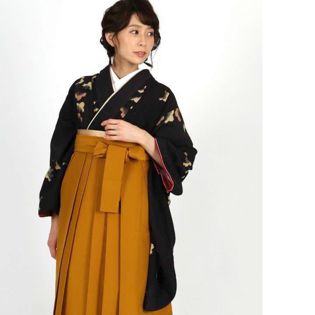 【対応身長 157cm~165cm】 卒業式レンタル袴フルセット-1006 花柄 黒 からし色