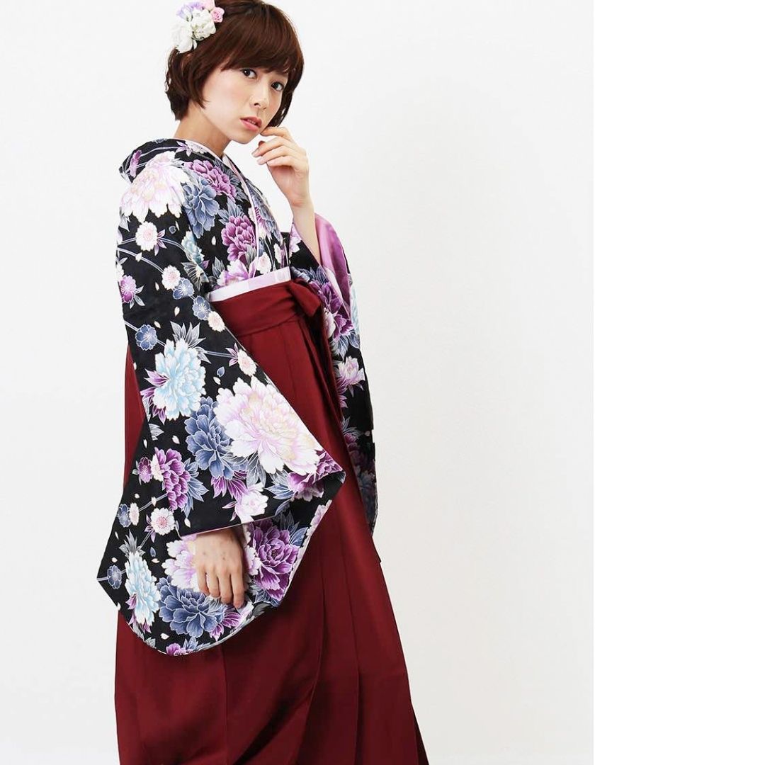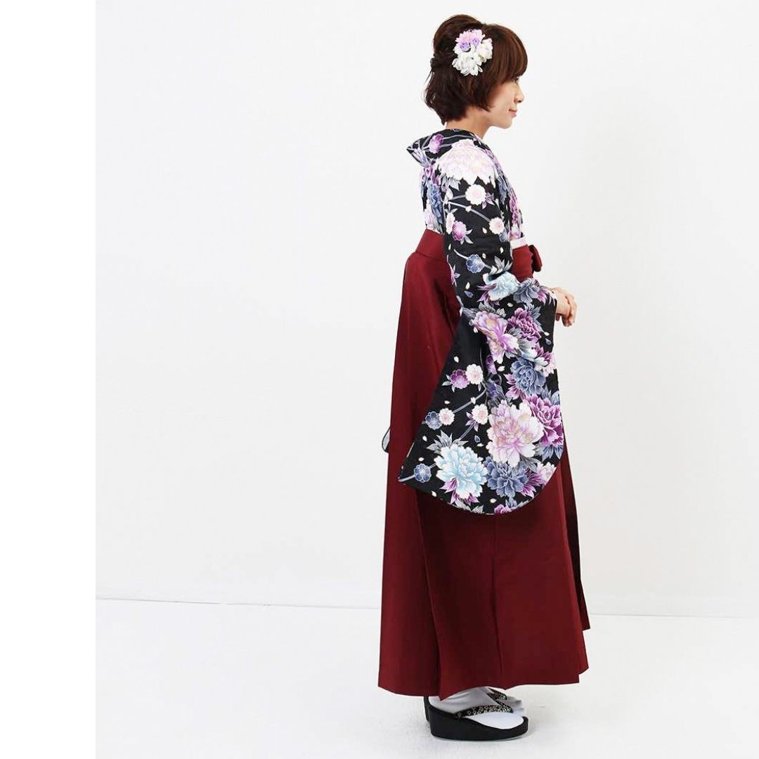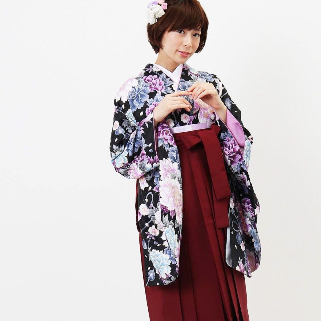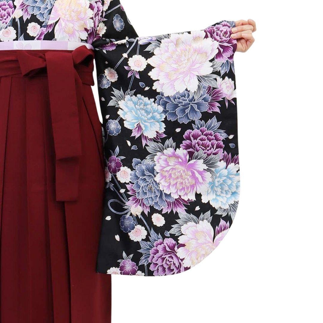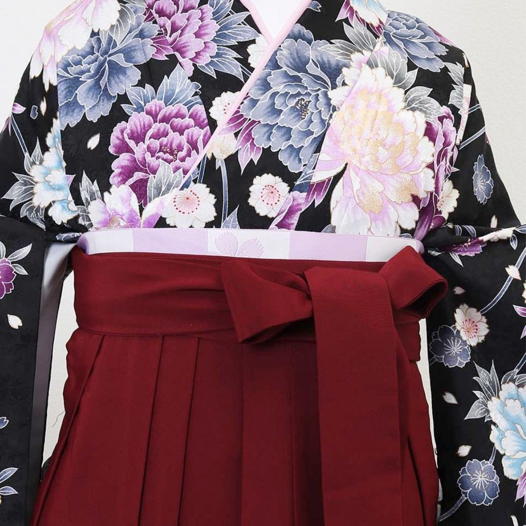 【対応身長 157cm~165cm】【正統派】 卒業式レンタル袴フルセット-1045 マルチカラー 花柄 牡丹 黒 臙脂
