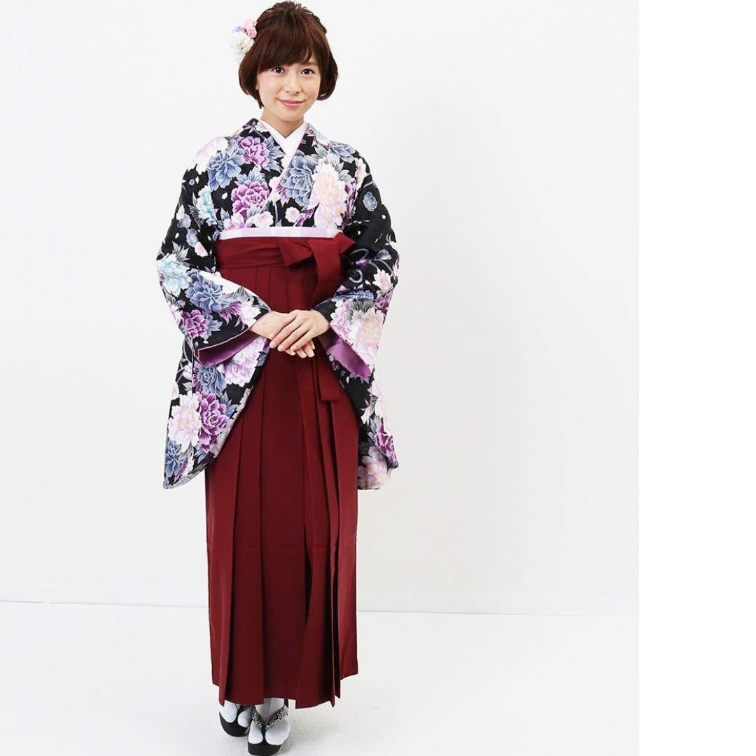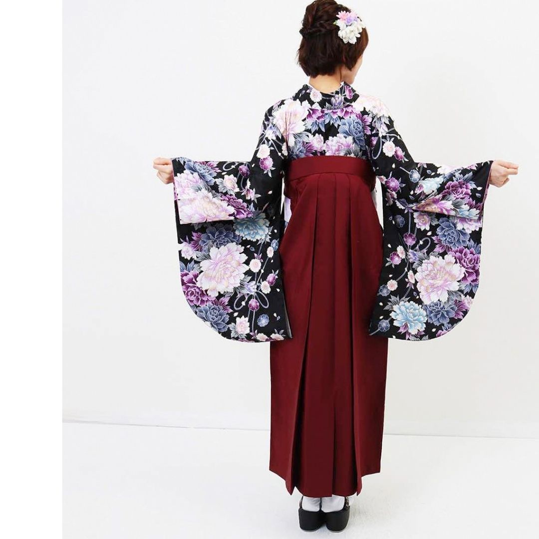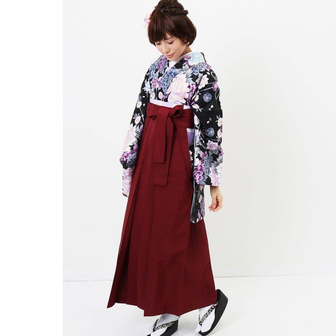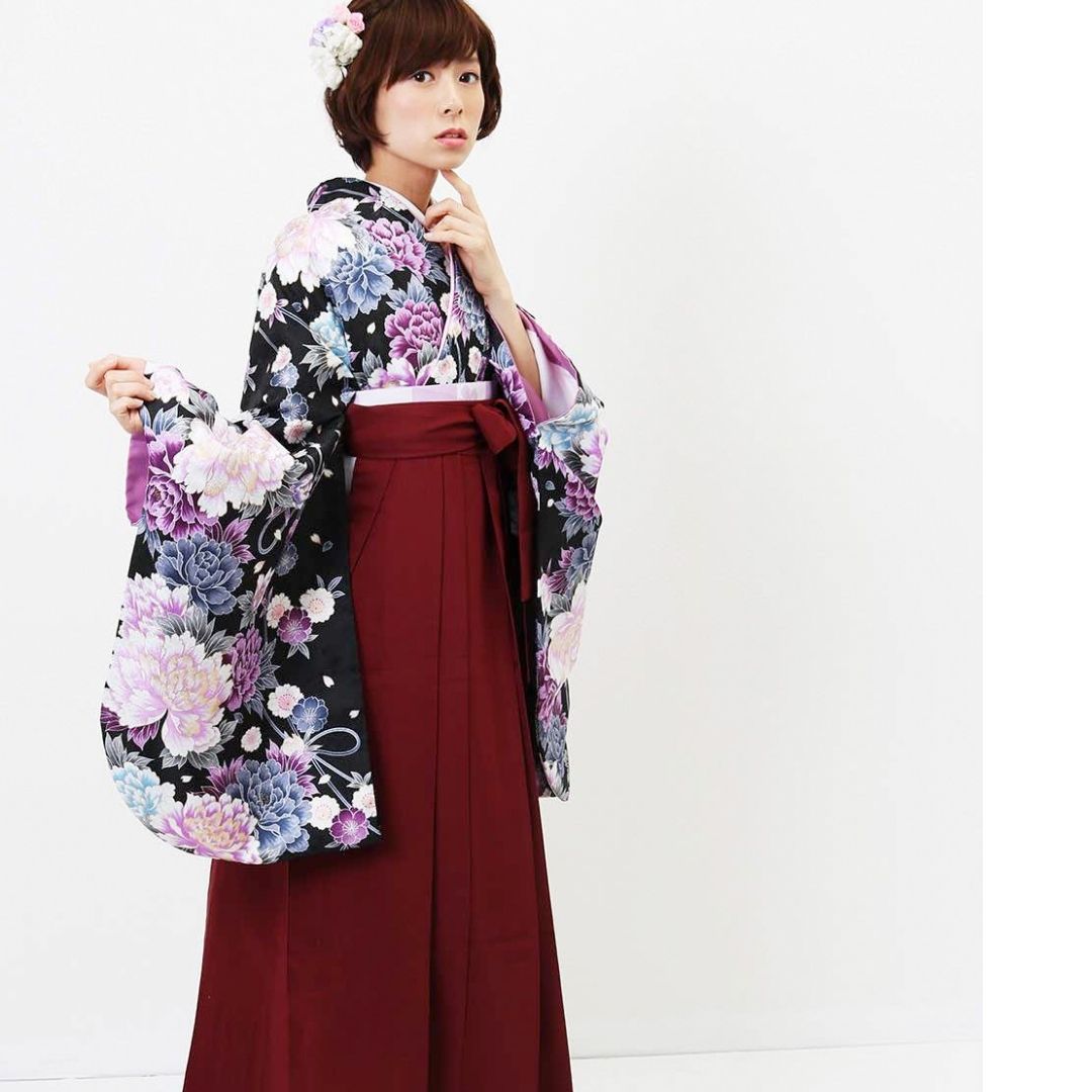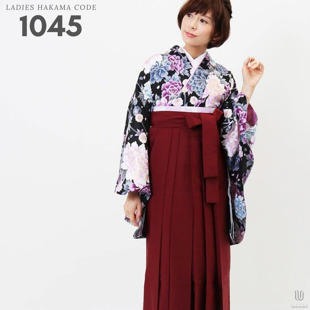 【対応身長 157cm~165cm】【正統派】 卒業式レンタル袴フルセット-1045 マルチカラー 花柄 牡丹 黒 臙脂