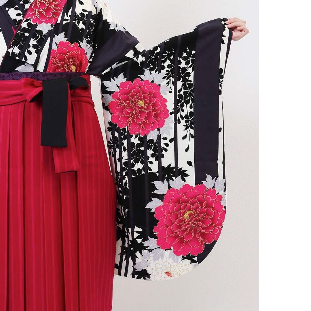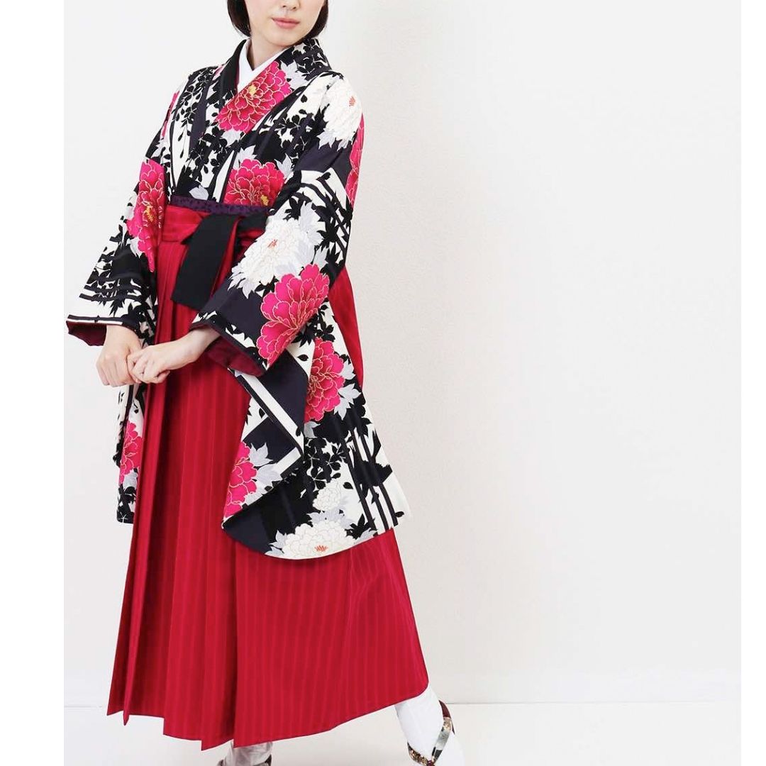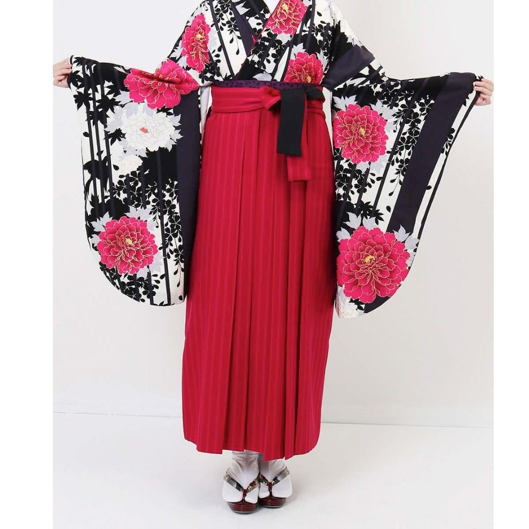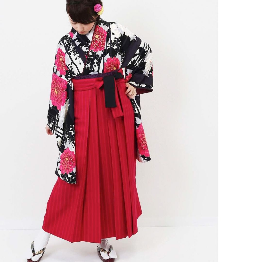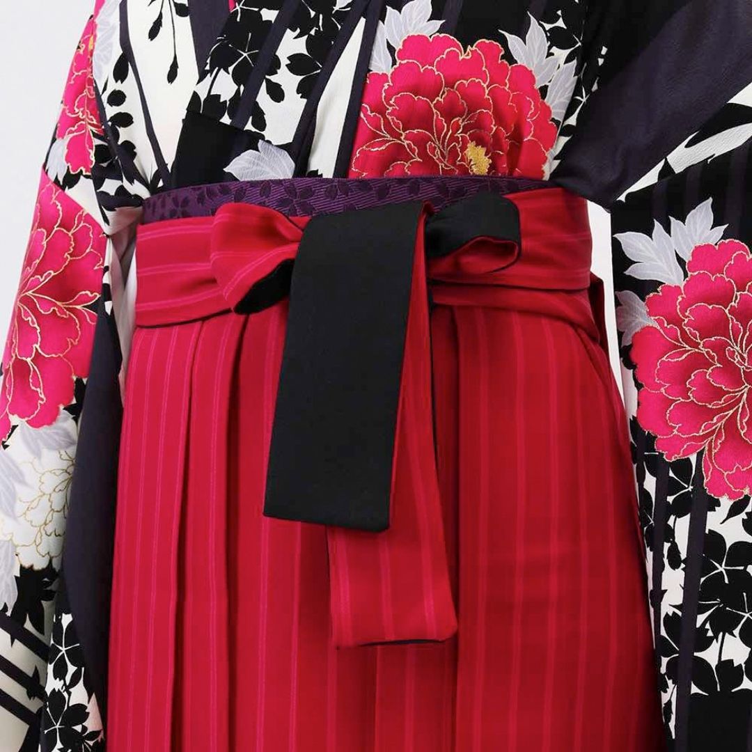 【対応身長 157cm~165cm】【キュート】 卒業式レンタル袴フルセット-1207 マルチカラー 花柄 牡丹 ストライプ ピンク 黒