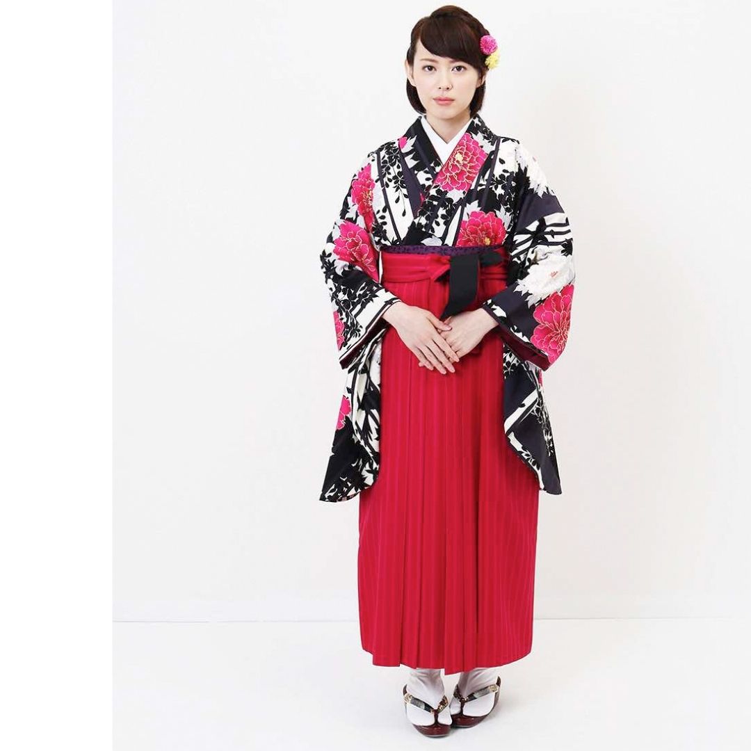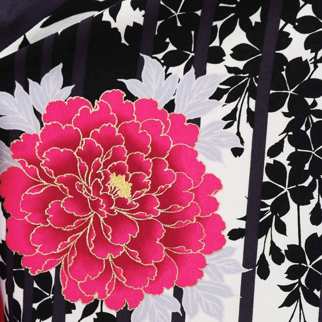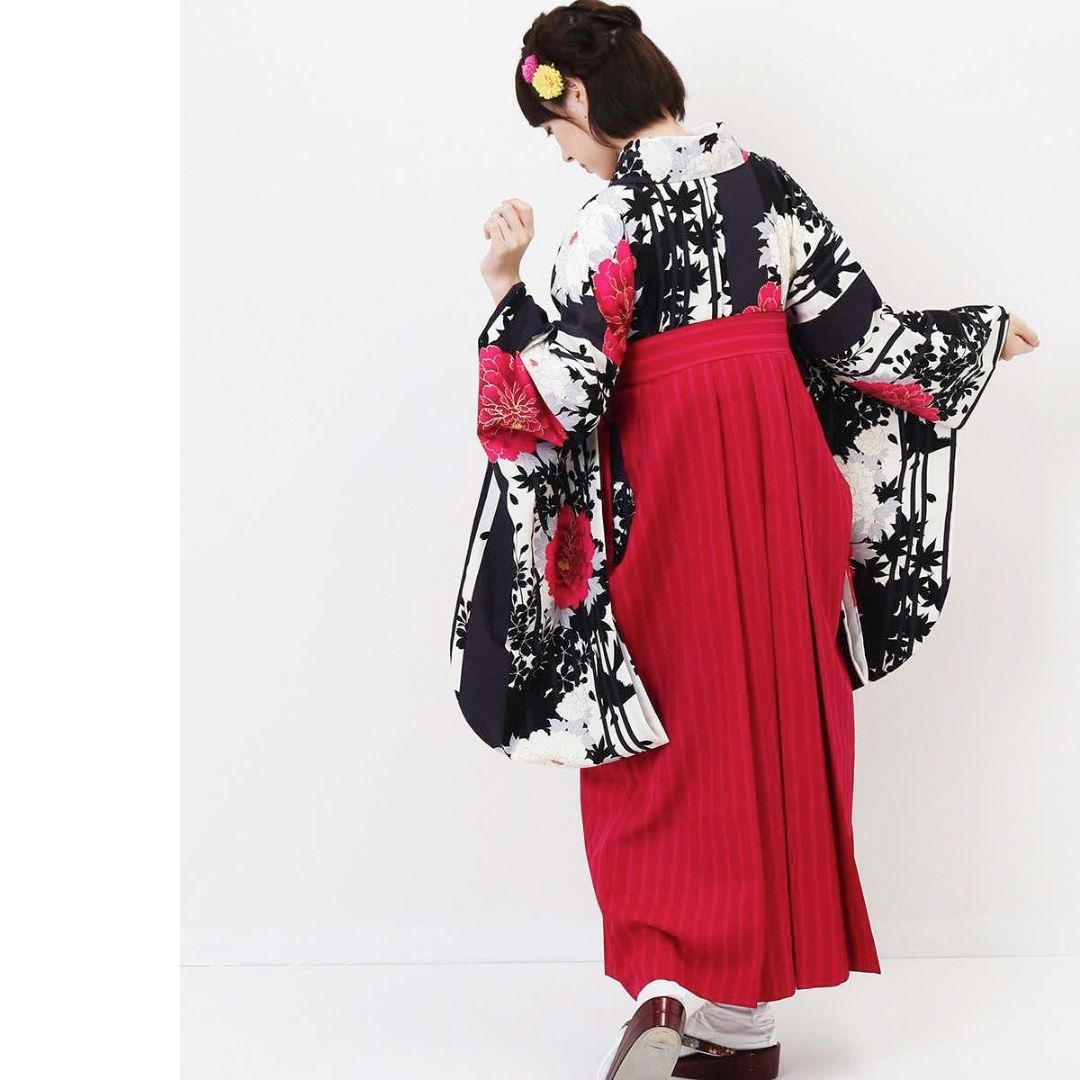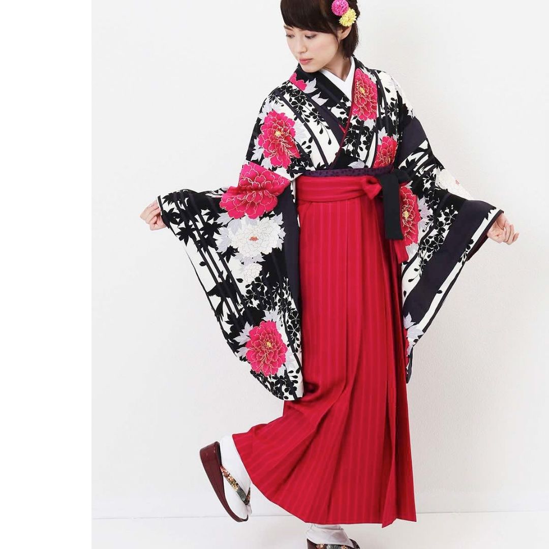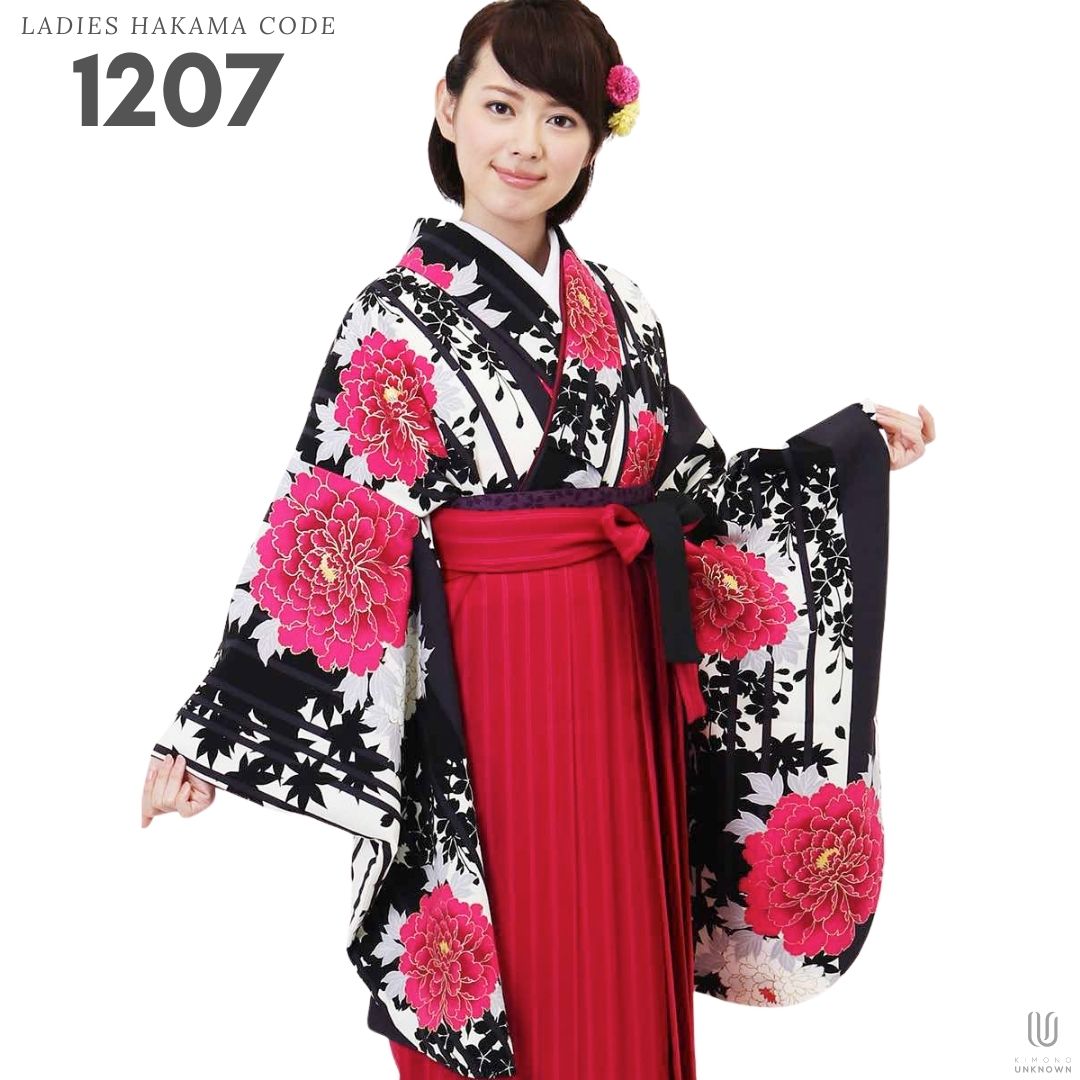 【対応身長 157cm~165cm】【キュート】 卒業式レンタル袴フルセット-1207 マルチカラー 花柄 牡丹 ストライプ ピンク 黒