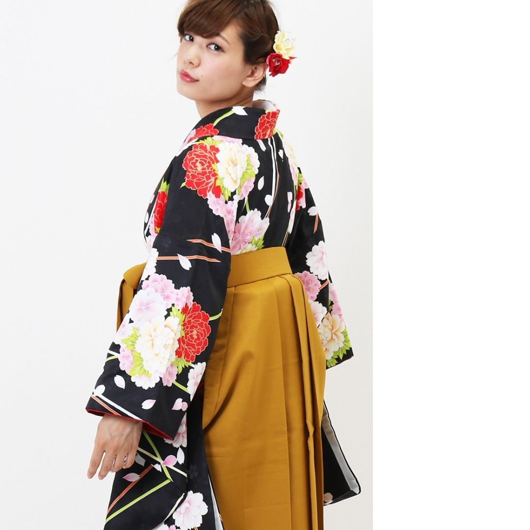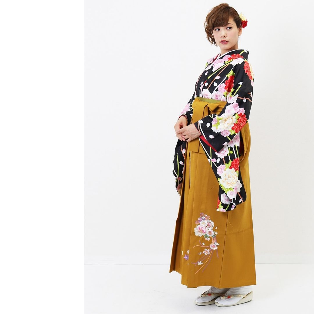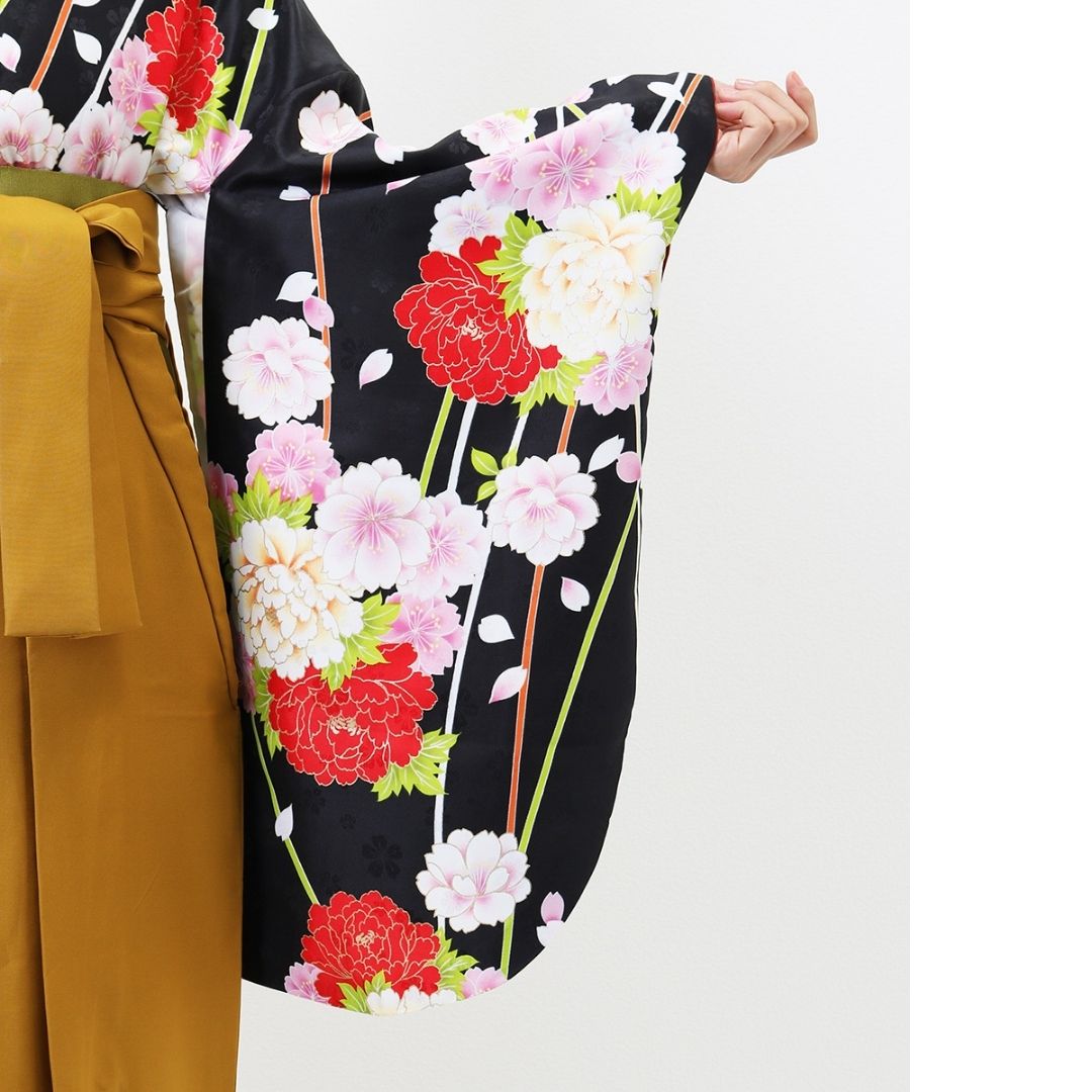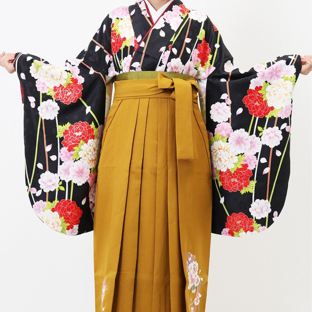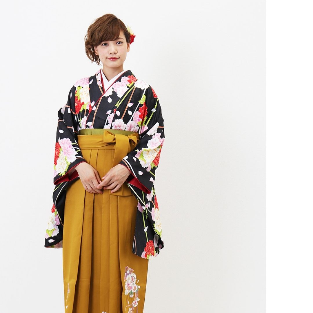 【対応身長 157cm~165cm】【正統派】 卒業式レンタル袴フルセット-1263 マルチカラー 花柄 牡丹 黒 ピンク 白 からし色
