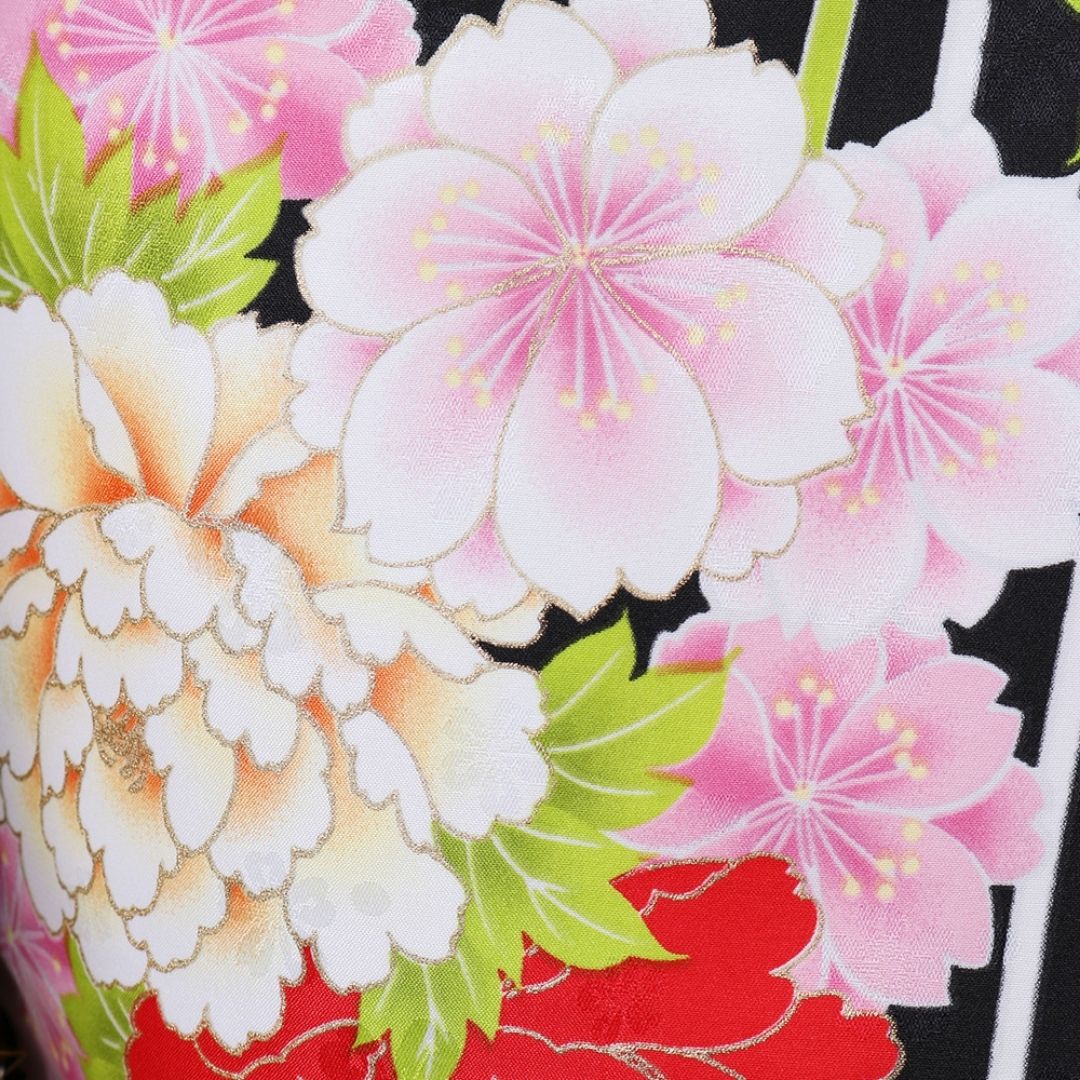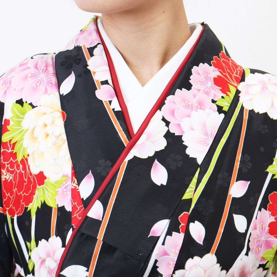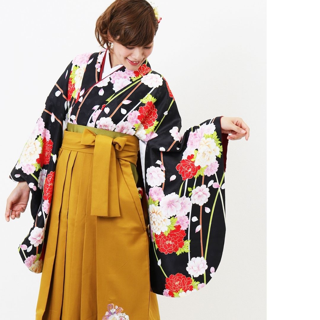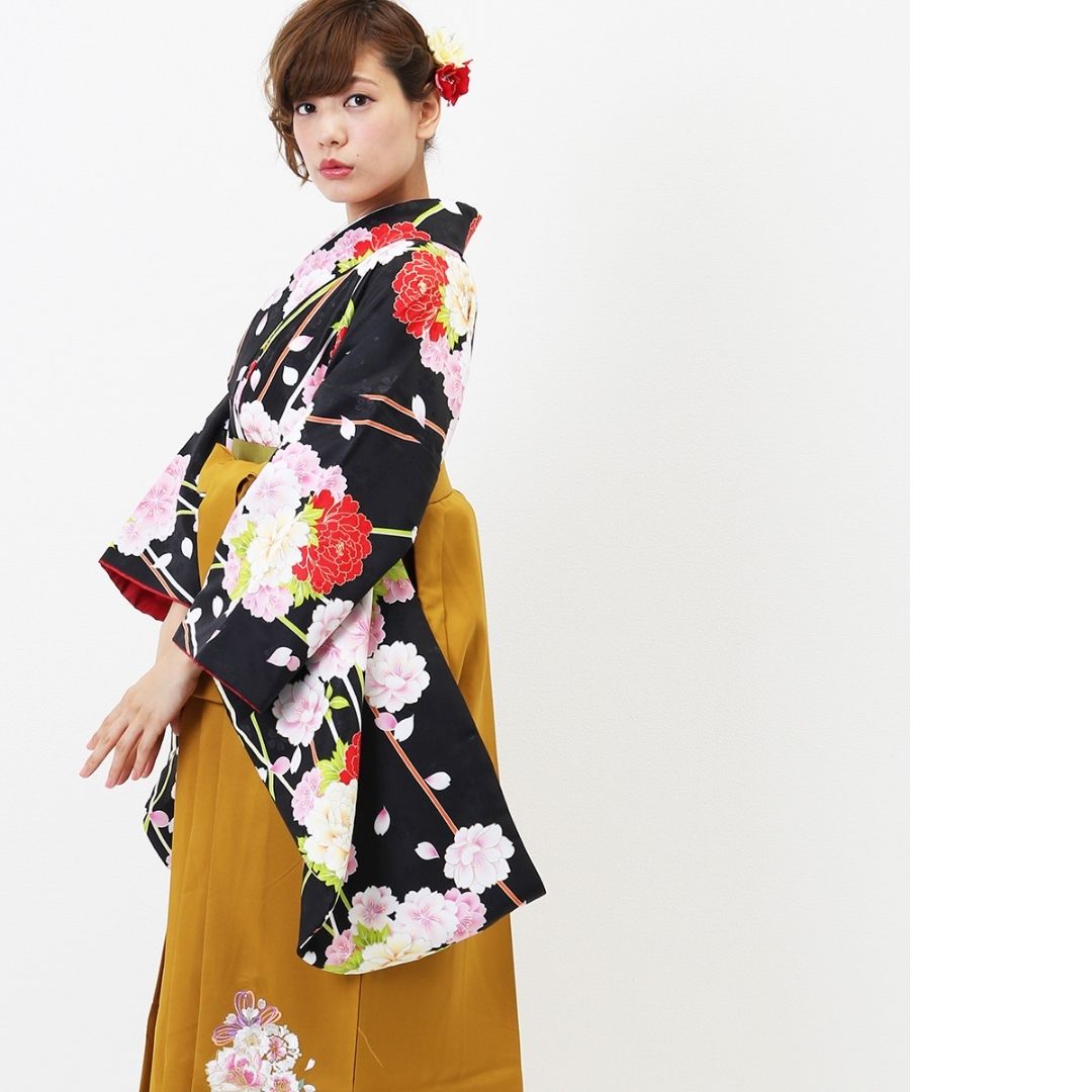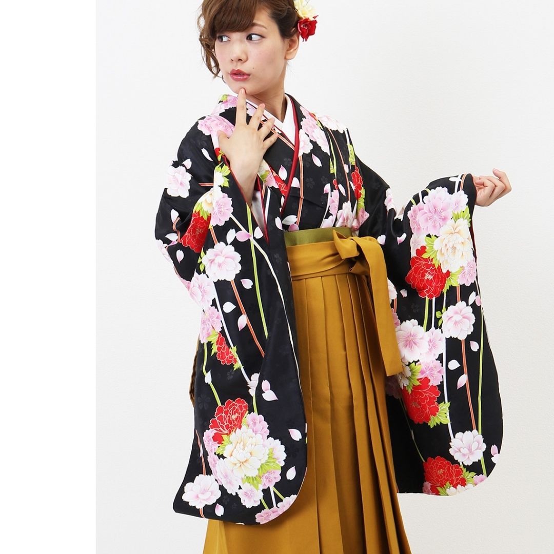 【対応身長 157cm~165cm】【正統派】 卒業式レンタル袴フルセット-1263 マルチカラー 花柄 牡丹 黒 ピンク 白 からし色