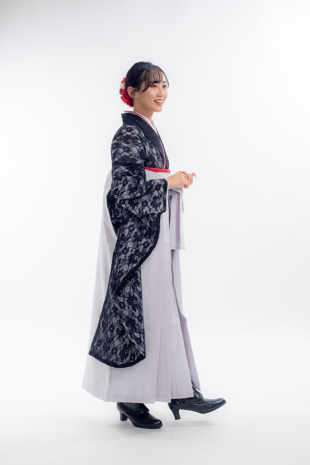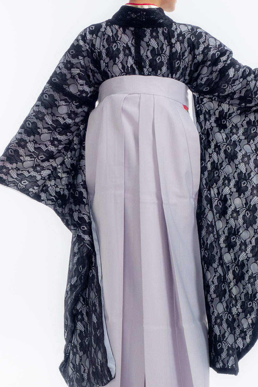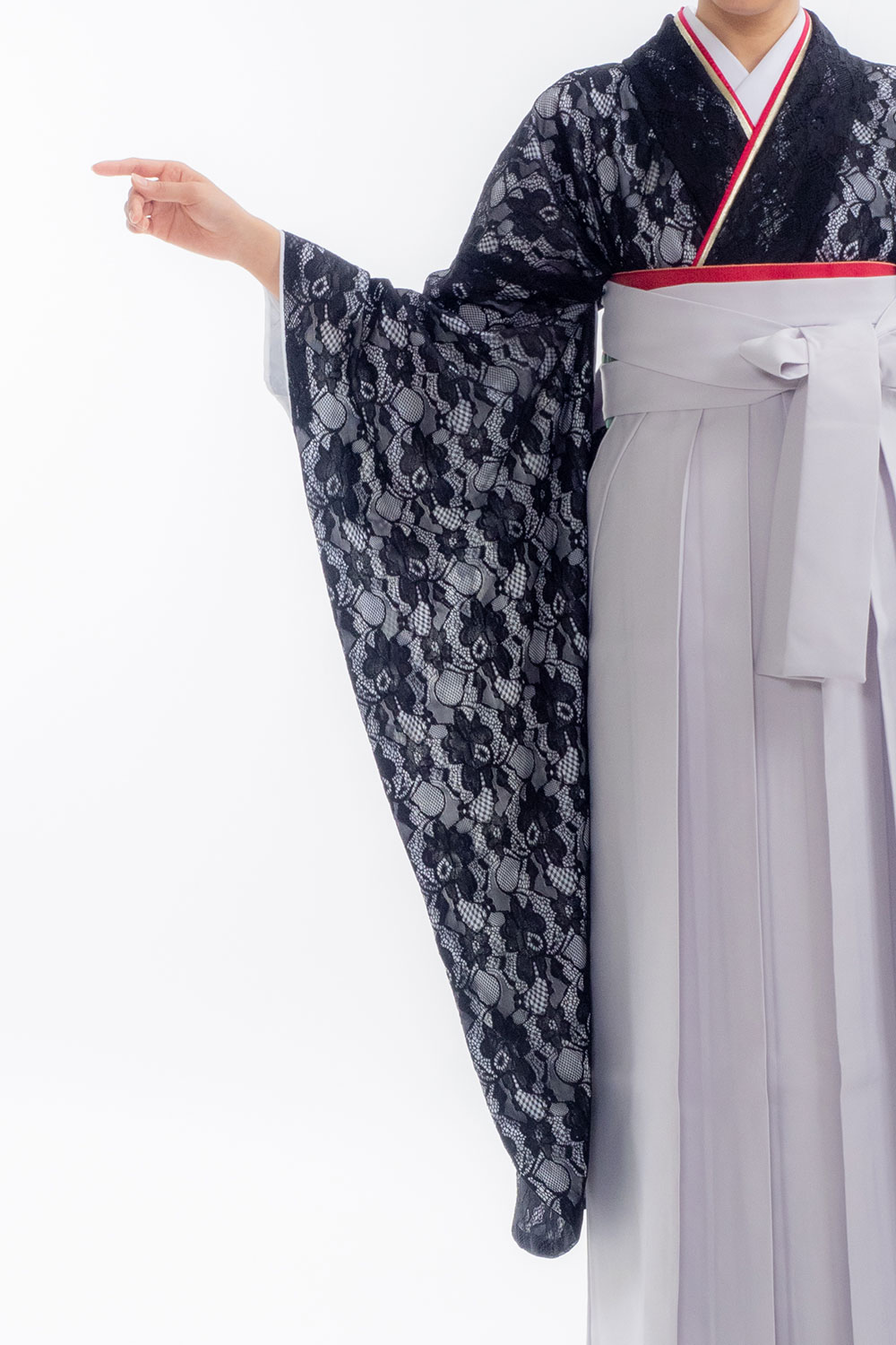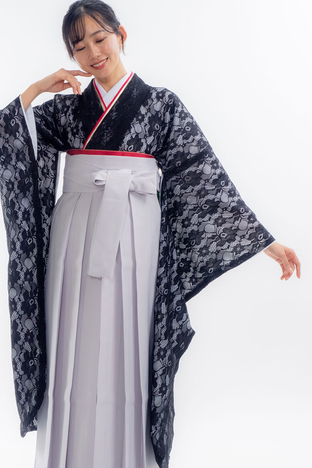 【対応身長 157cm~165cm】【キュート】卒業式レンタル袴フルセット-2027 レース着物 黒地 無地袴 グレー
