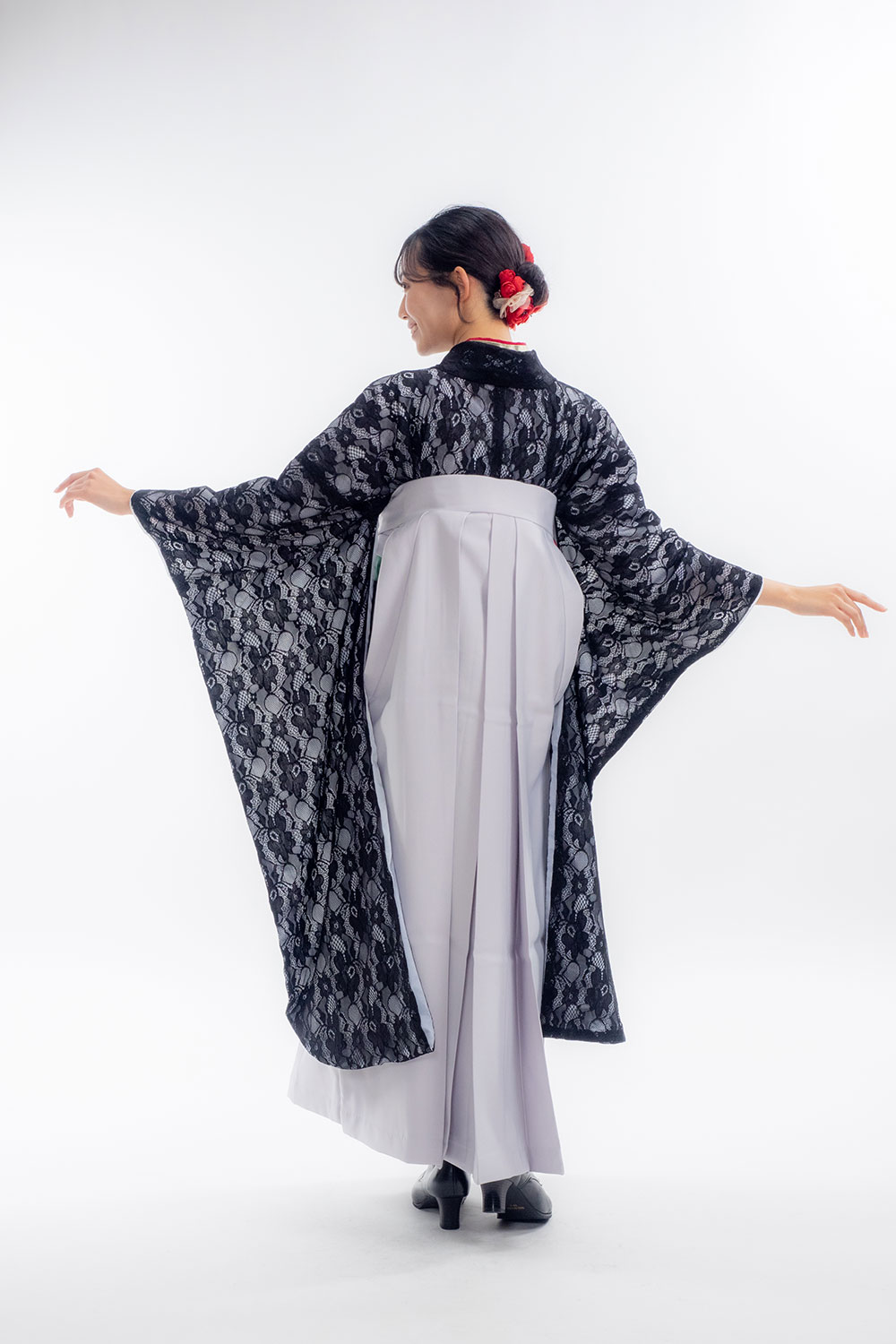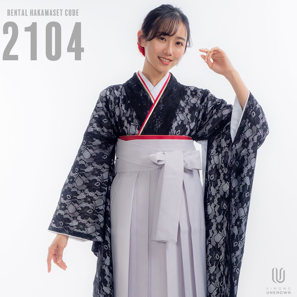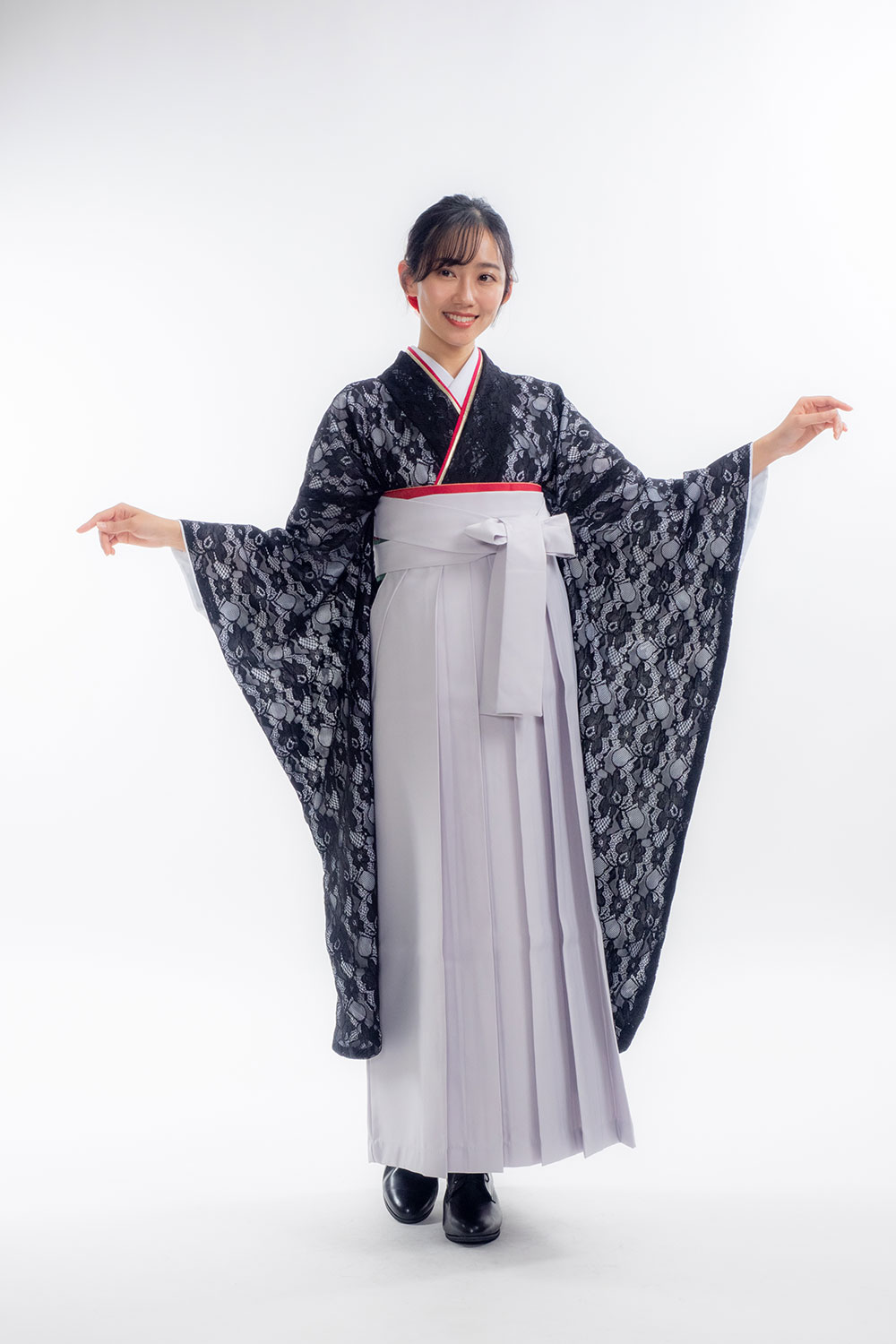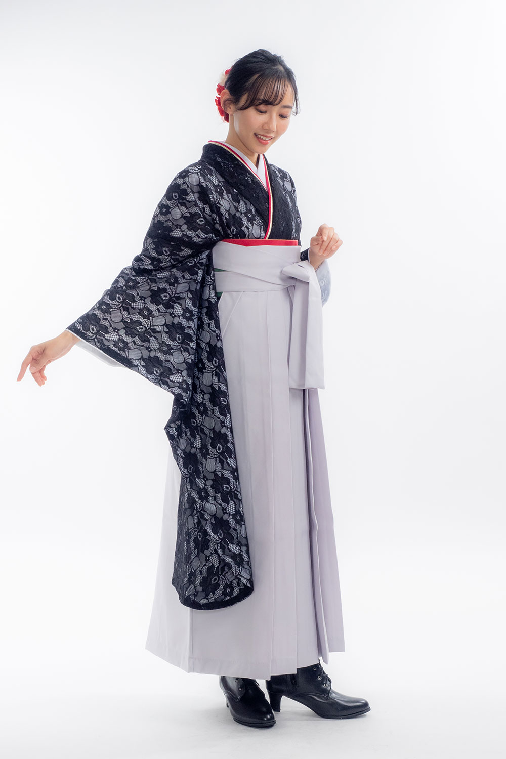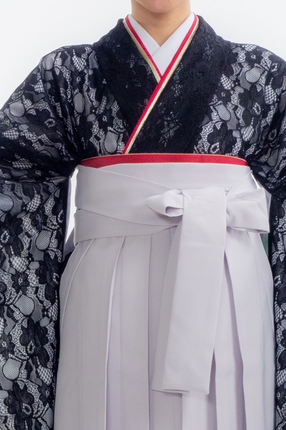【対応身長 150cm~157cm】【キュート】卒業式レンタル袴フルセット-2104【振袖タイプ】レース着物 黒地 無地袴 グレー