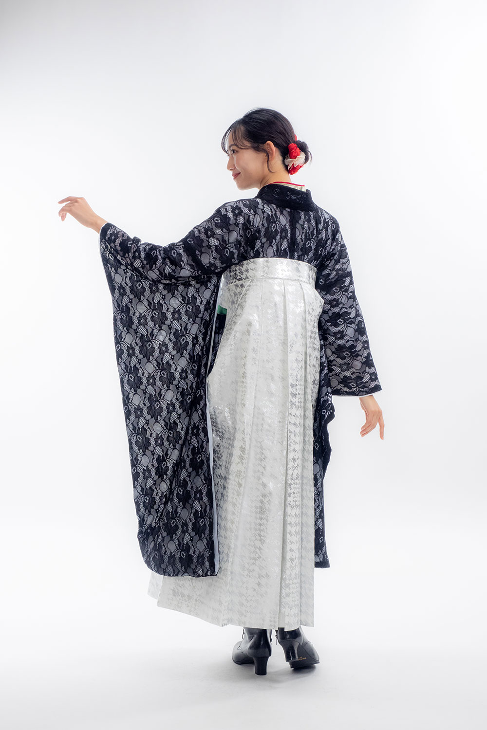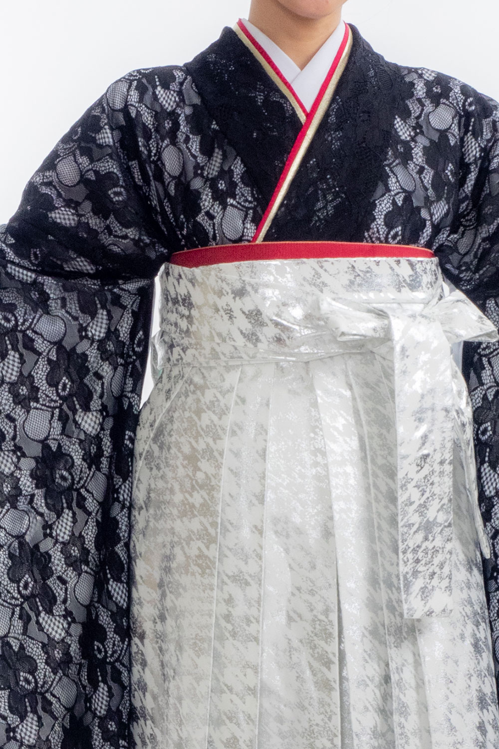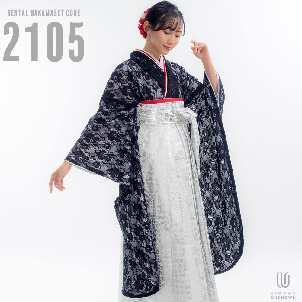 【対応身長 150cm~157cm】【キュート】卒業式レンタル袴フルセット-2105【振袖タイプ】レース着物 黒地 夢助 箔袴 白銀