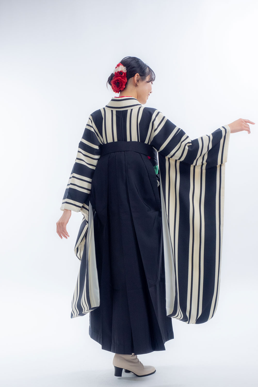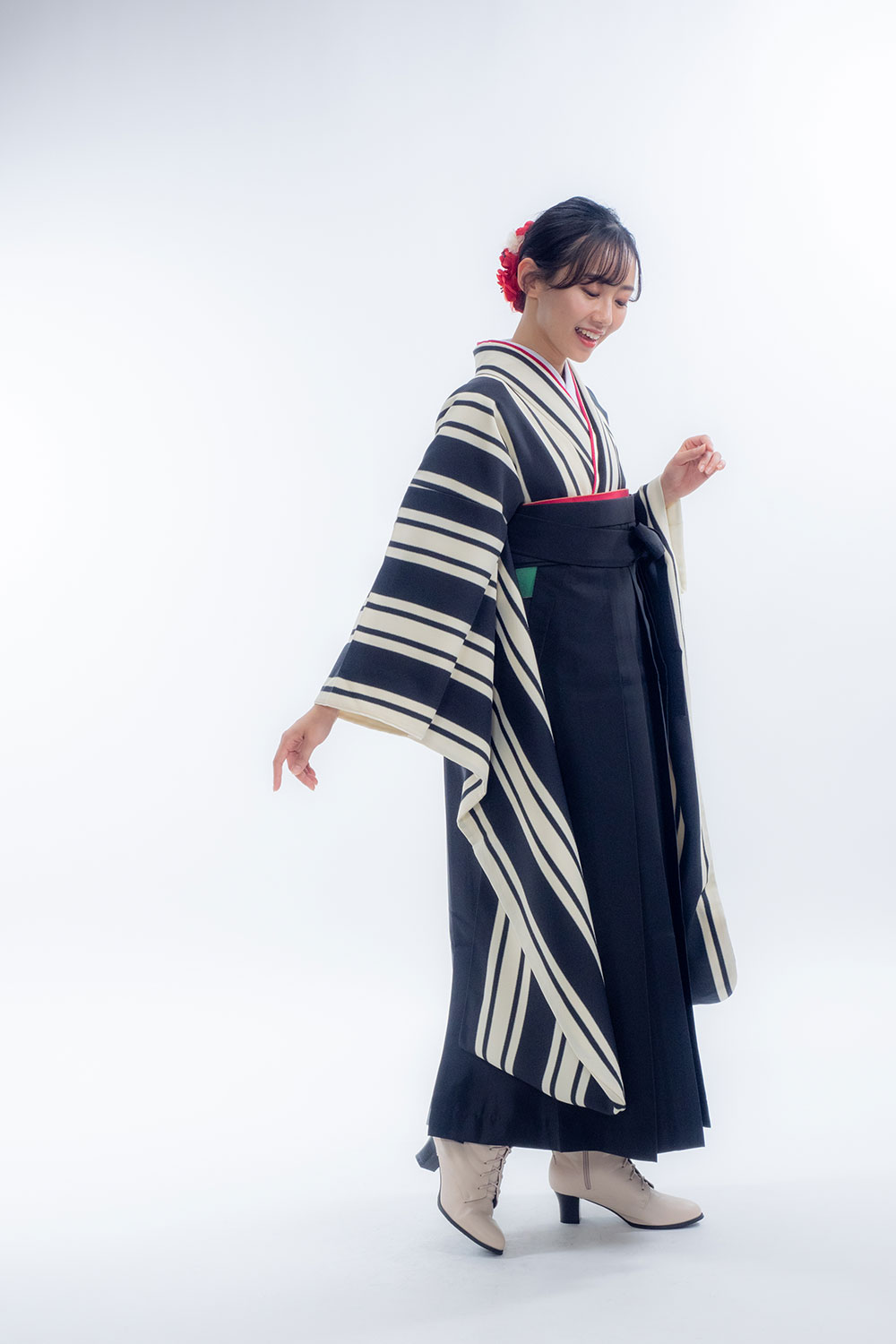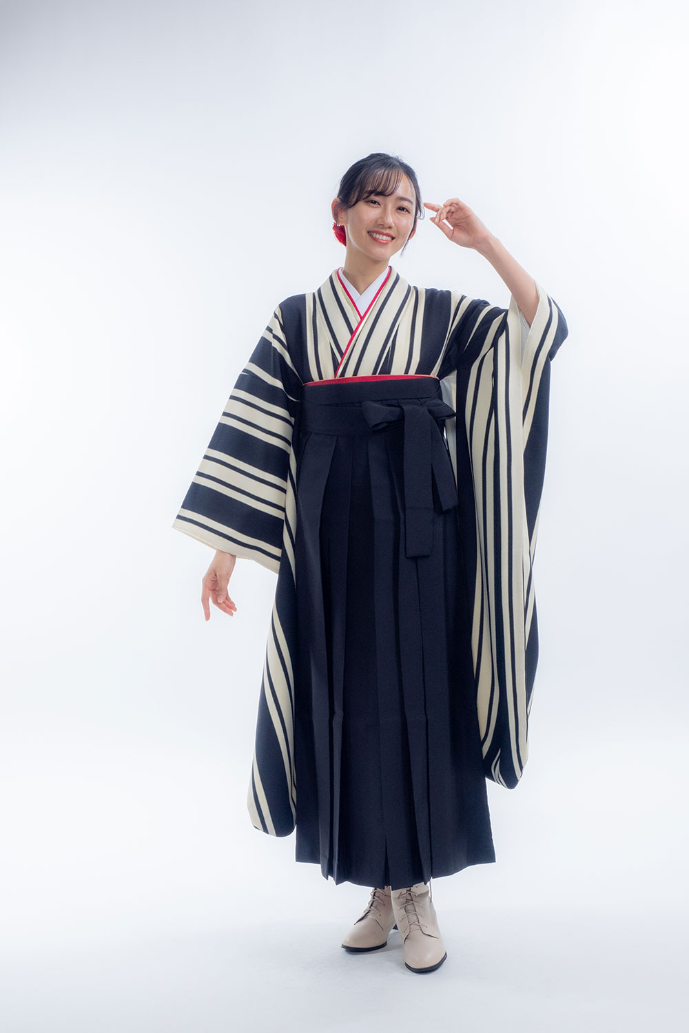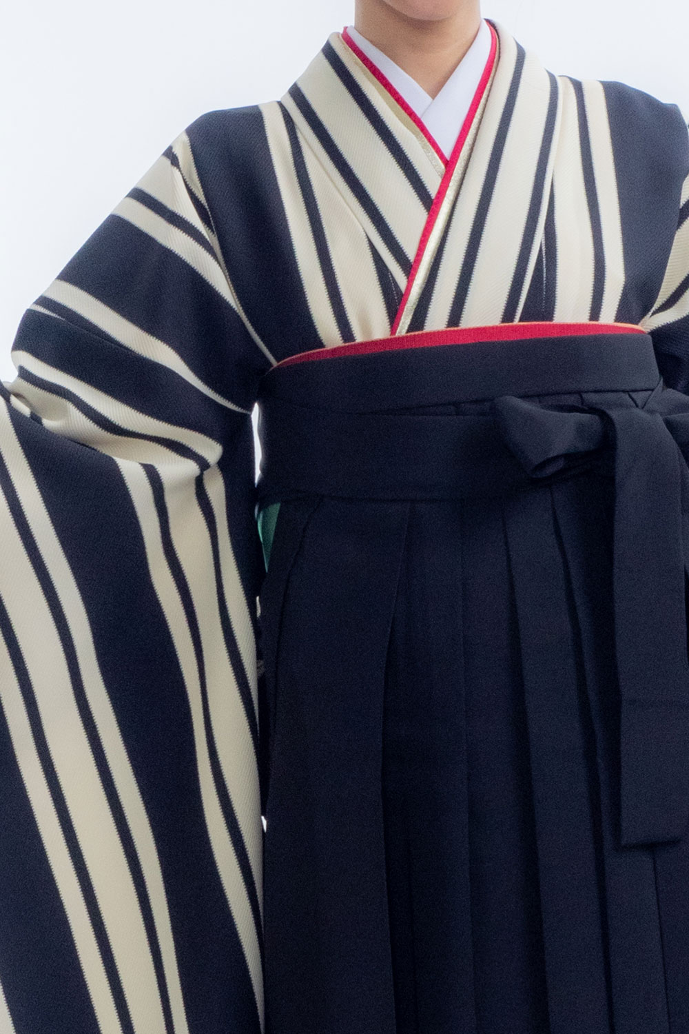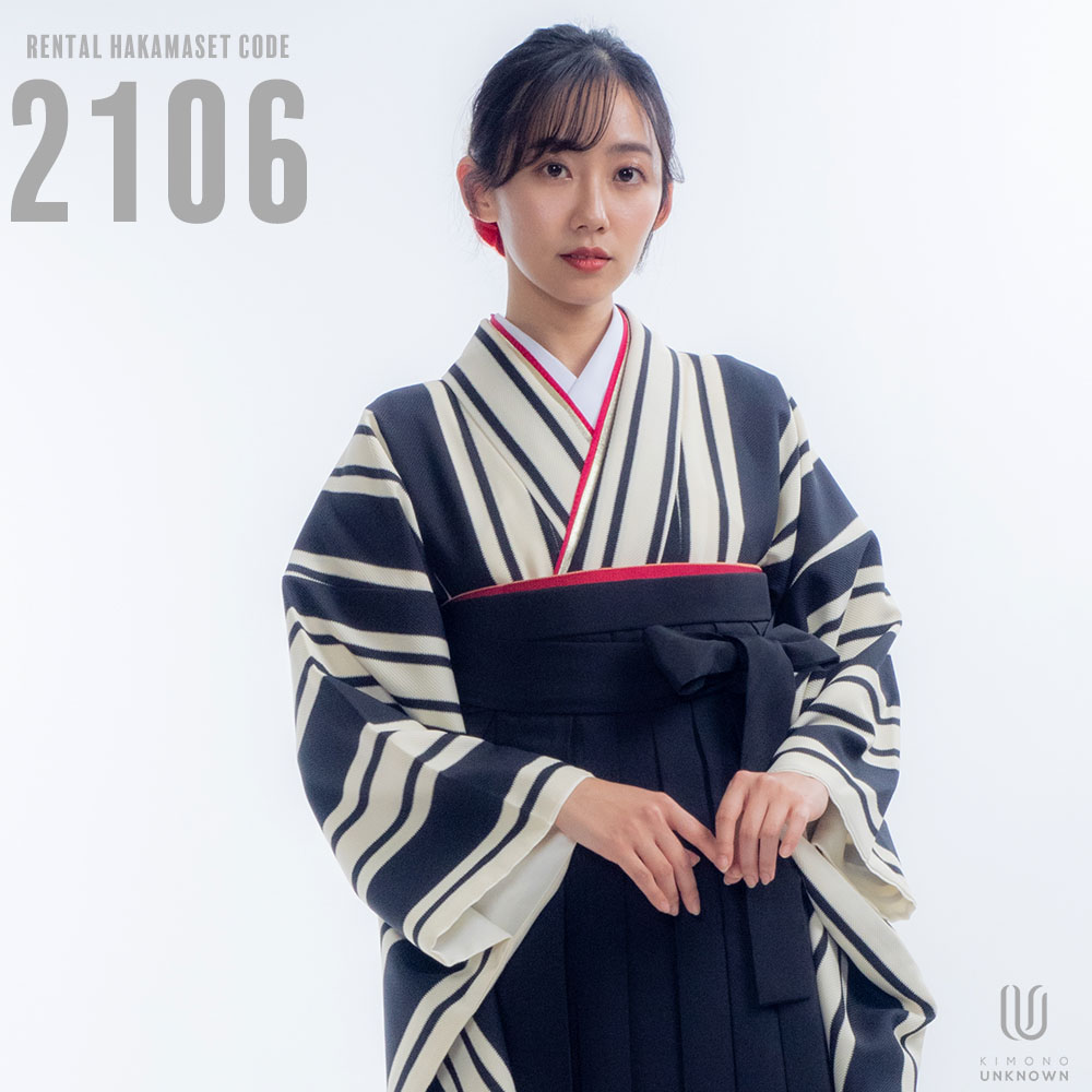 【対応身長 150cm~157cm】【レトロ】卒業式レンタル袴フルセット-2106【振袖タイプ】 夢助 ストライプ柄 モノトーン 無地袴 黒