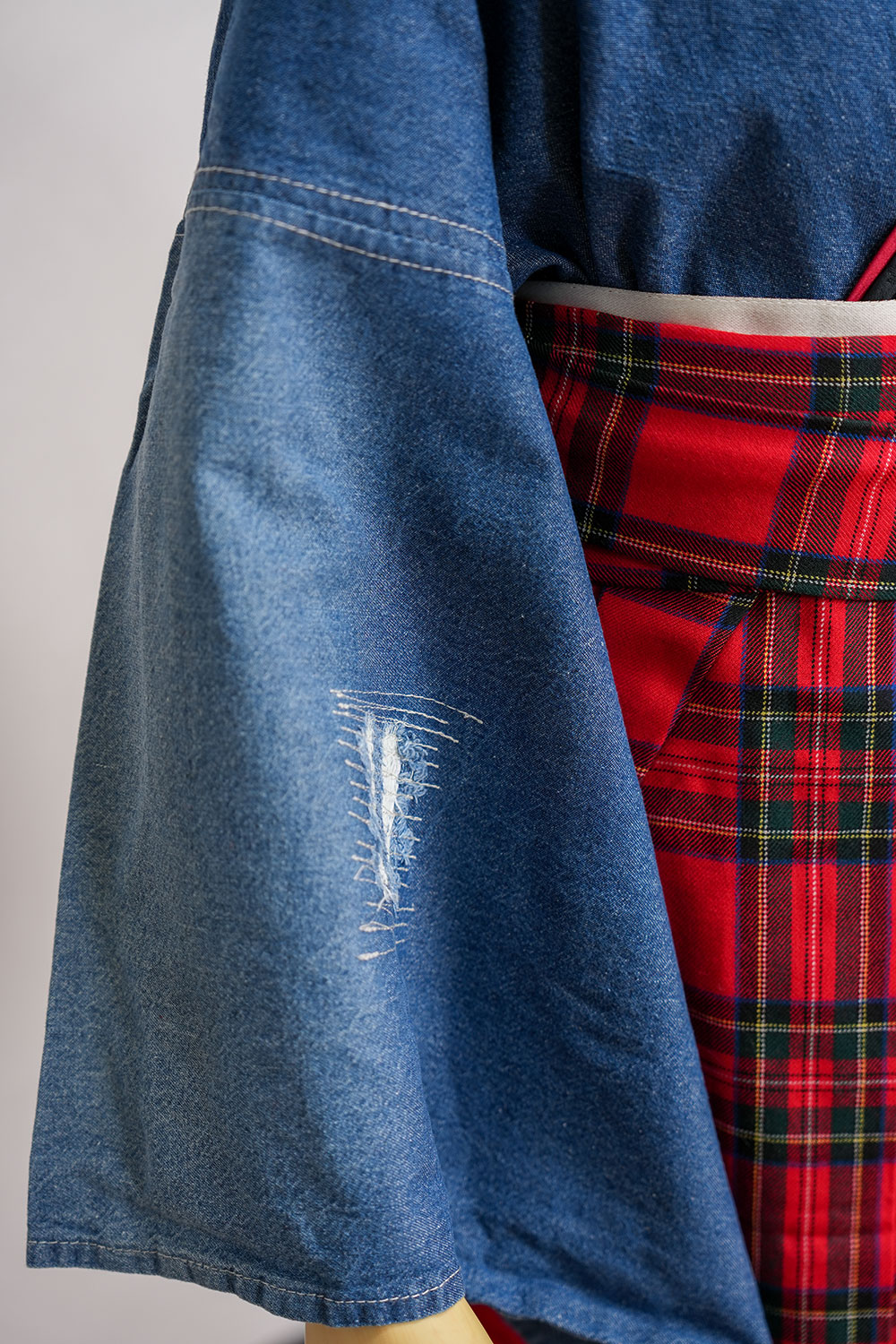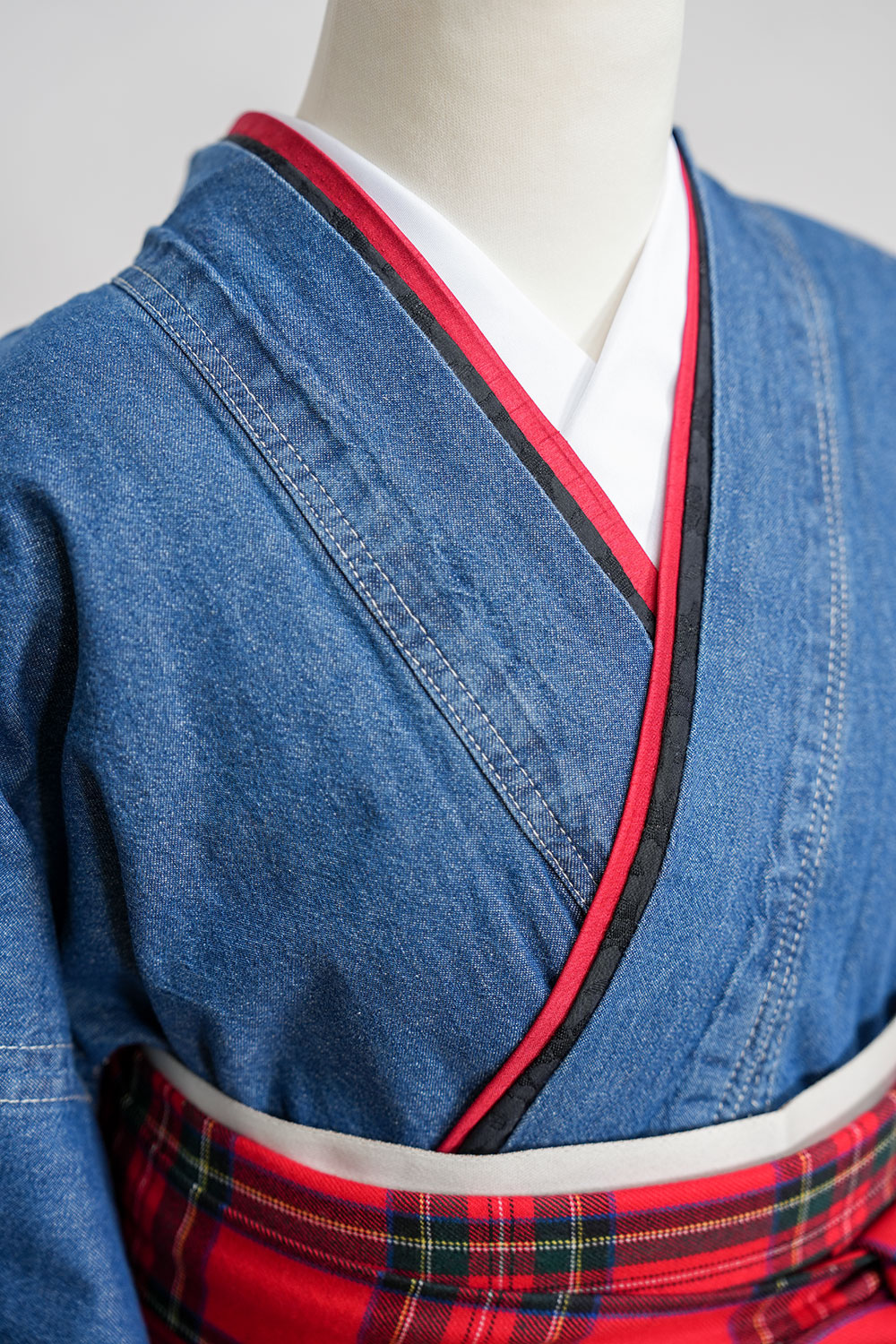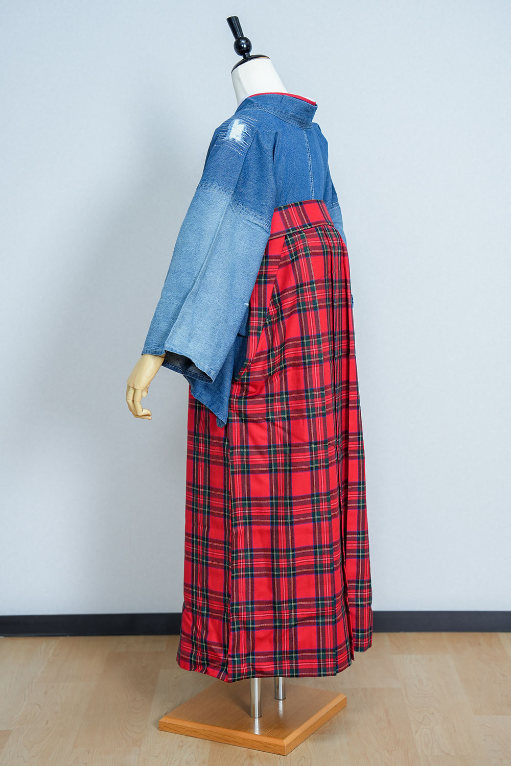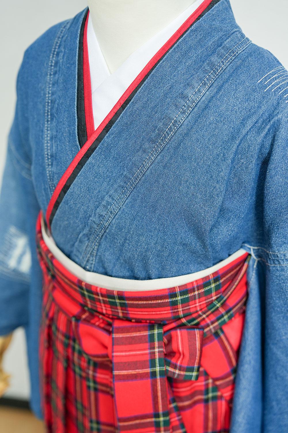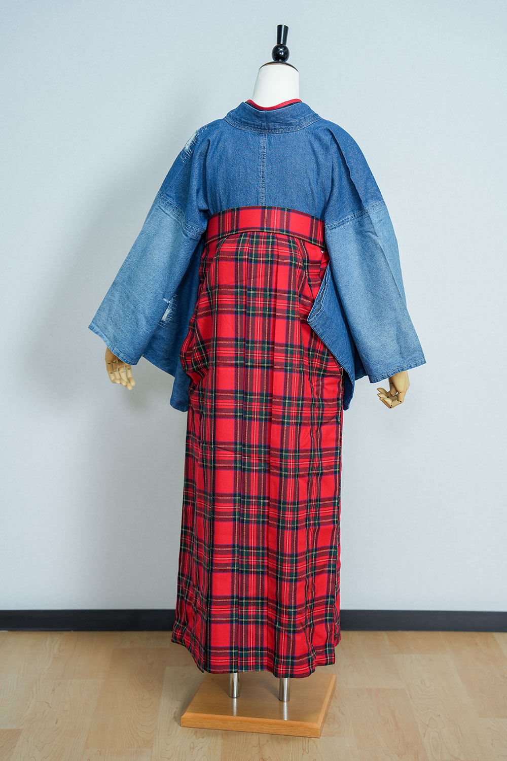 【対応身長 150cm~157cm】【キュート】卒業式レンタル袴フルセット-2109【デニム着物】 夢助 クラッシュデニム 夢助 チェック柄袴 赤 紺