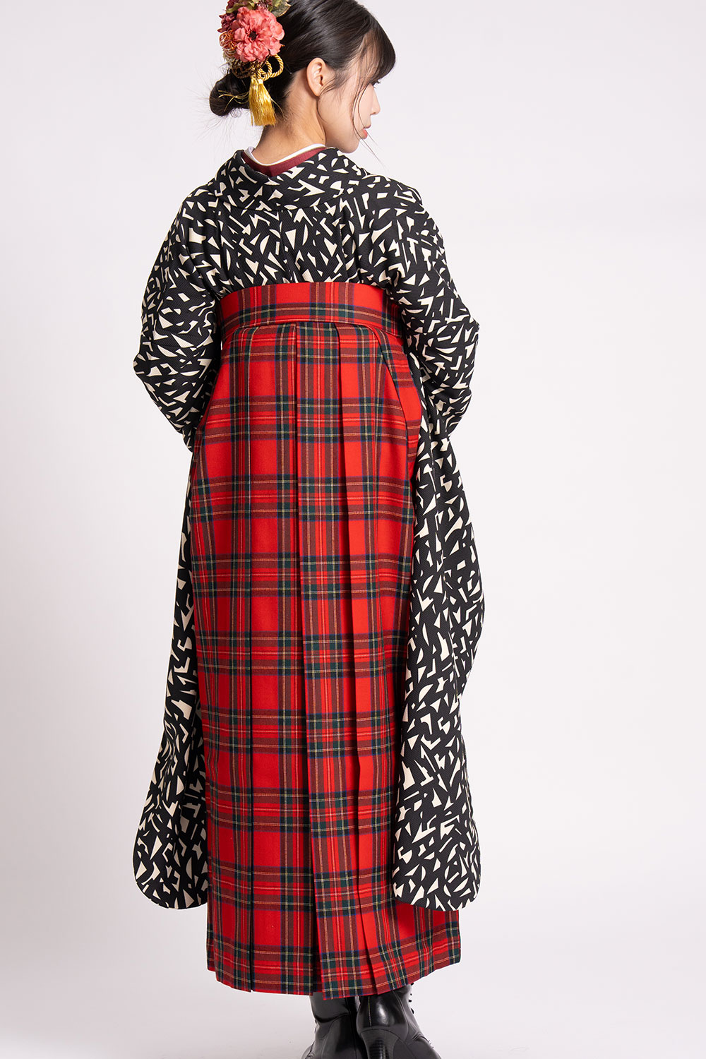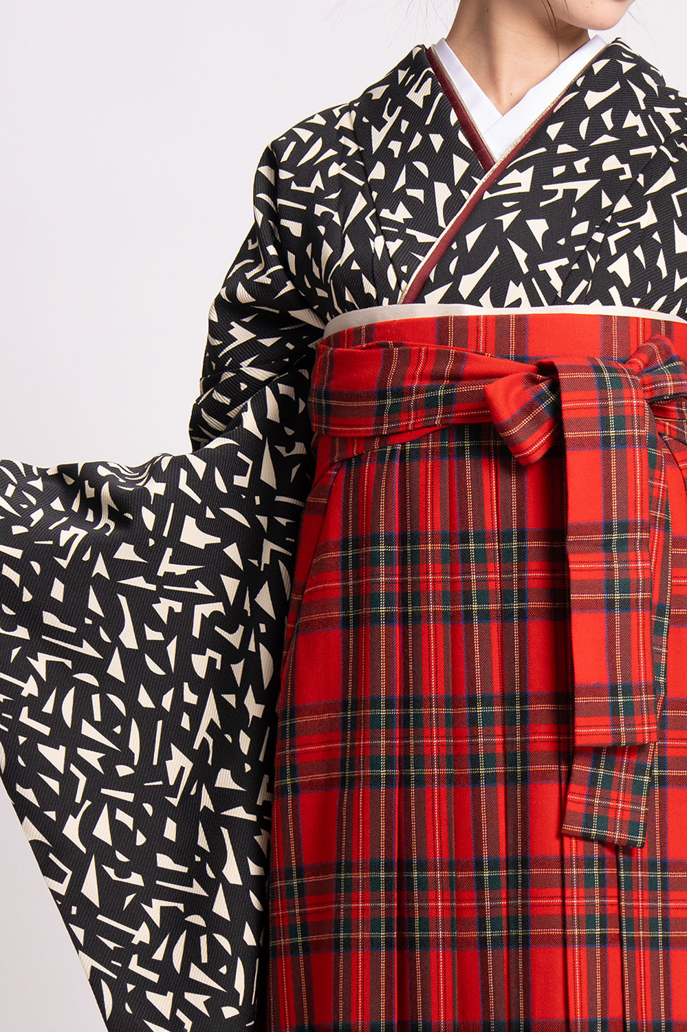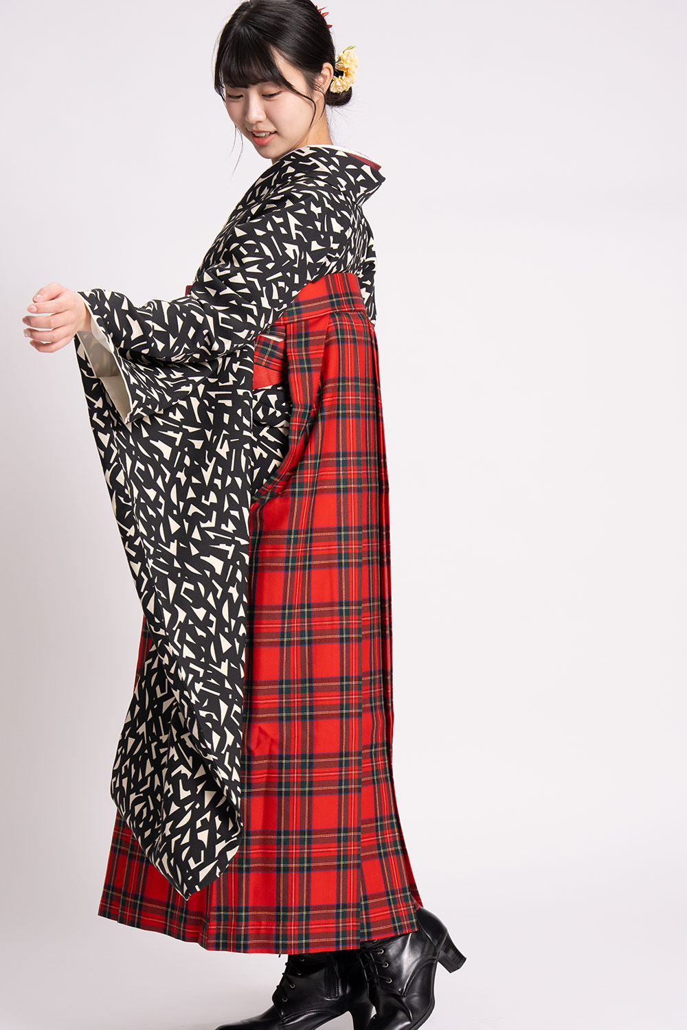 【対応身長 157cm~165cm】【キュート】卒業式レンタル袴フルセット-2122【振袖タイプ】 夢助 ジオメトリック柄着物 アイボリー地 夢助 チェック柄袴 赤 紺
