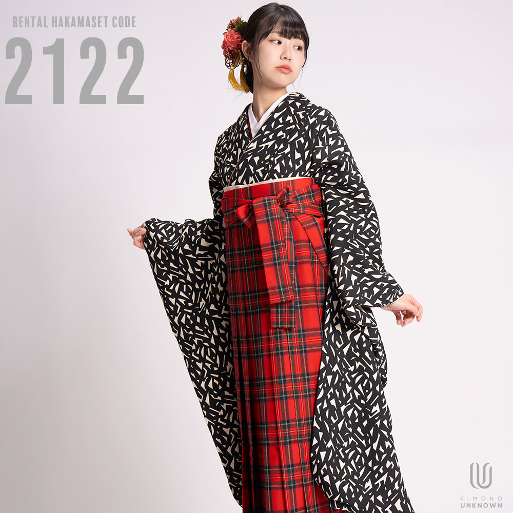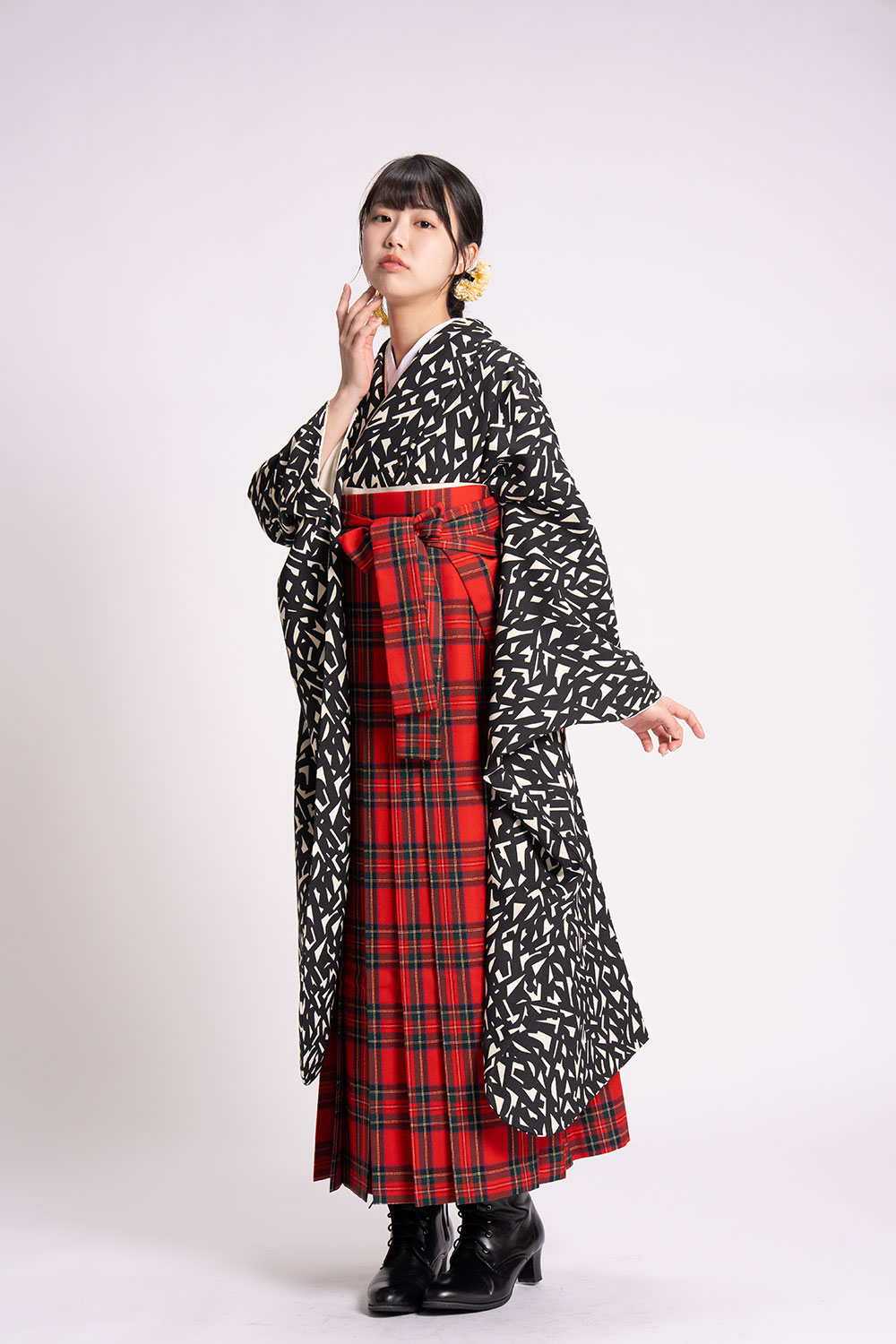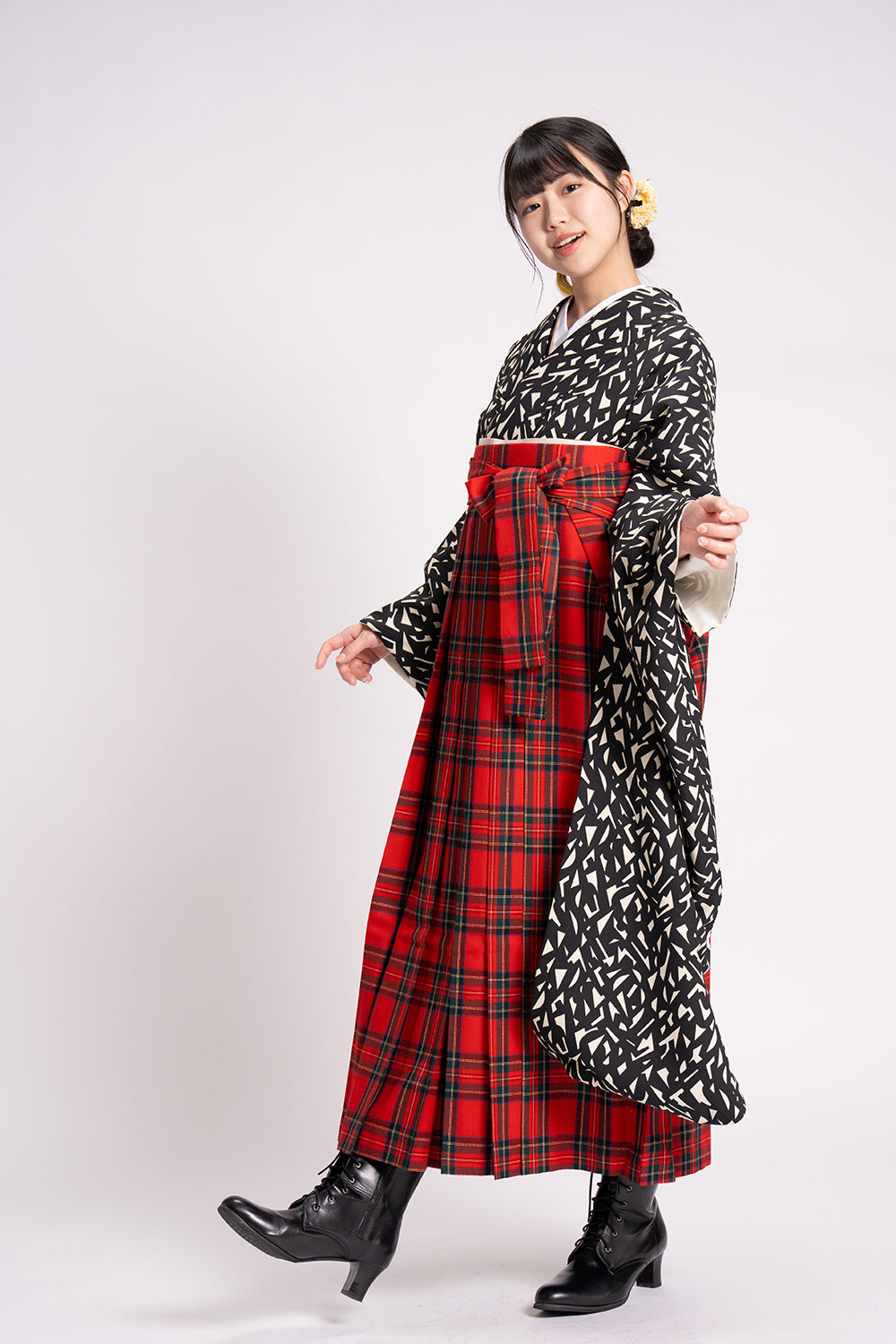 【対応身長 157cm~165cm】【キュート】卒業式レンタル袴フルセット-2122【振袖タイプ】 夢助 ジオメトリック柄着物 アイボリー地 夢助 チェック柄袴 赤 紺