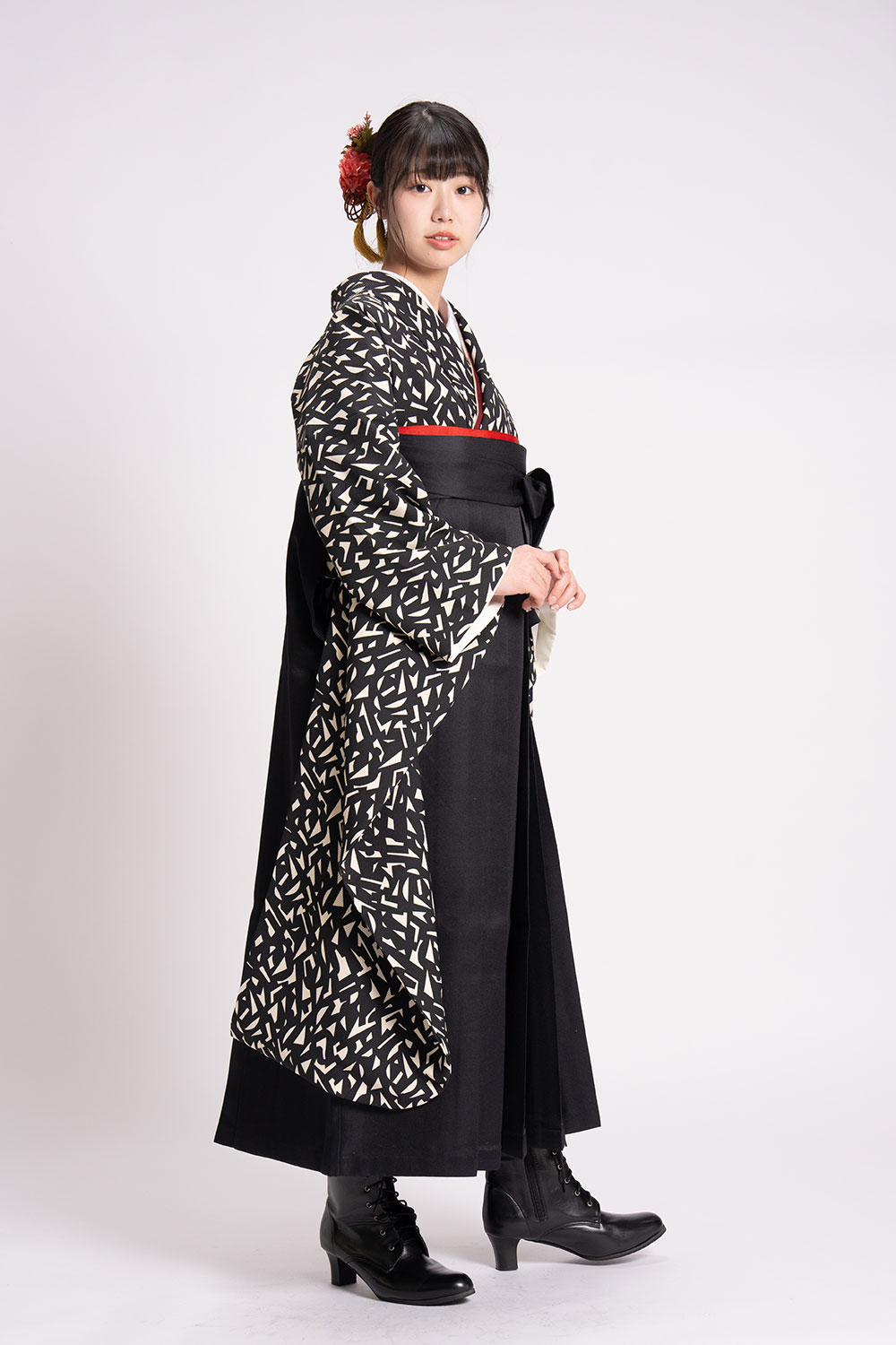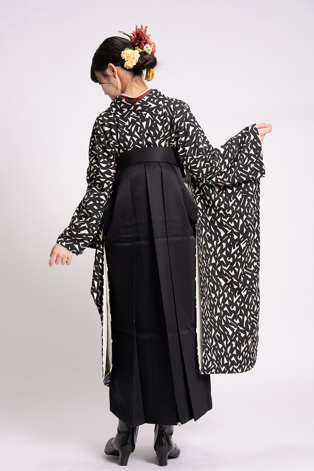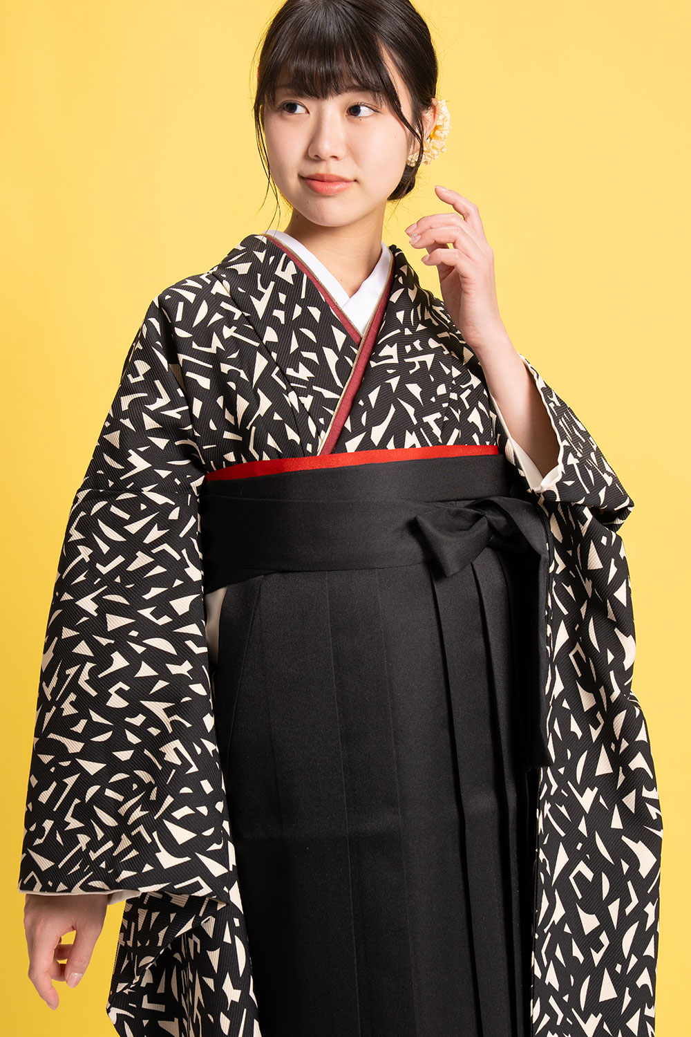 【対応身長 150cm~157cm】【キュート】卒業式レンタル袴フルセット-2142【振袖タイプ】 夢助 ジオメトリック柄着物 アイボリー地 黒無地袴