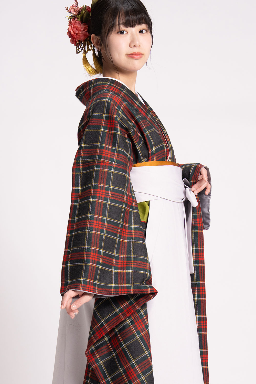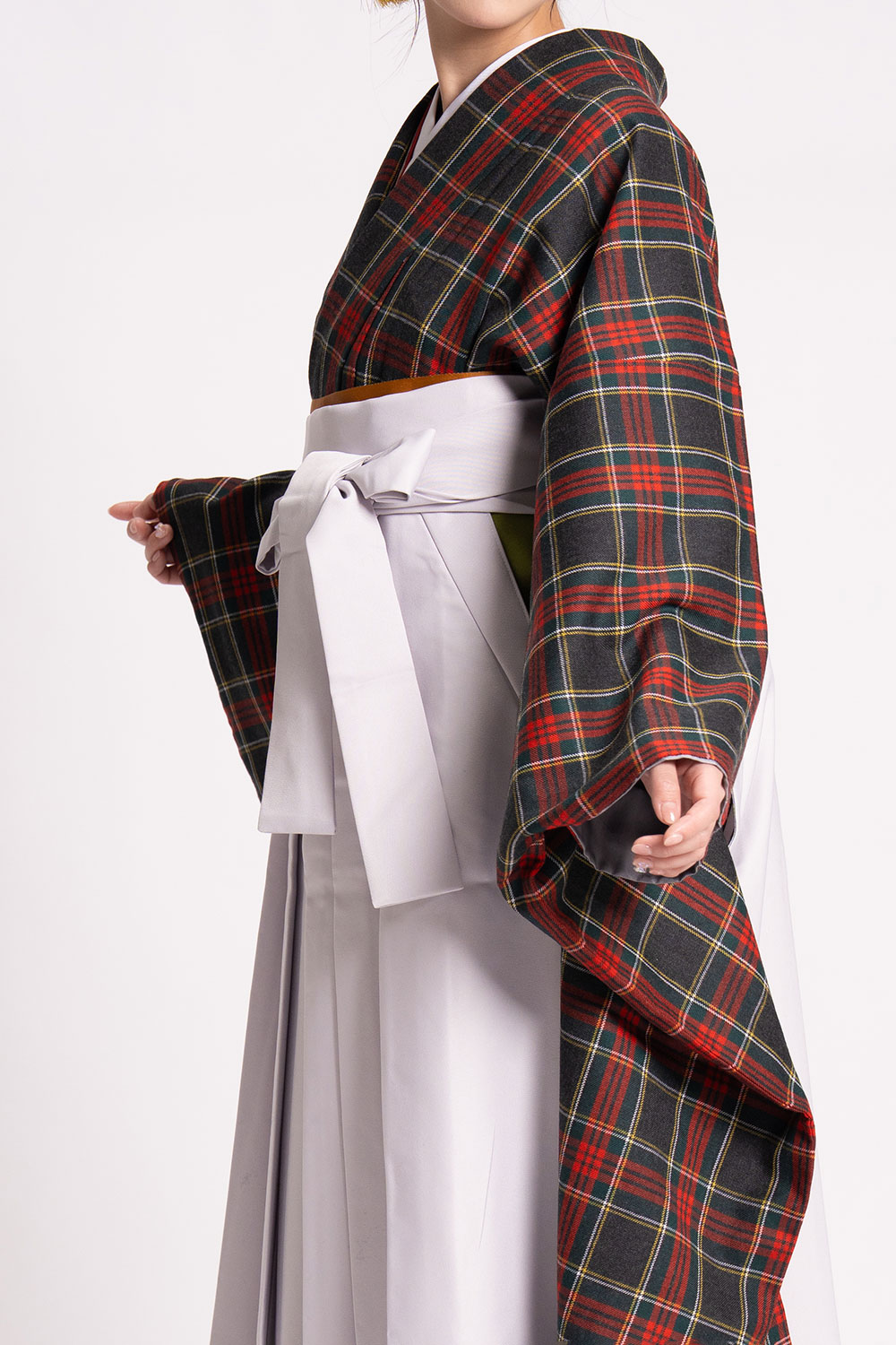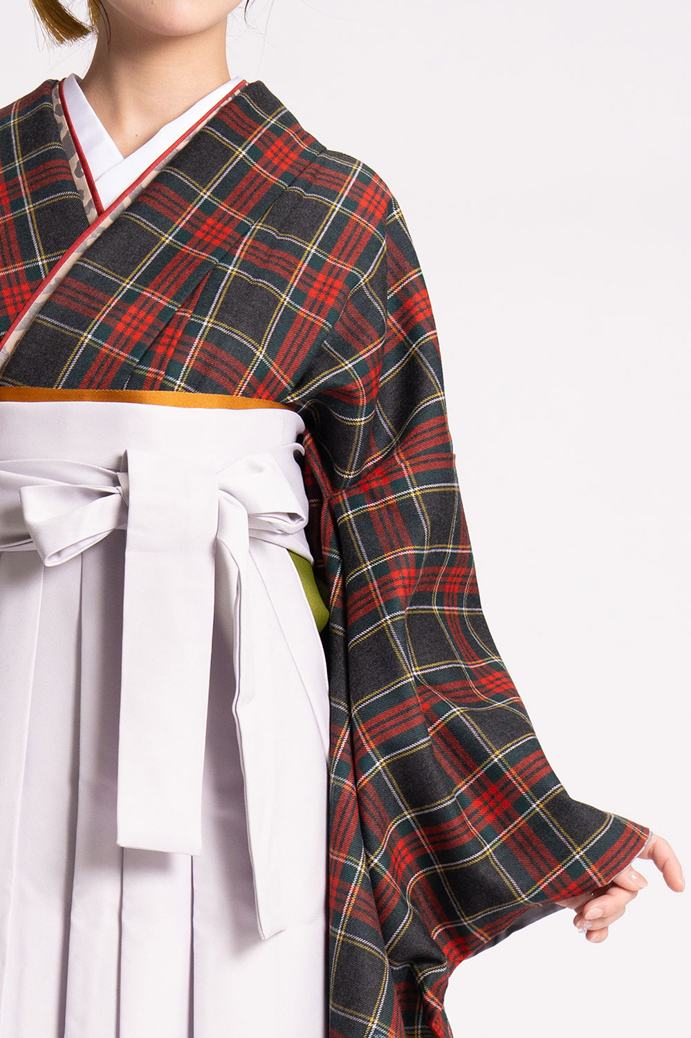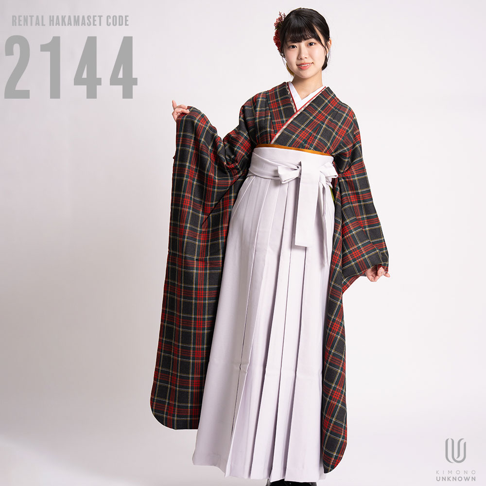 【対応身長 150cm~157cm】【キュート】卒業式レンタル袴フルセット-2144【振袖タイプ】 夢助 【振袖タイプ】 タータンチェック柄 ウール素材 グレー 無地袴 グレー